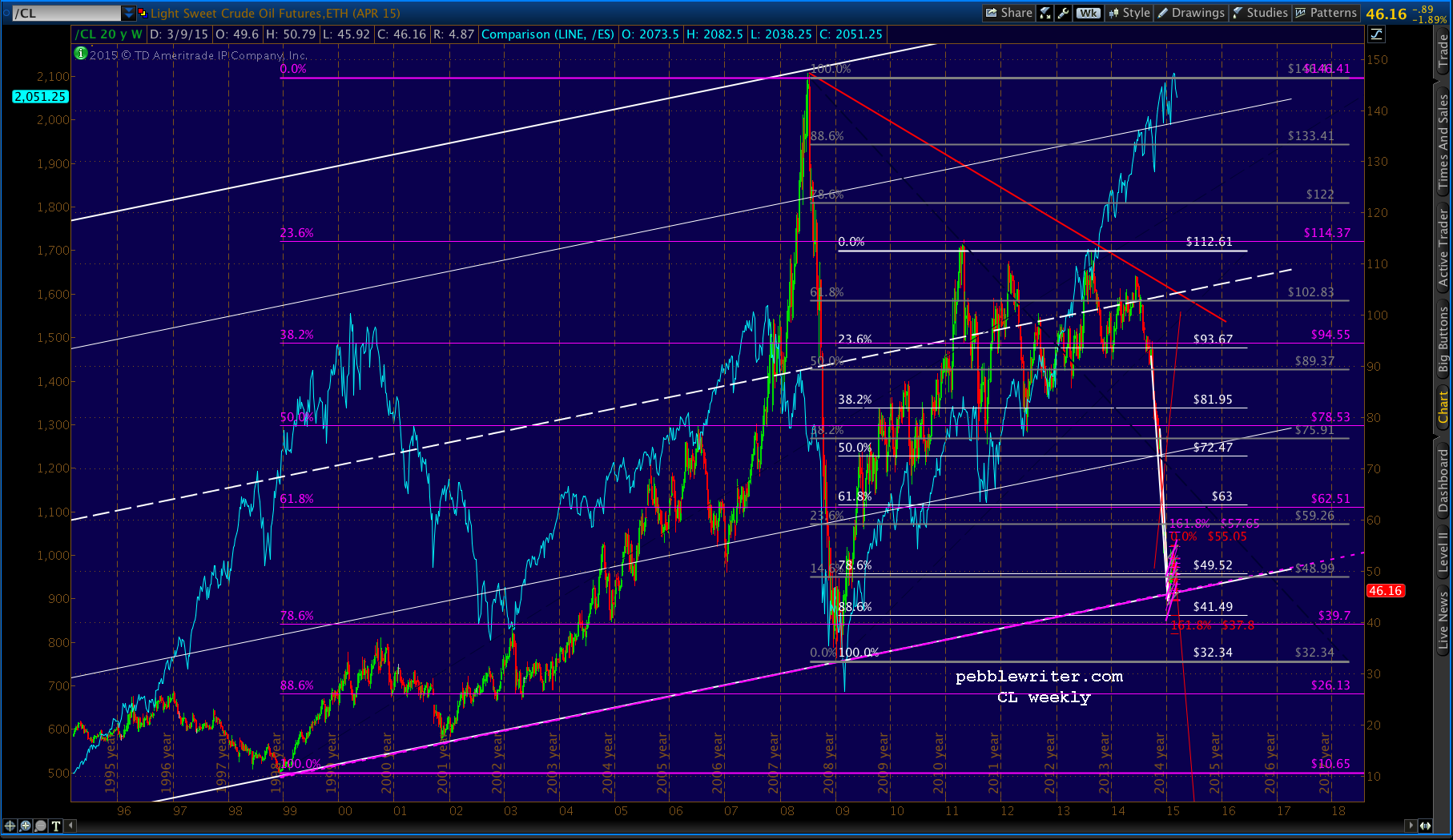 Note that the yellow target marks the TL from the 1998, 2001 and 2009 lows that stopped CL’s initial decline. So, it should stabilize, if not rally, from this point.