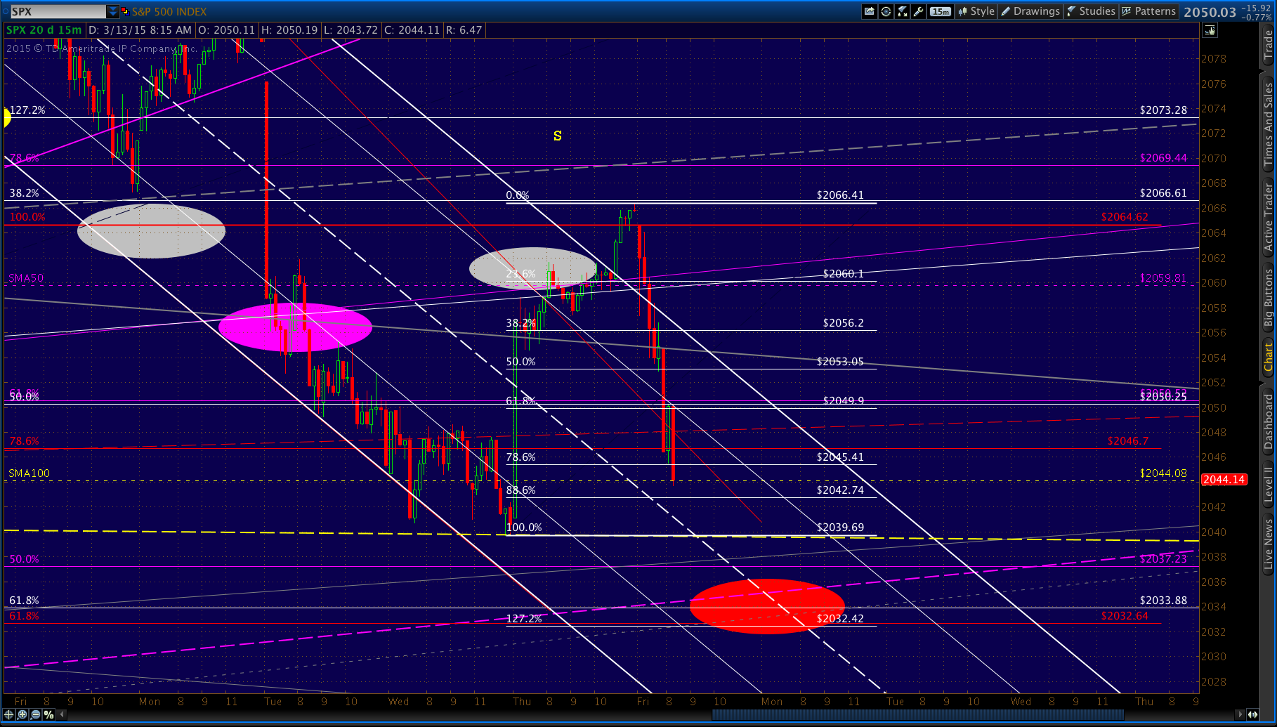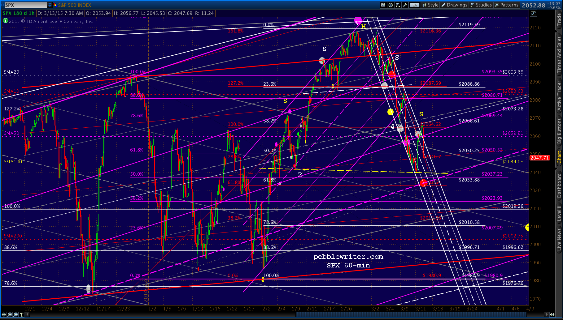 But, since the .618 and purple channel midline are just below at 2033, TPTB will have some help in preventing it. The downside scenario for the day shifts slightly to either a close at the SMA100, or a drop through it to 2033 and bounce back to the SMA100.