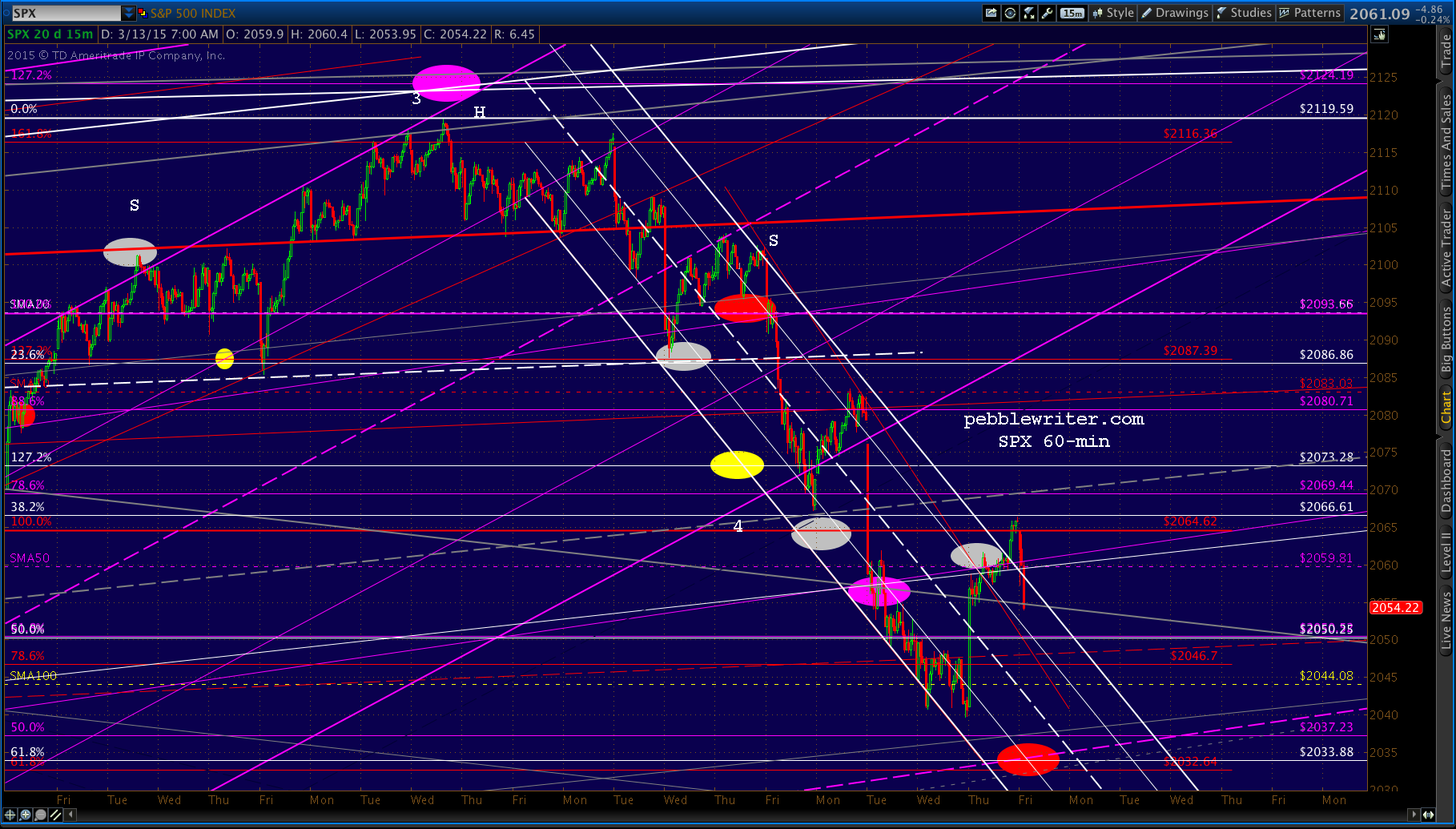 The troublemaker scenarios are: (1) a close at 2033 — with a completed H&S Pattern that can then be erased over the weekend; or, (2) a bounce off the SMA100 that shifts bears out of shorts, but which is followed by a plunge to 2033 set up by weekend action.