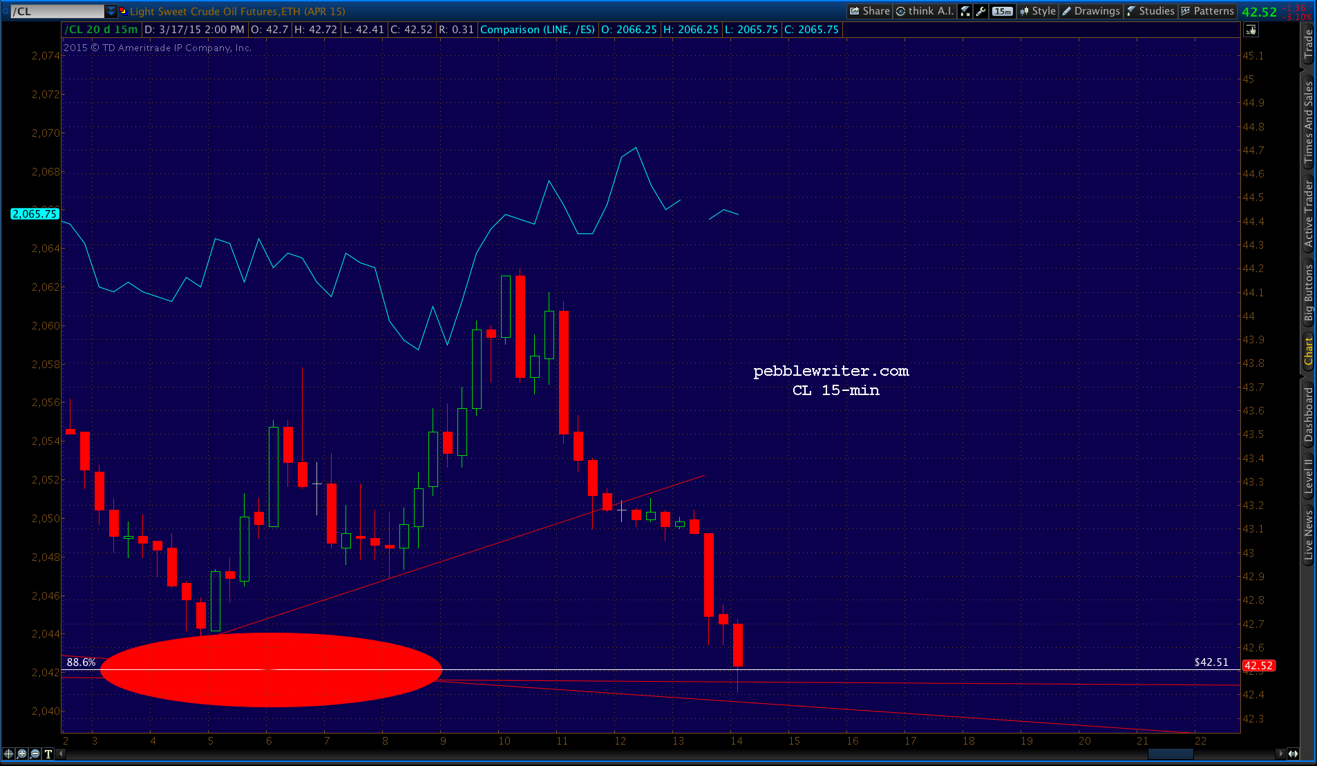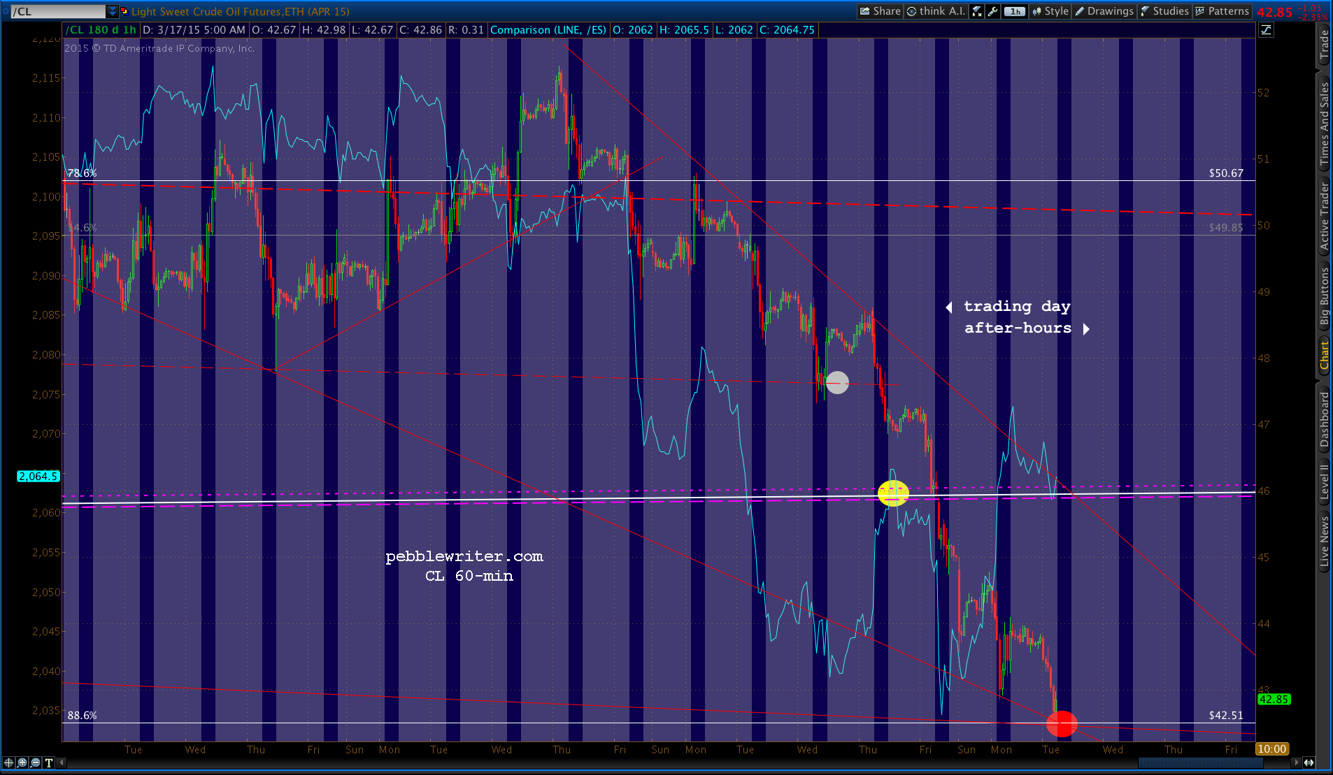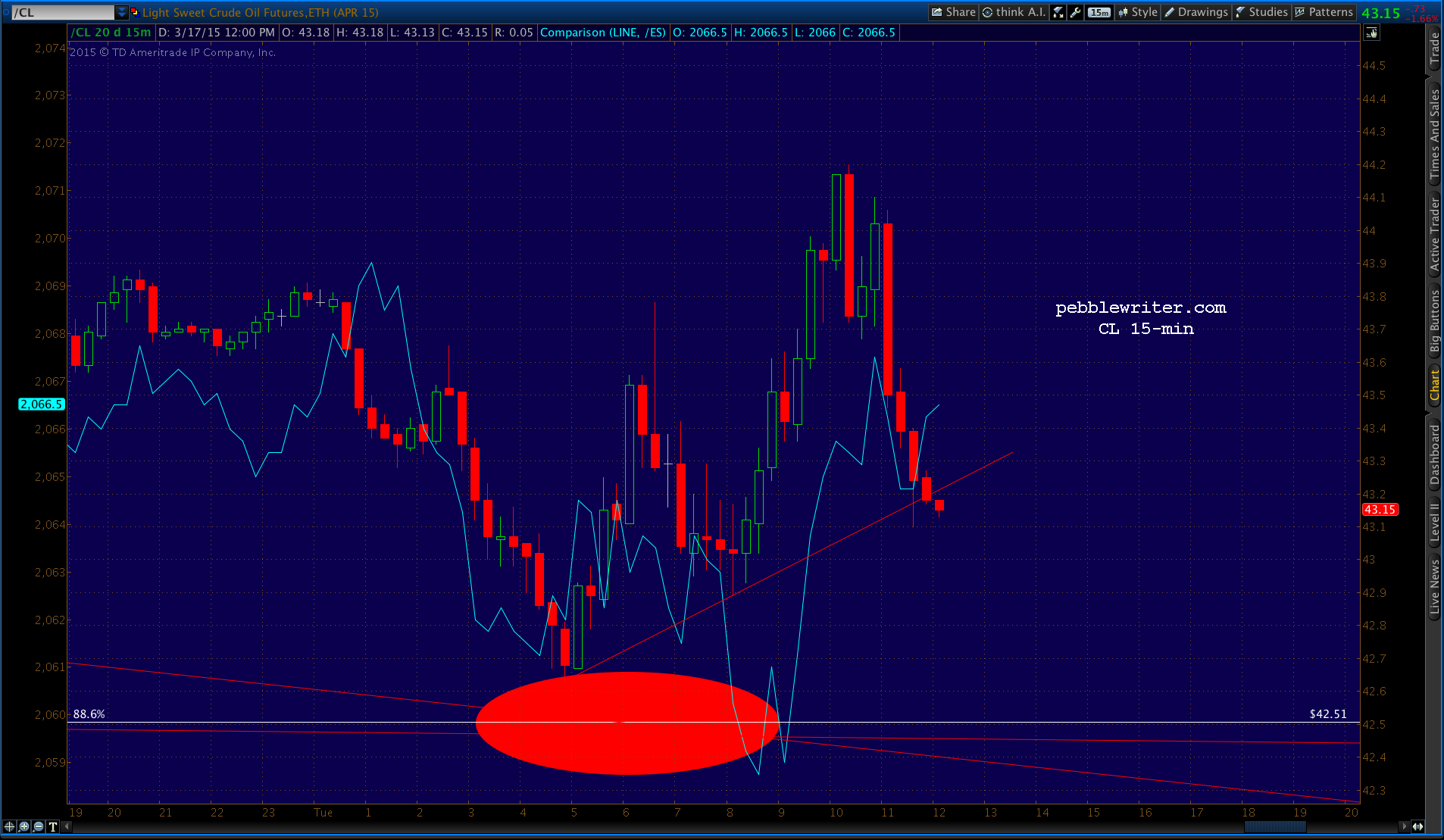 …as CL dips below the TL off this morning’s lows. With an hour to go, will we have a repeat of yesterday’s ramp job transitioning into an after-hours reset? Or, maybe a breakdown in the final hour to actually tag 42.51? Stay tuned.