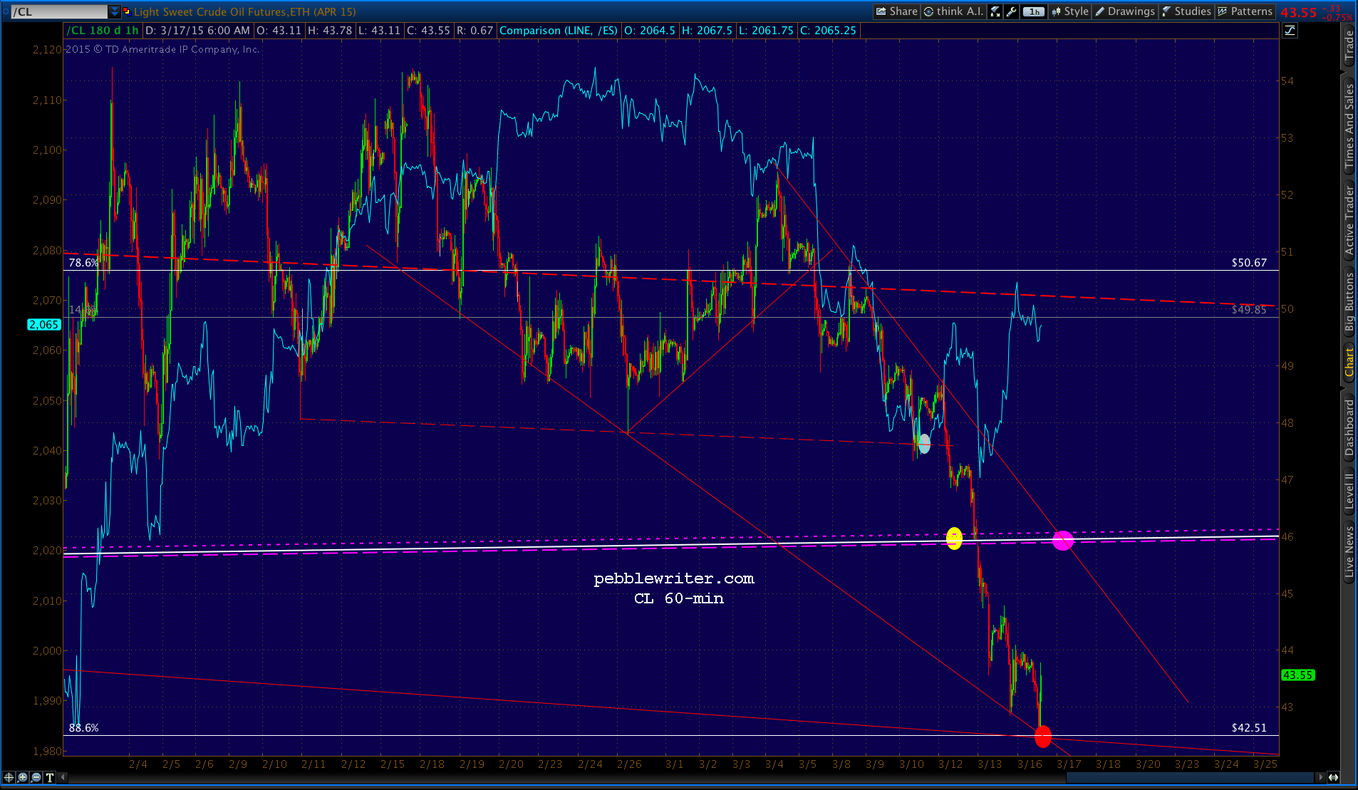 The bounce has begun, even though CL came up a few cents shy of 42.51. Stops are advised, as a premature bounce sometimes means one last leg down.