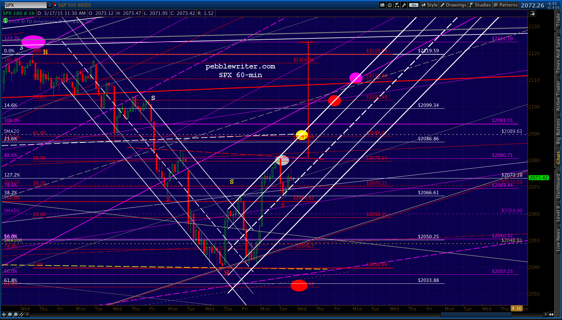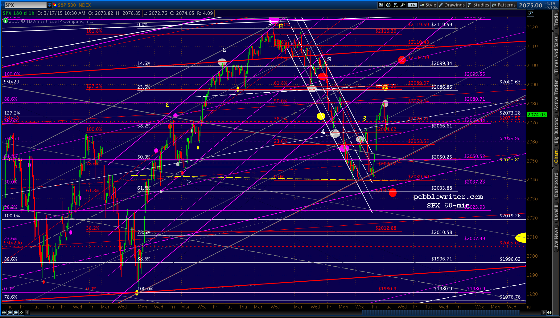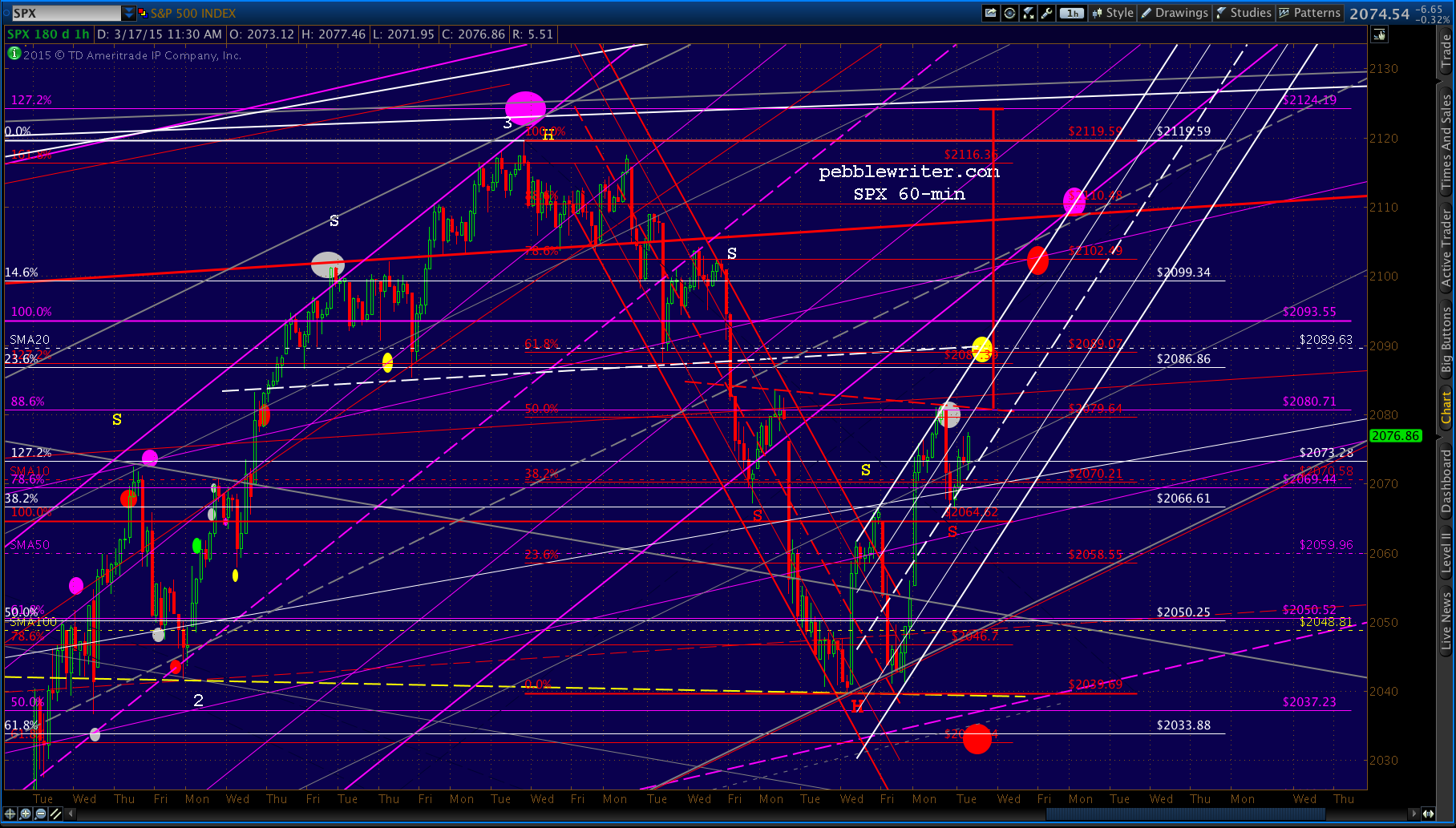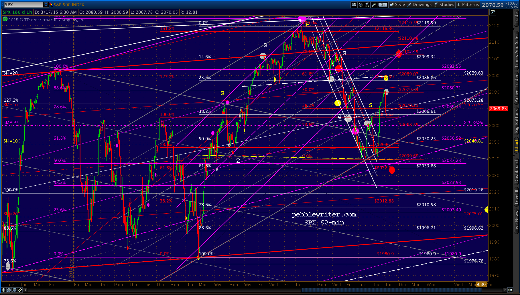 In light of this development, it’s worth noting that SPX is 7 points away from completing an IH&S (at 2080.80) that targets 2124.14. If that’s the next stop, the rising white channel below would reach the yellow dot tomorrow morning and the red dot Friday morning. The purple dot looks more like Monday morning.