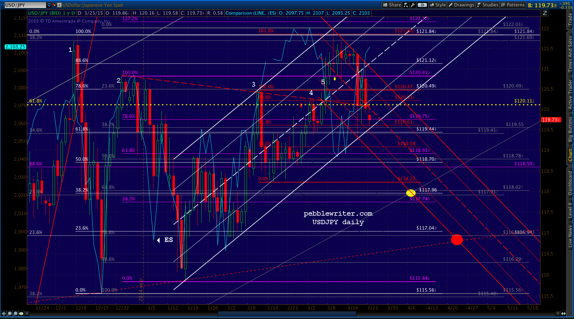 USDJPY is back below the important .618 Fib line at 120.11. And, it’s back below the TL from Dec 23 (point #2.) The well-defined rising white channel is being tested for the 6th time since mid-December.