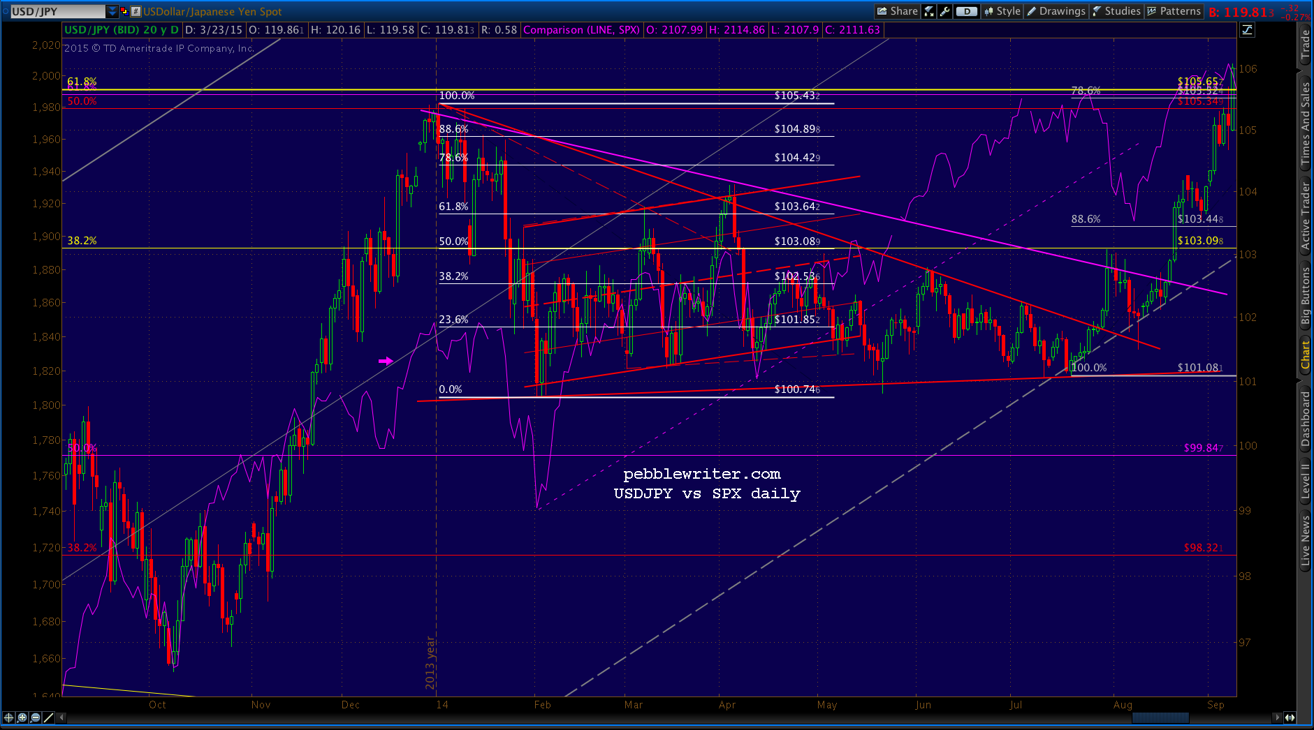 And, most will remember the 2014 triangle (red arrow) in the months after USDJPY single-handedly levered SPX up past the Butterfly Pattern completion at 1823 (purple arrow.)