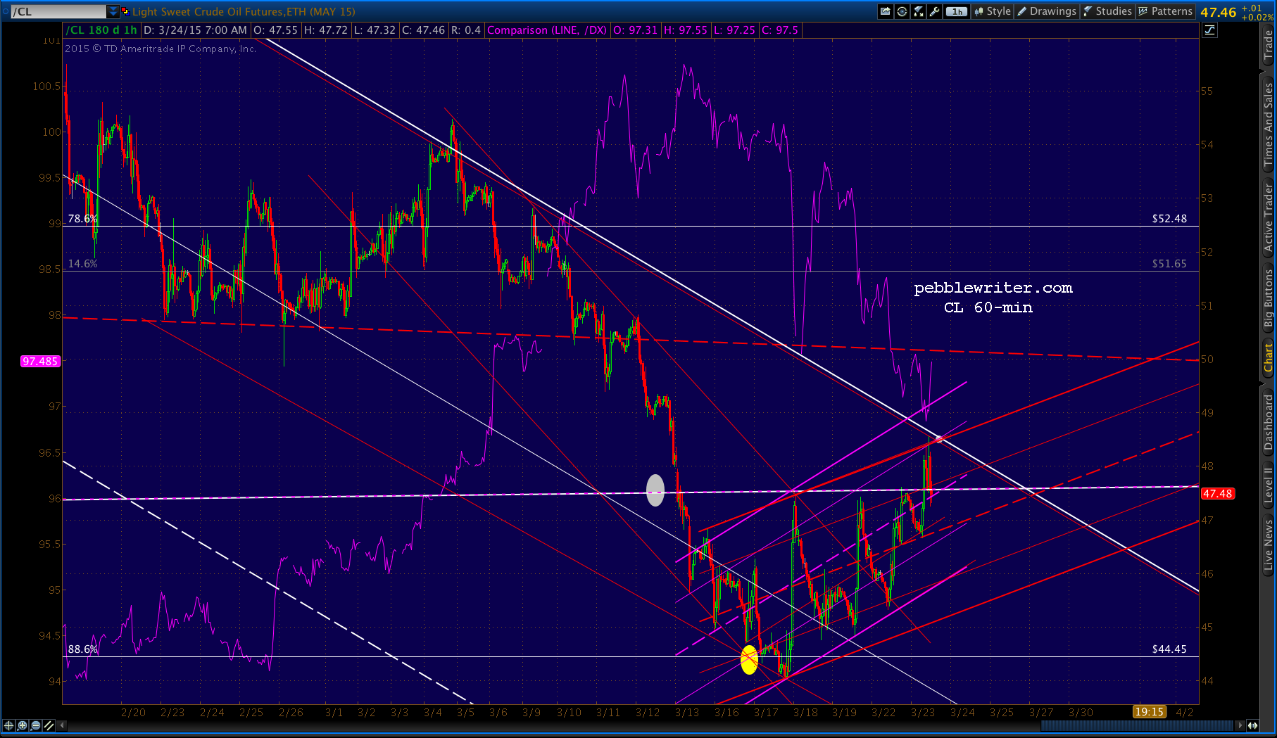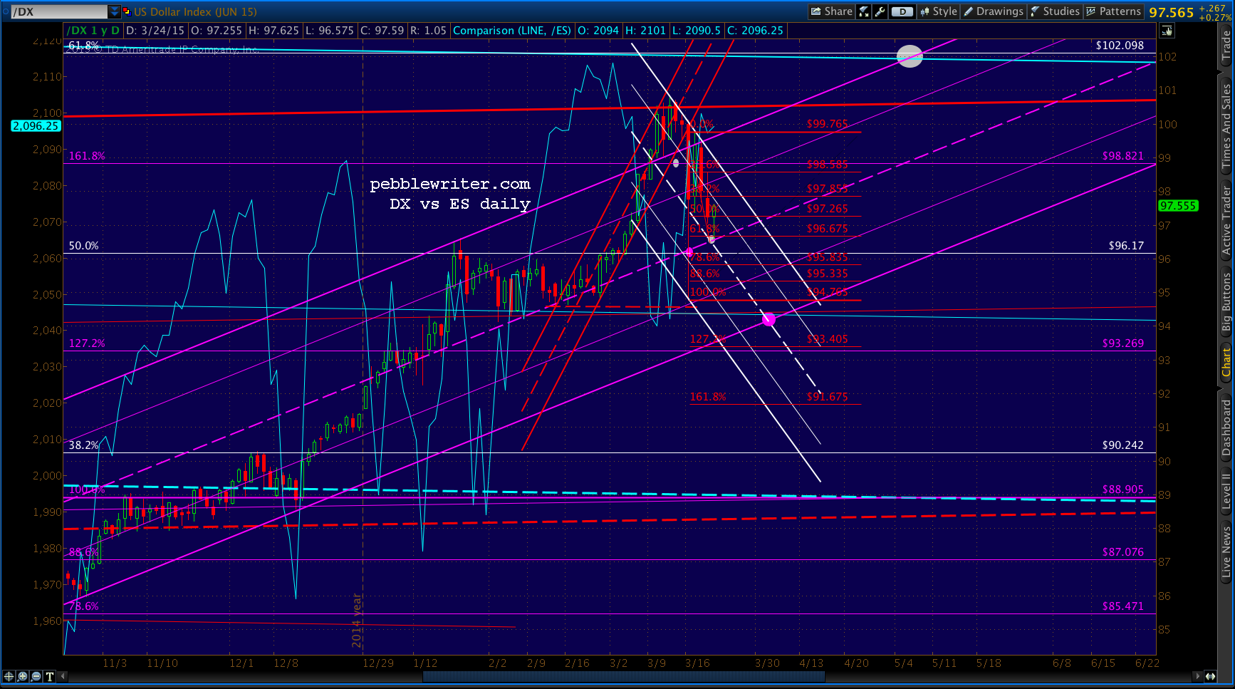 And, some food for thought on the dollar and overall timing. If CL trends lower over the next several days, the dollar should continue rising. The rising purple channel crosses our next major upside target — the .618 at 102.098 — in early May.
