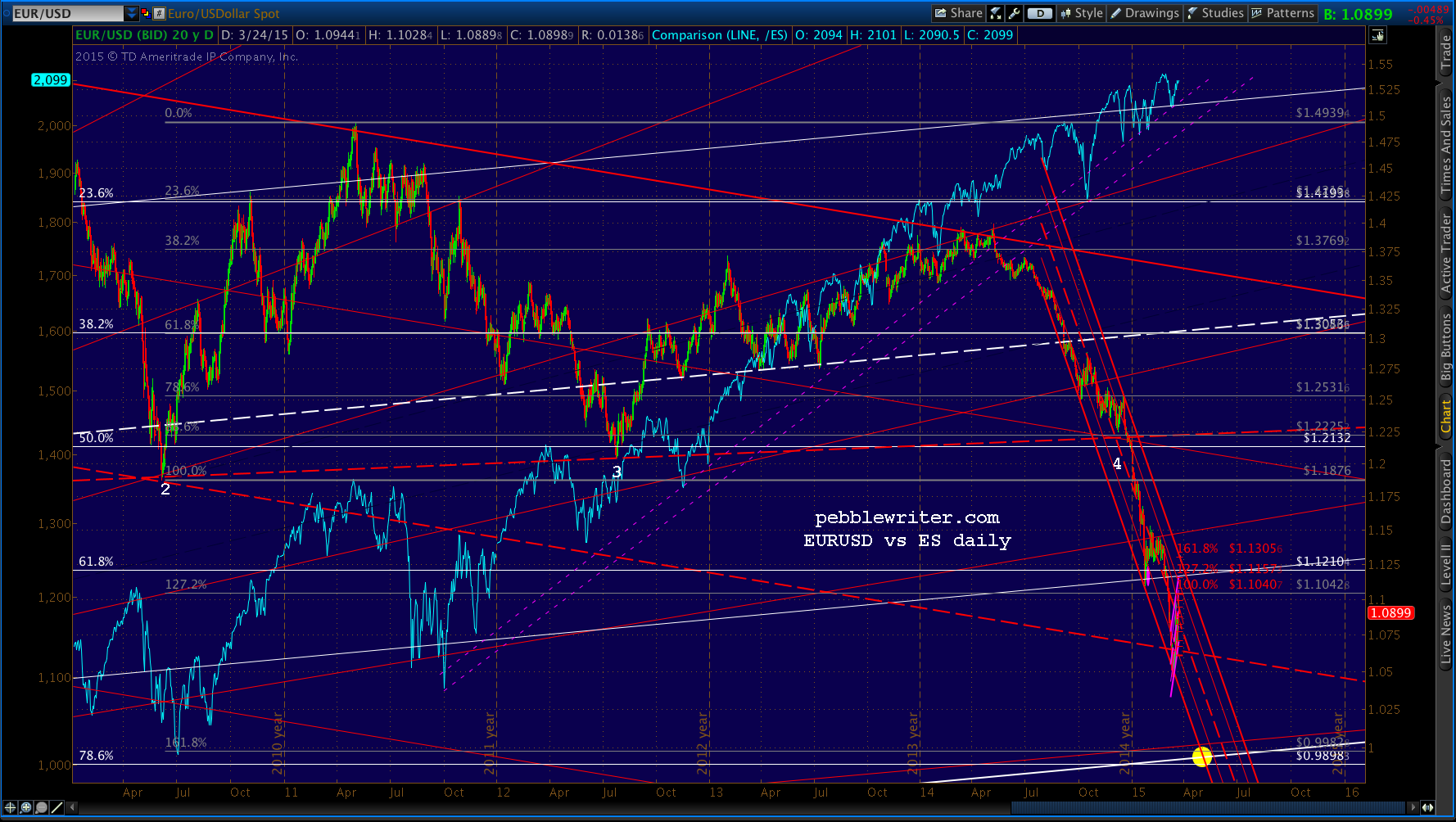The downside target would have to be the bottom of the purple channel — which intersects with an important channel line around Apr 6 — the Monday following the Good Friday holiday.