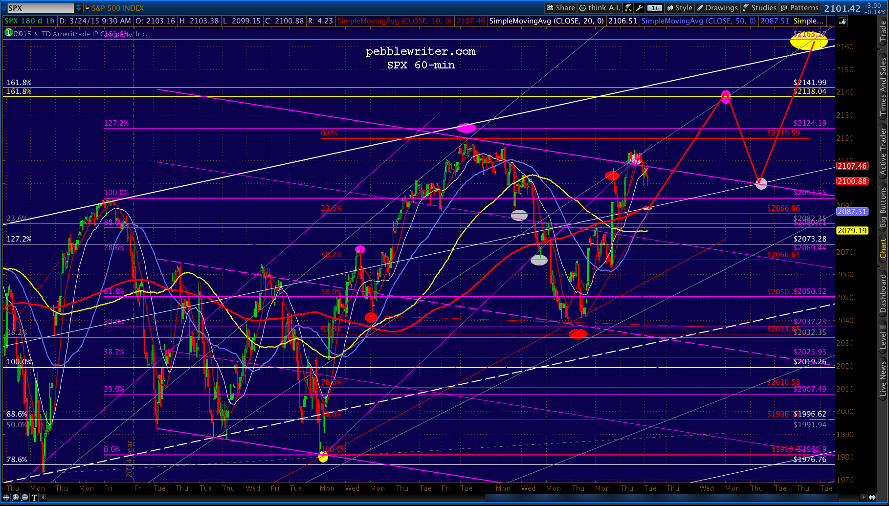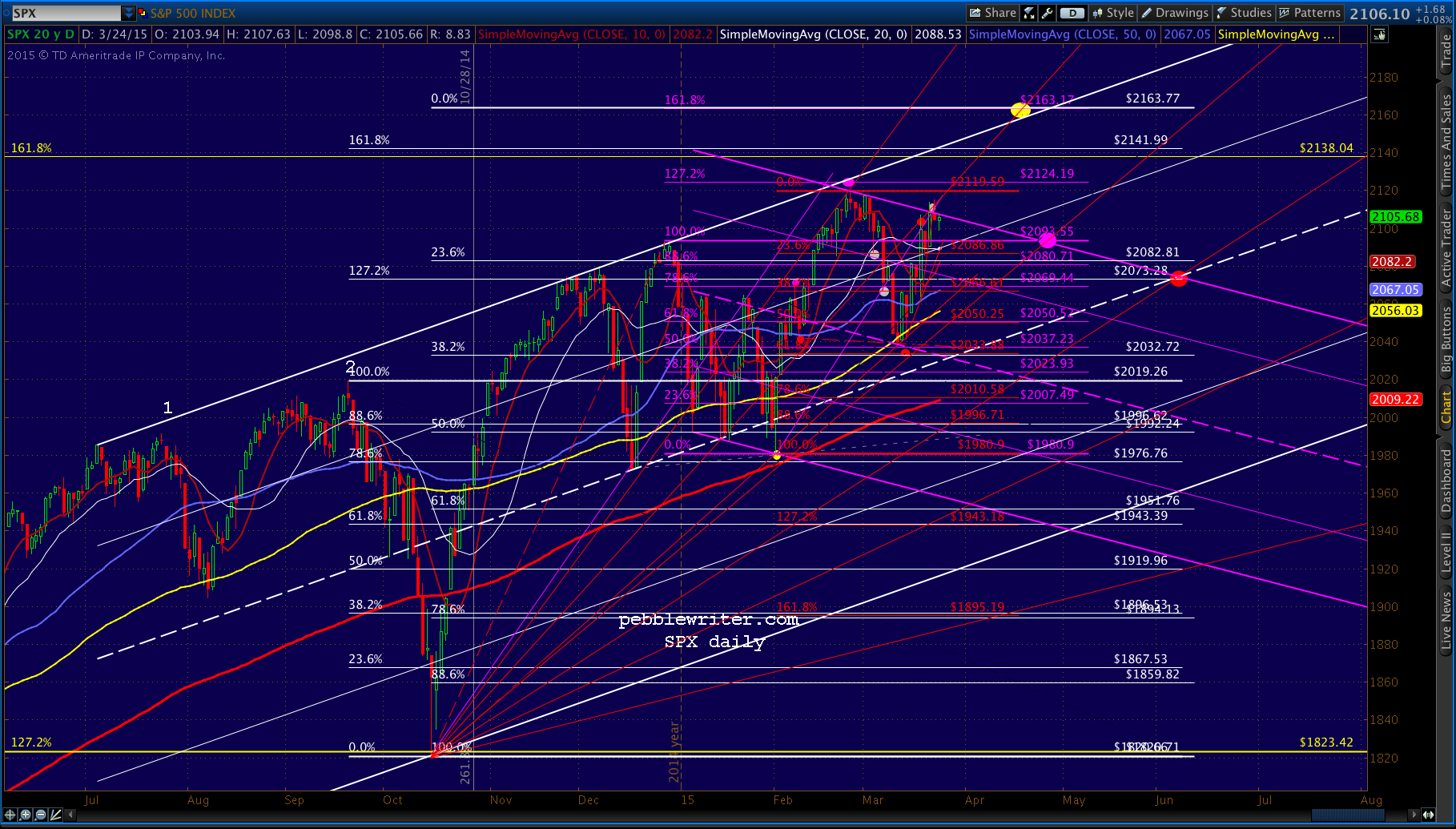 Just for grins, we’ll watch for signs that this pattern might play out: sideways or a moderate decline for the next several days, followed by CL breaking out of the falling white channel over the coming holiday weekend which drives stocks through 2119.59 and on to its next highs by around Apr 20.