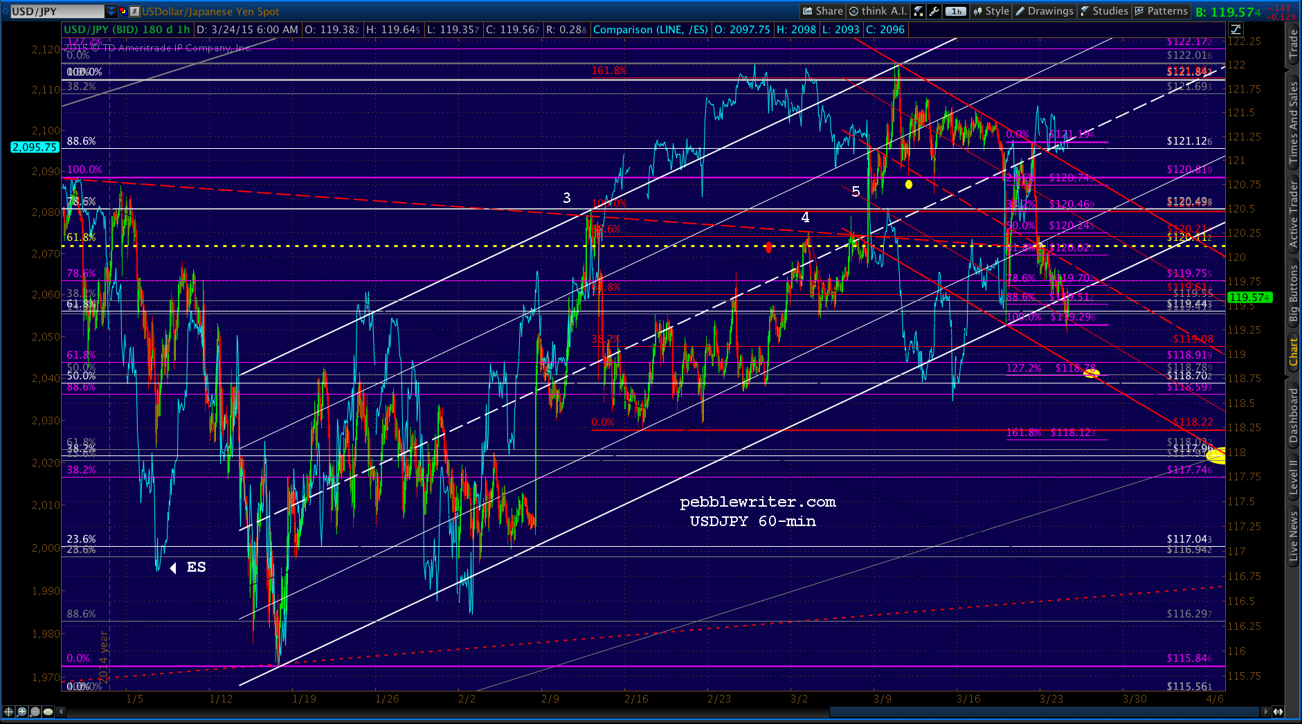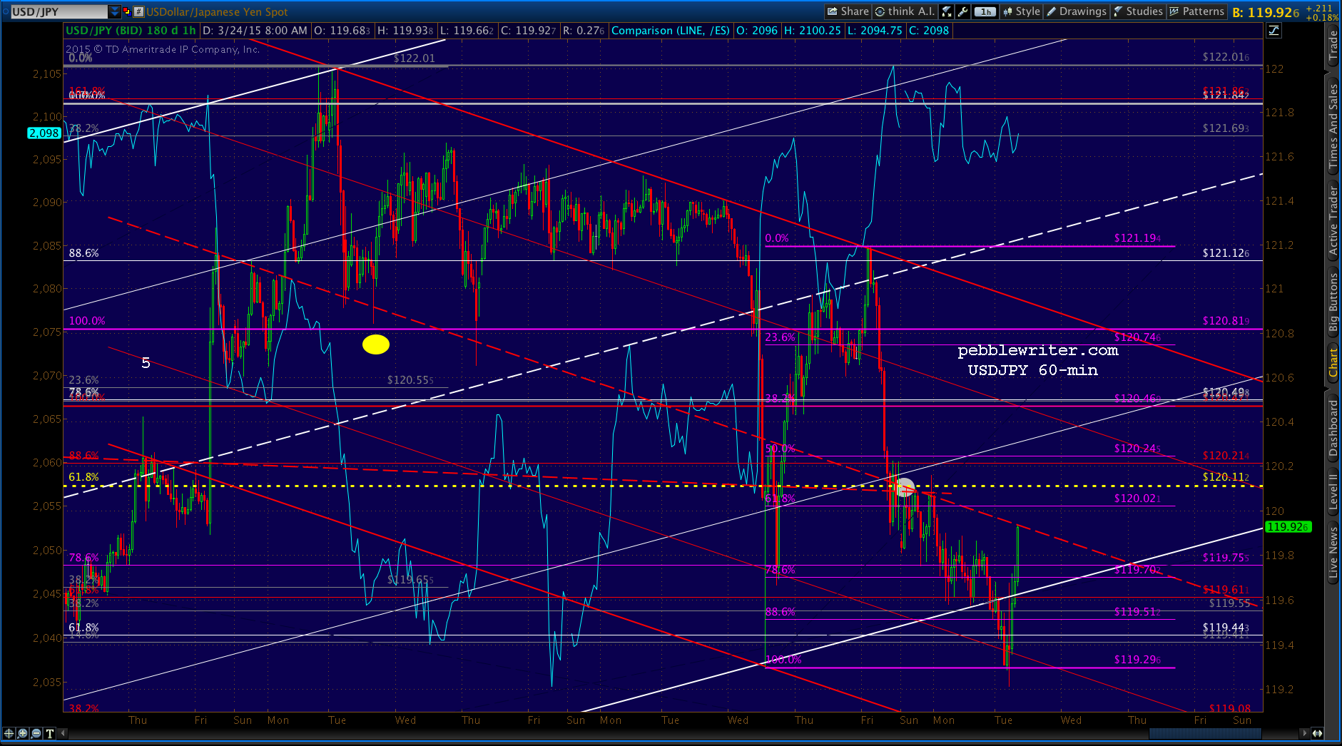It will also stretch the timing out a bit as we discussed yesterday. But, again, it’s important to keep an eye on USDJPY. It’s not unusual for it to briefly dip above or below recognized support/resistance in order to bludgeon ES in one direction or another to reach a selected target — only to bounce back into charting compliance a moment later.