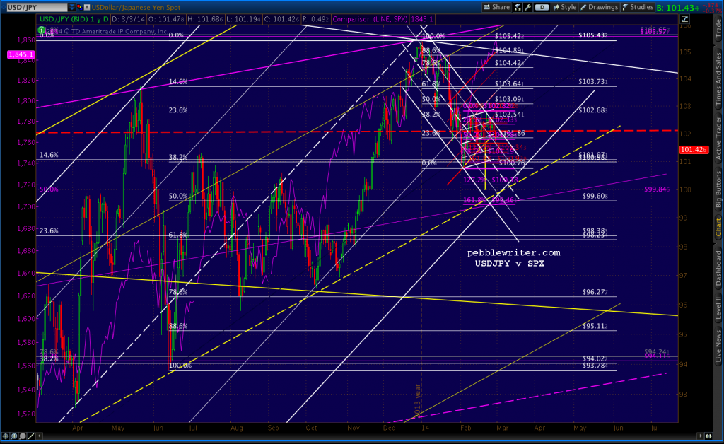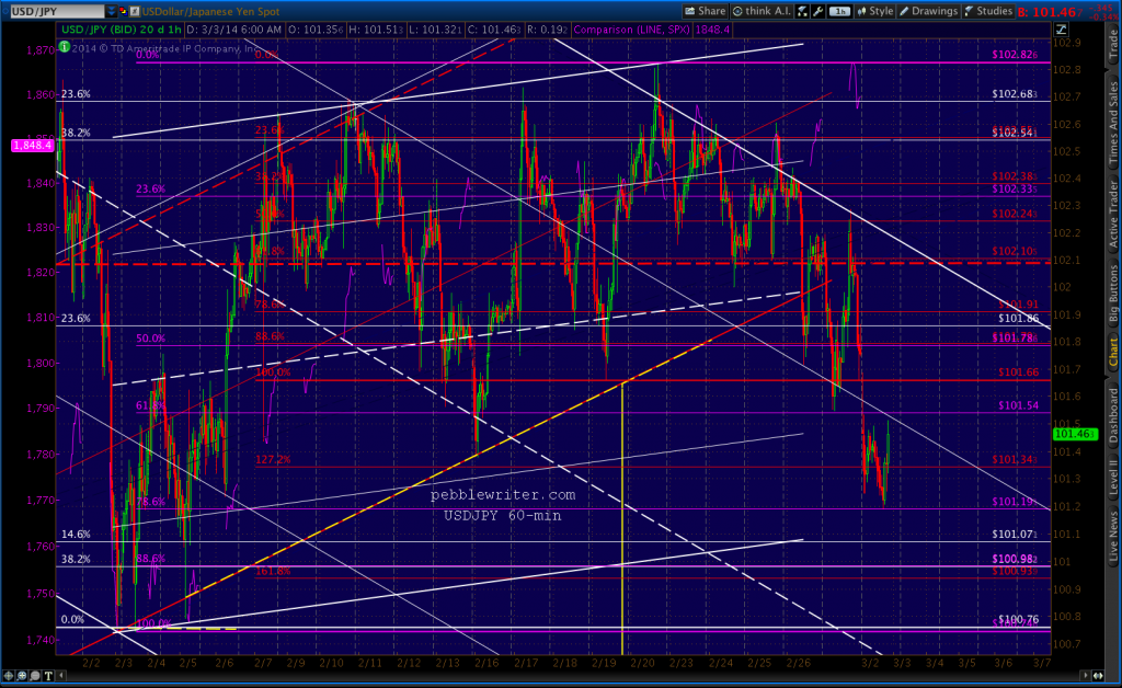 USDJPY has retraced .786 of its bounce off 100.76, completing a Gartley Pattern. A decent bounce will will set up the yellow channel midline tag we’ve been discussing at the purple 1.272 for a Butterfly Pattern completion at 100.18.