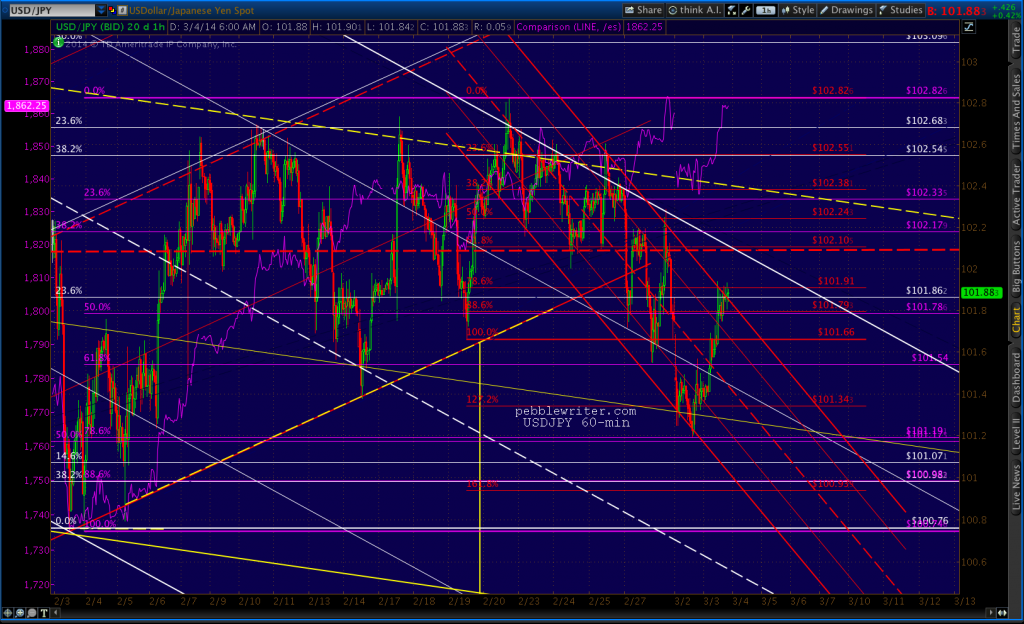 The bounce at the purple .786 we discussed yesterday is pretty much exactly the same as at the .618. If the falling red channel fails, the intersection of the red TL and white channel top (at the red .618: 102.10ish) looks like the next resistance. 102.20 would be a .618 retrace from the Feb 21 highs.