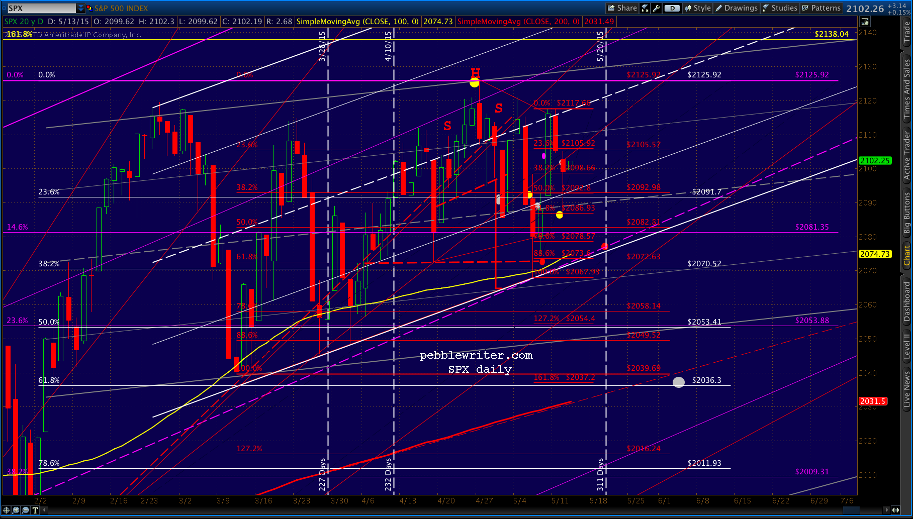 Our forecast remains for lower prices with a tag of the red .886 at 2073 most likely. If the purple channel midline breaks down, then the white .618 at 2036 starts to look like a real possibility — especially around May 20-22.
