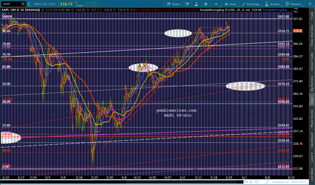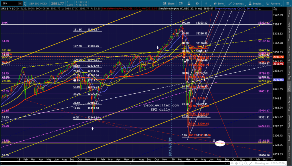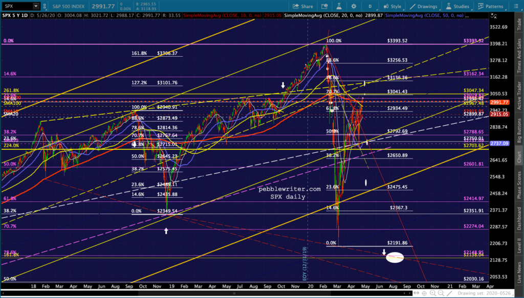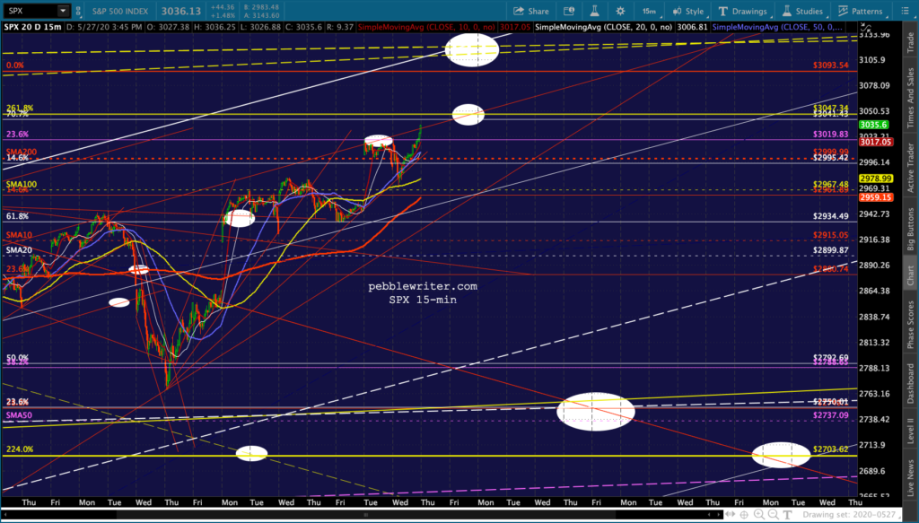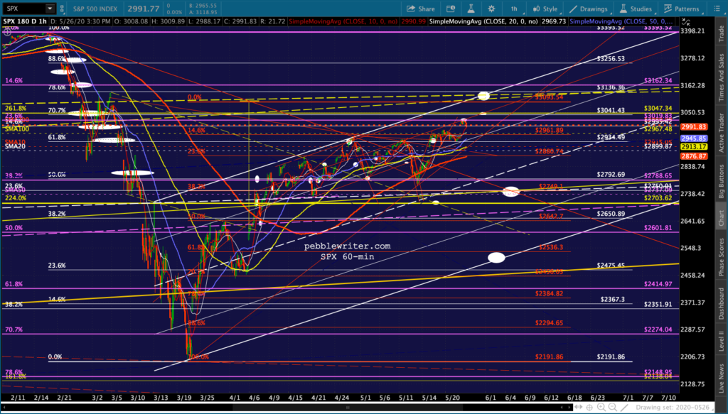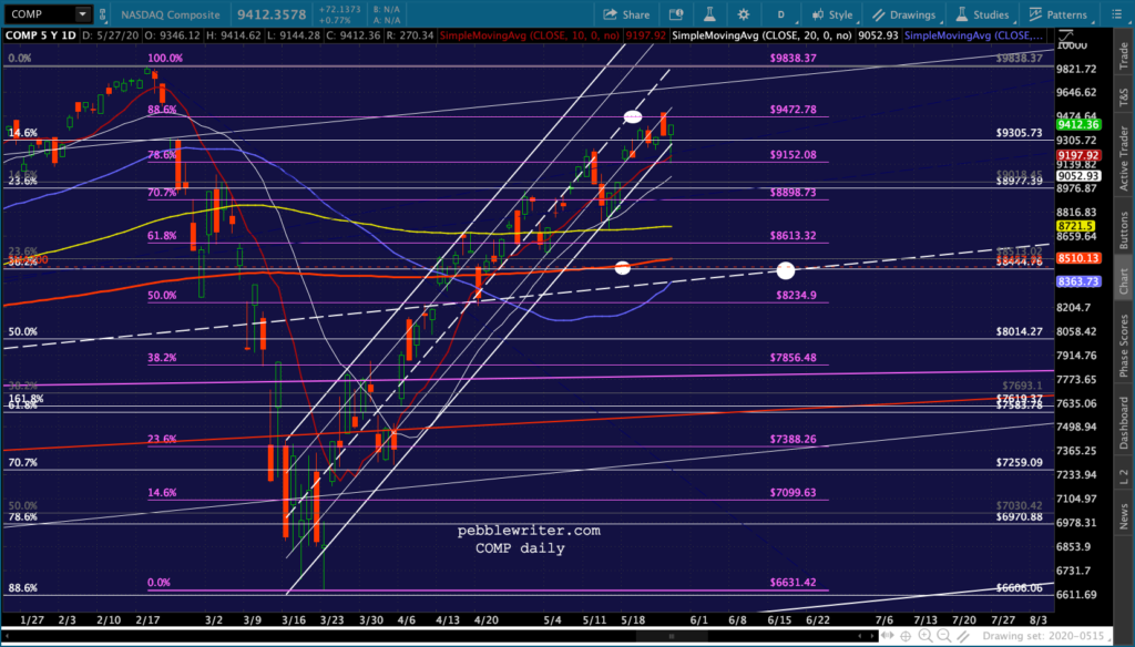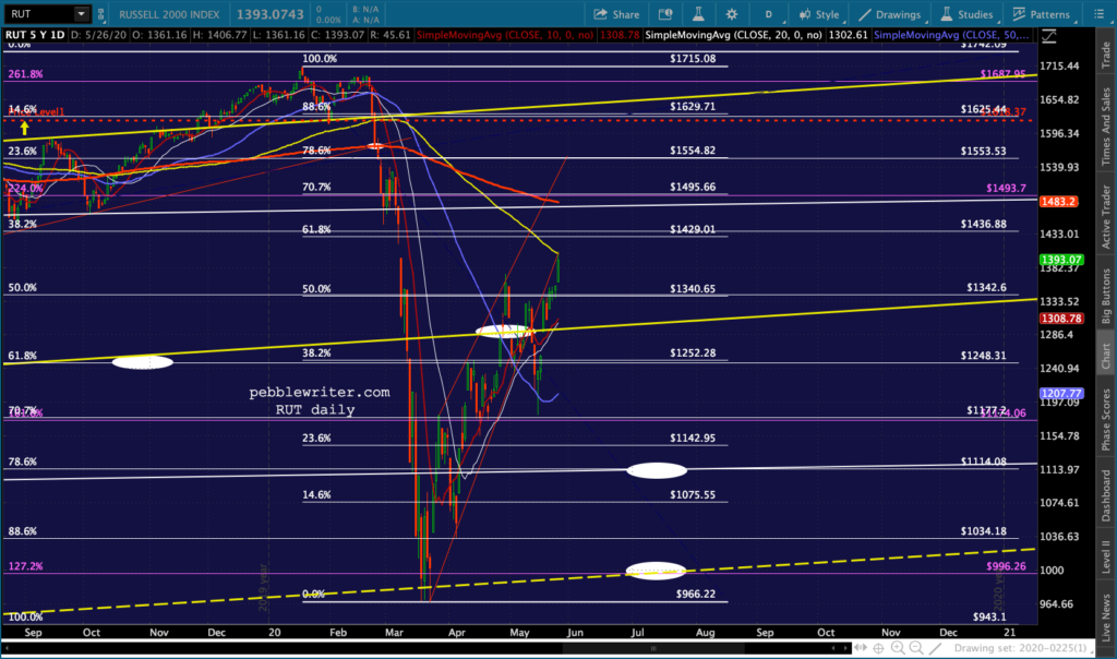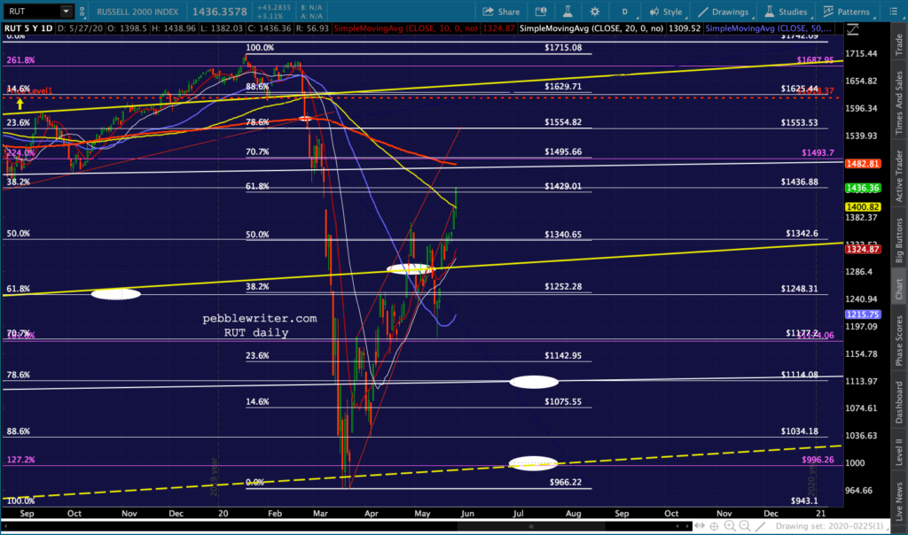 I don’t see anything very different from this morning’s outlook except that DJI and RUT both pushed through their .618s and SMA100s — suggesting they’ll continue up to their SMA200s. It’s at least short-term bullish.