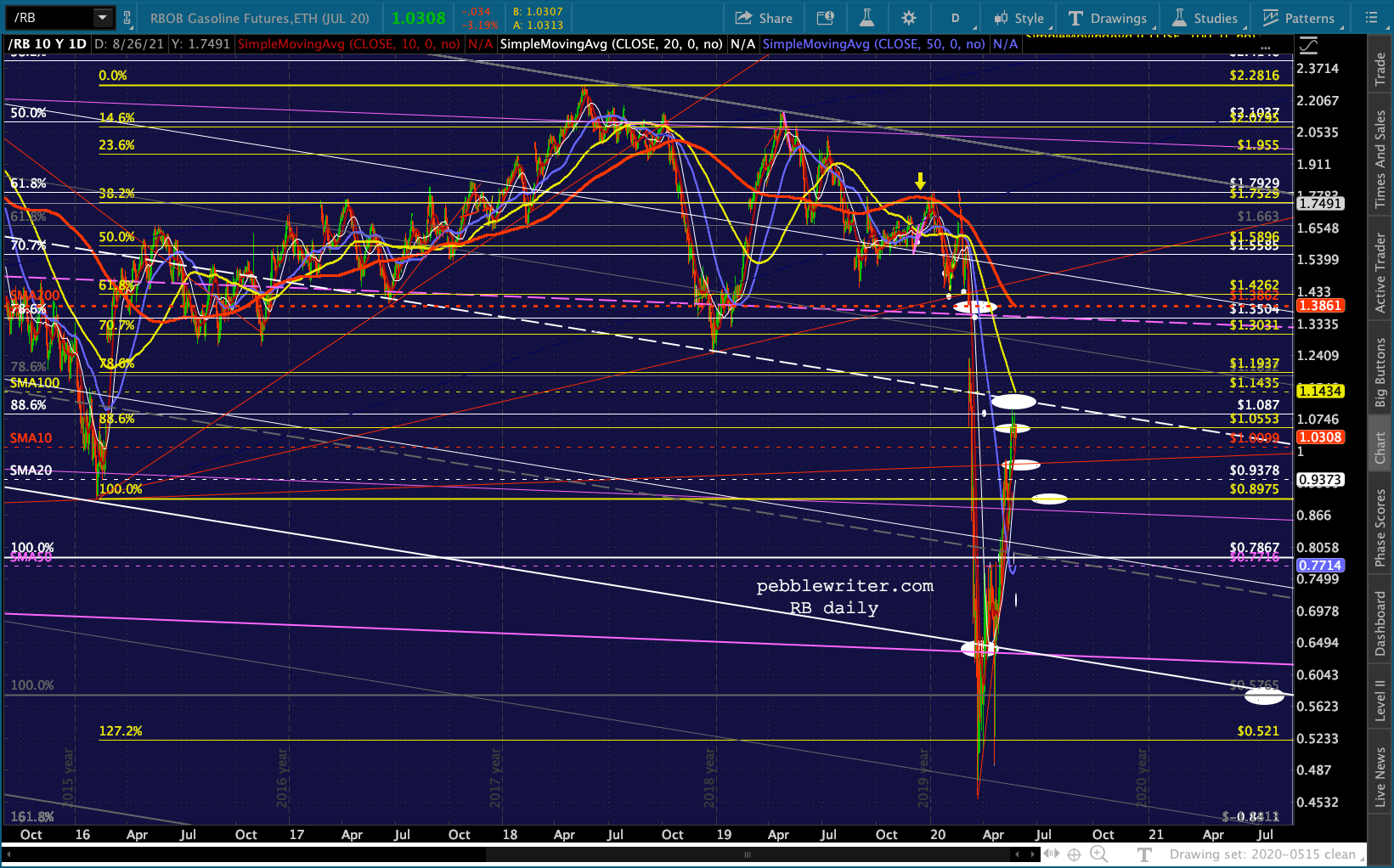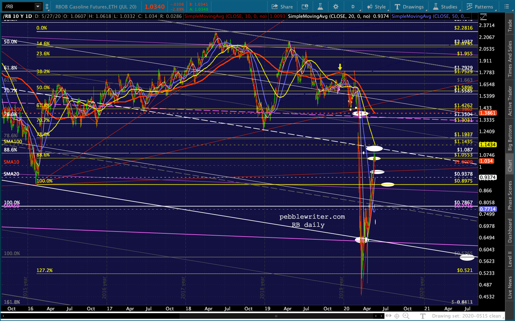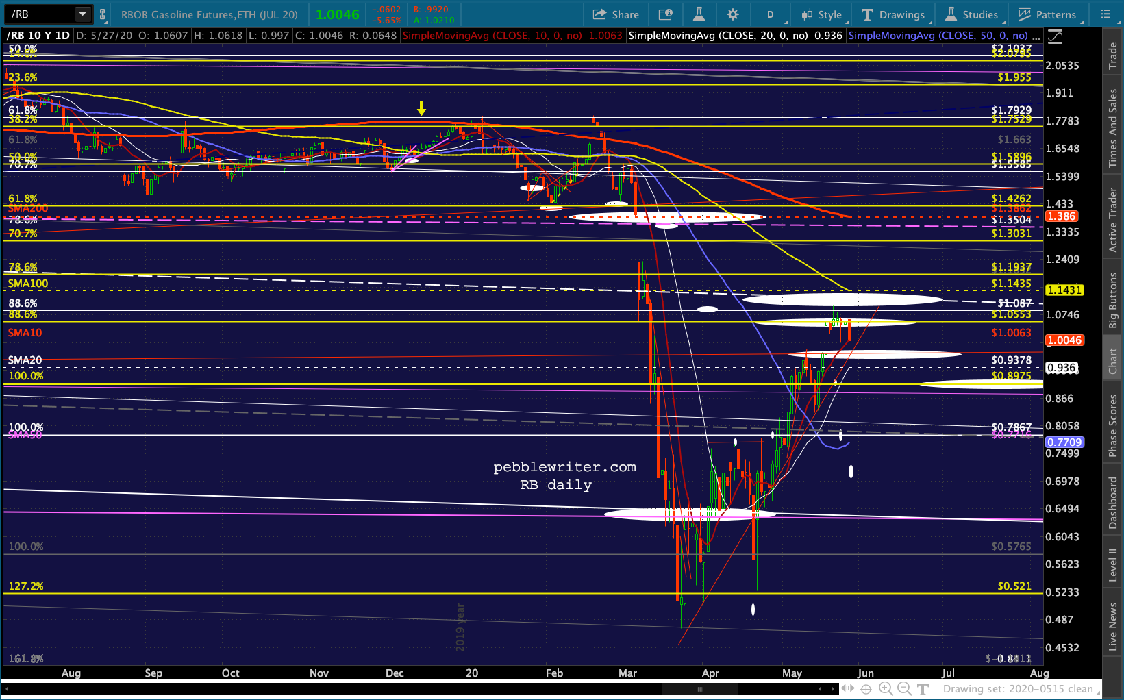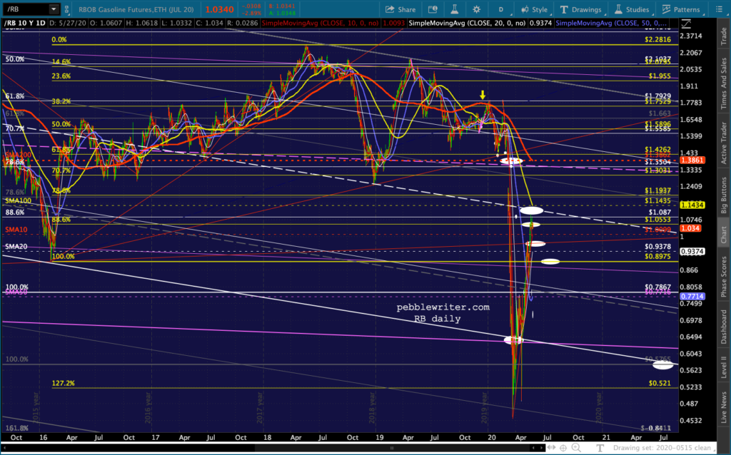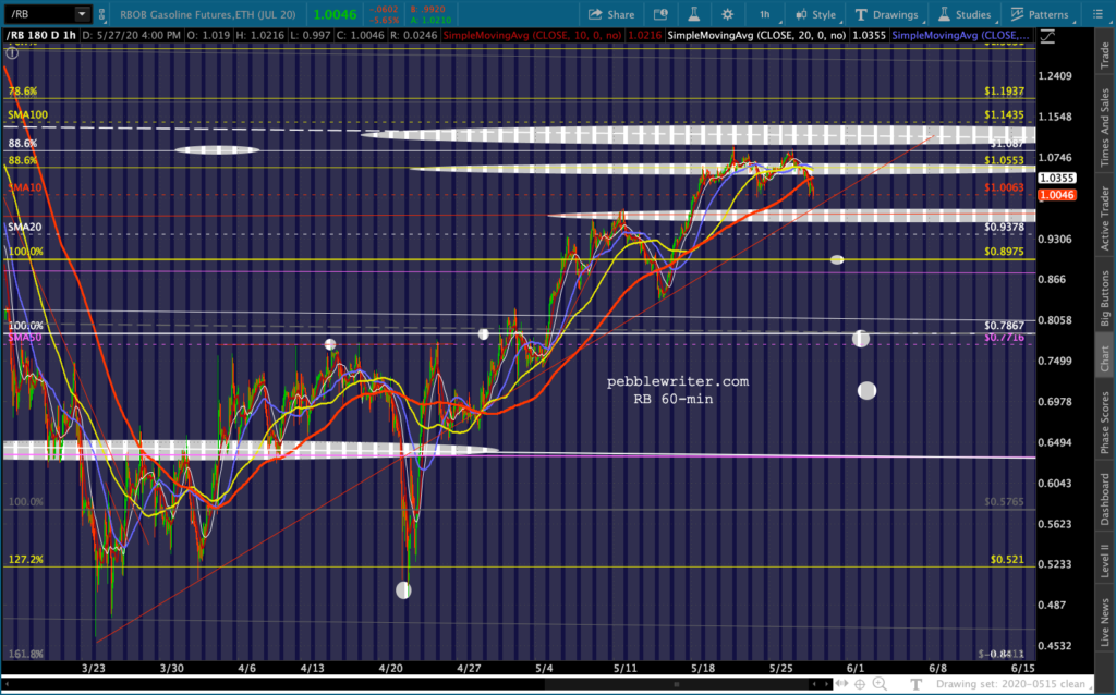…and RB coming very close to tagging the red TL from the Mar 23 lows (.9831ish.) It’s currently just below its SMA10 (1.0063) so this is an important test. Any drop below .98 opens up the SMA20 at .936.