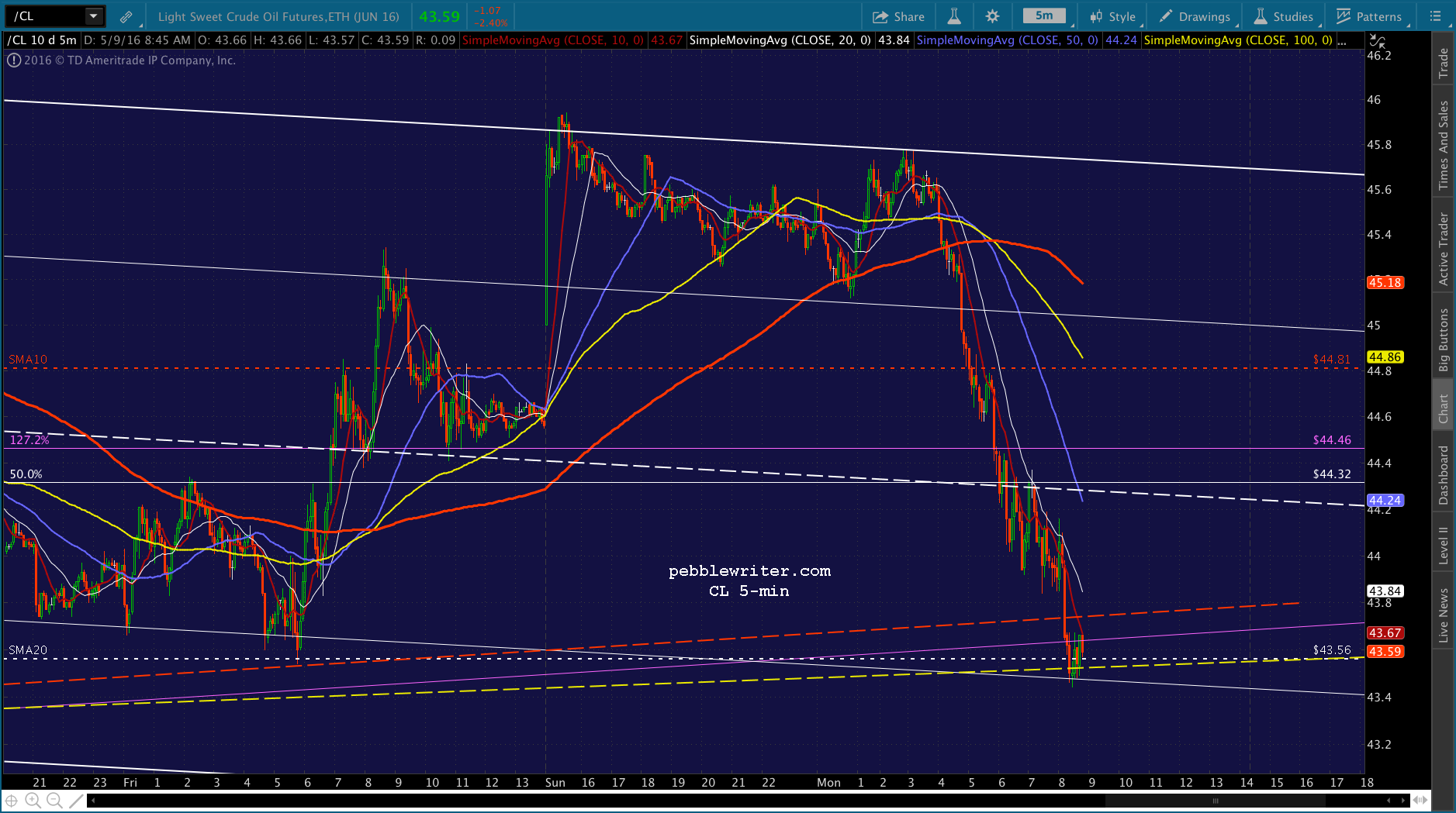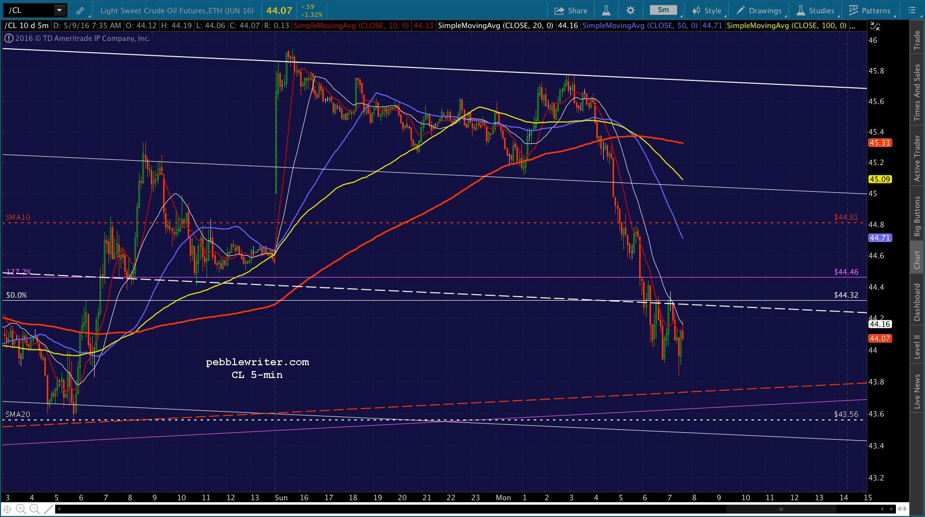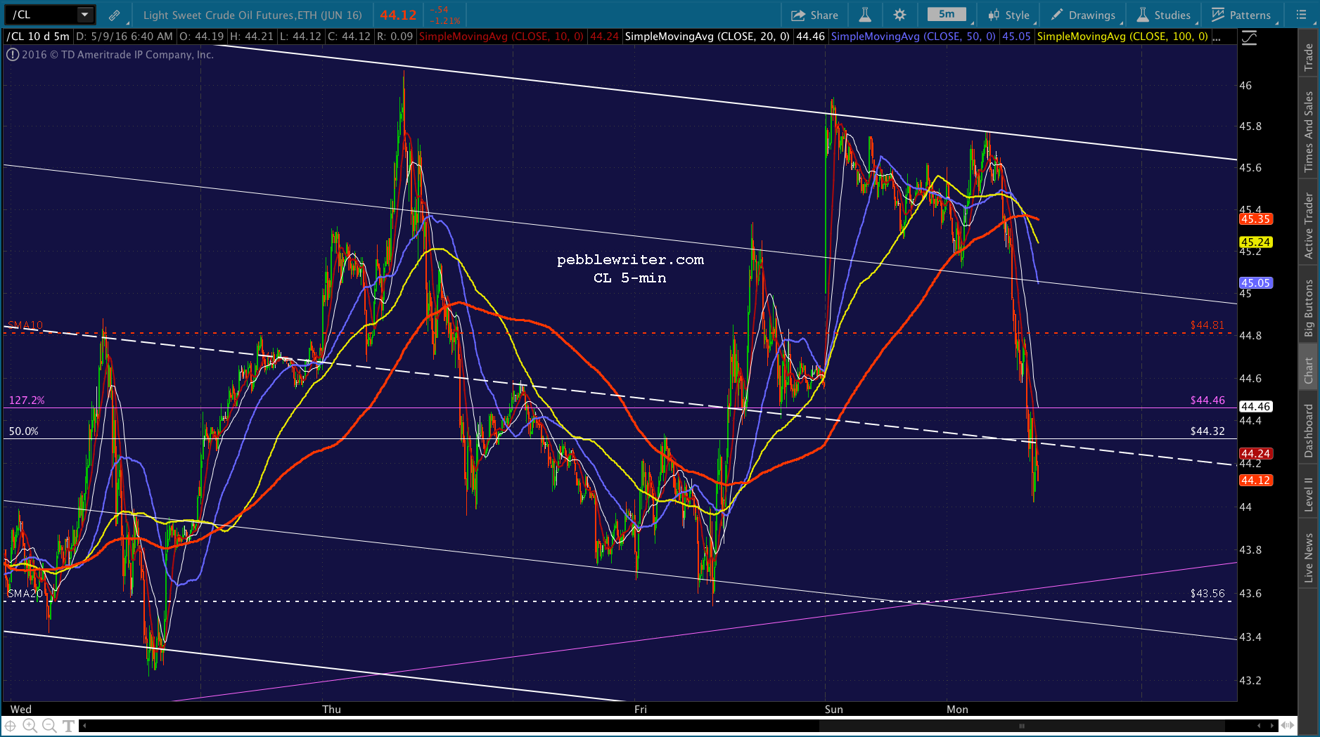 To play out, we’d look for a daily close below the yellow neckline, currently about 43.53. Note that CL has been dancing around that level for several hours — with over half of the 5-min bars since 11:20 AM either touching or straddling that value.