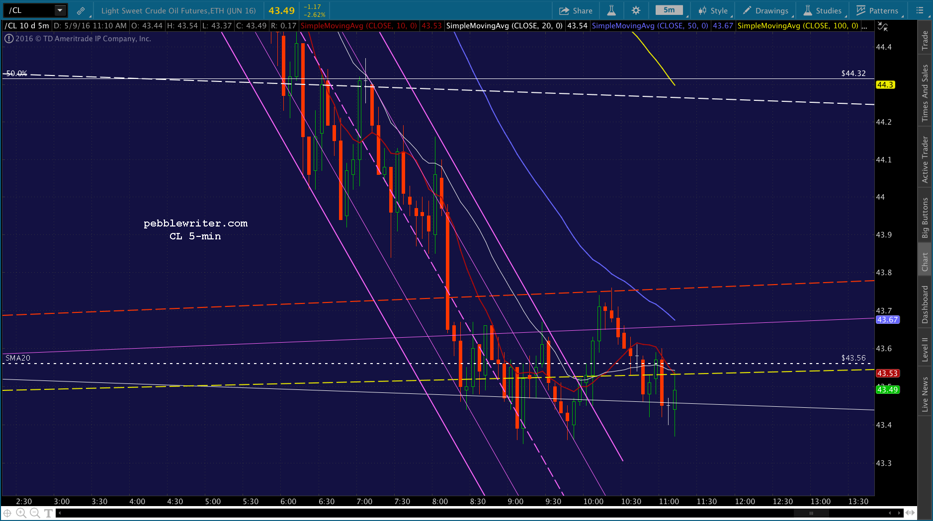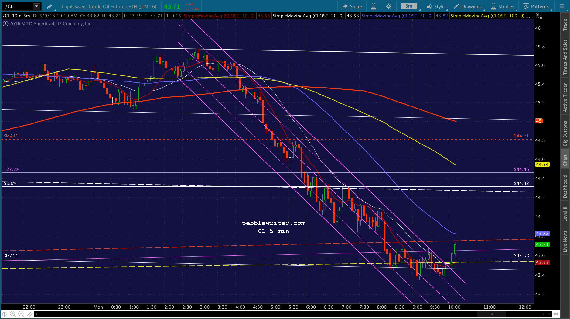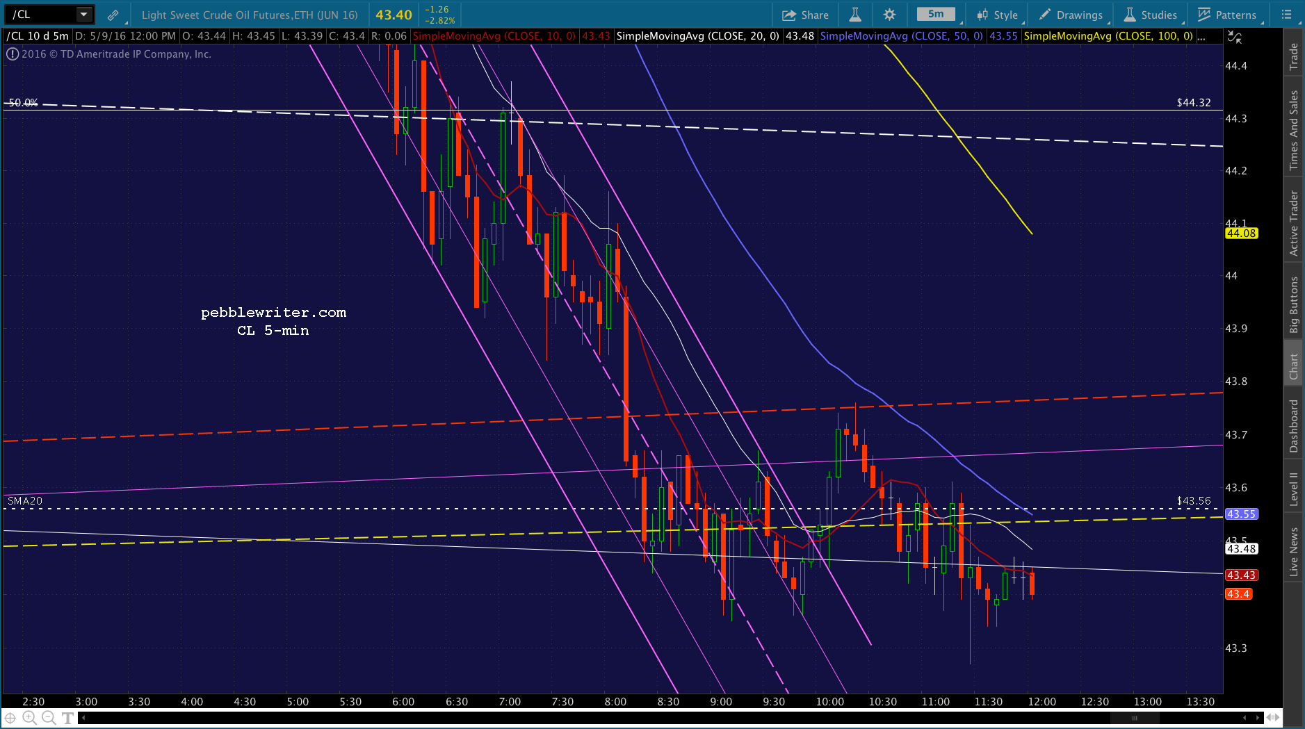 To play out, we’d look for a daily close below the yellow neckline, currently about 43.53. Note that CL has been dancing around that level for several hours — with over half of the 5-min bars since 11:20 AM either touching or straddling that value.
