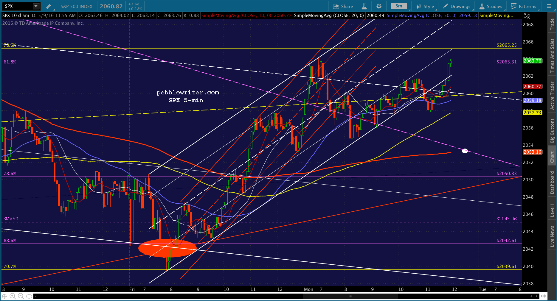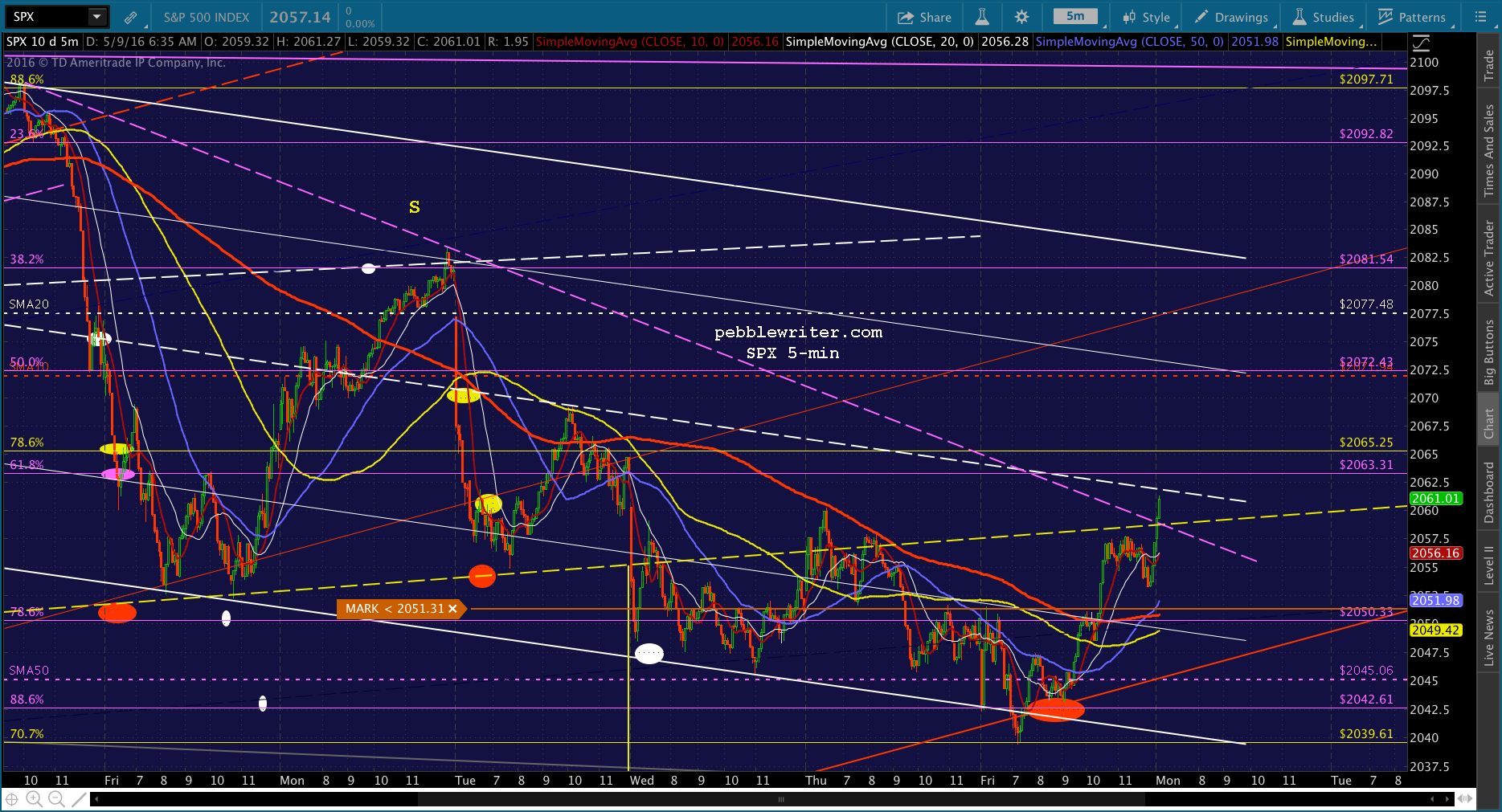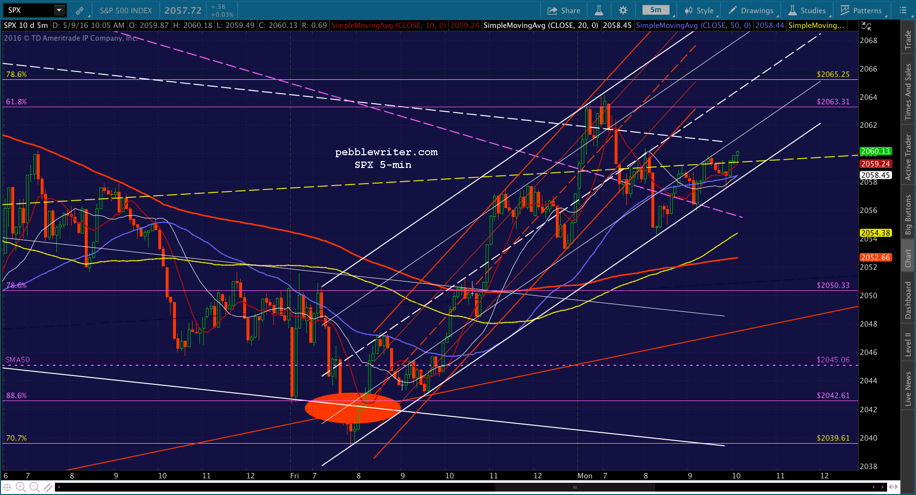 I’d go short, and see if we can’t make progress down toward the white channel .236 line at 2048.50. Watch for potential support at the SMA5 10, coming up at around 2052. And, the SMA50 is at 2045.06 — just below the red channel bottom at about 2046.20.