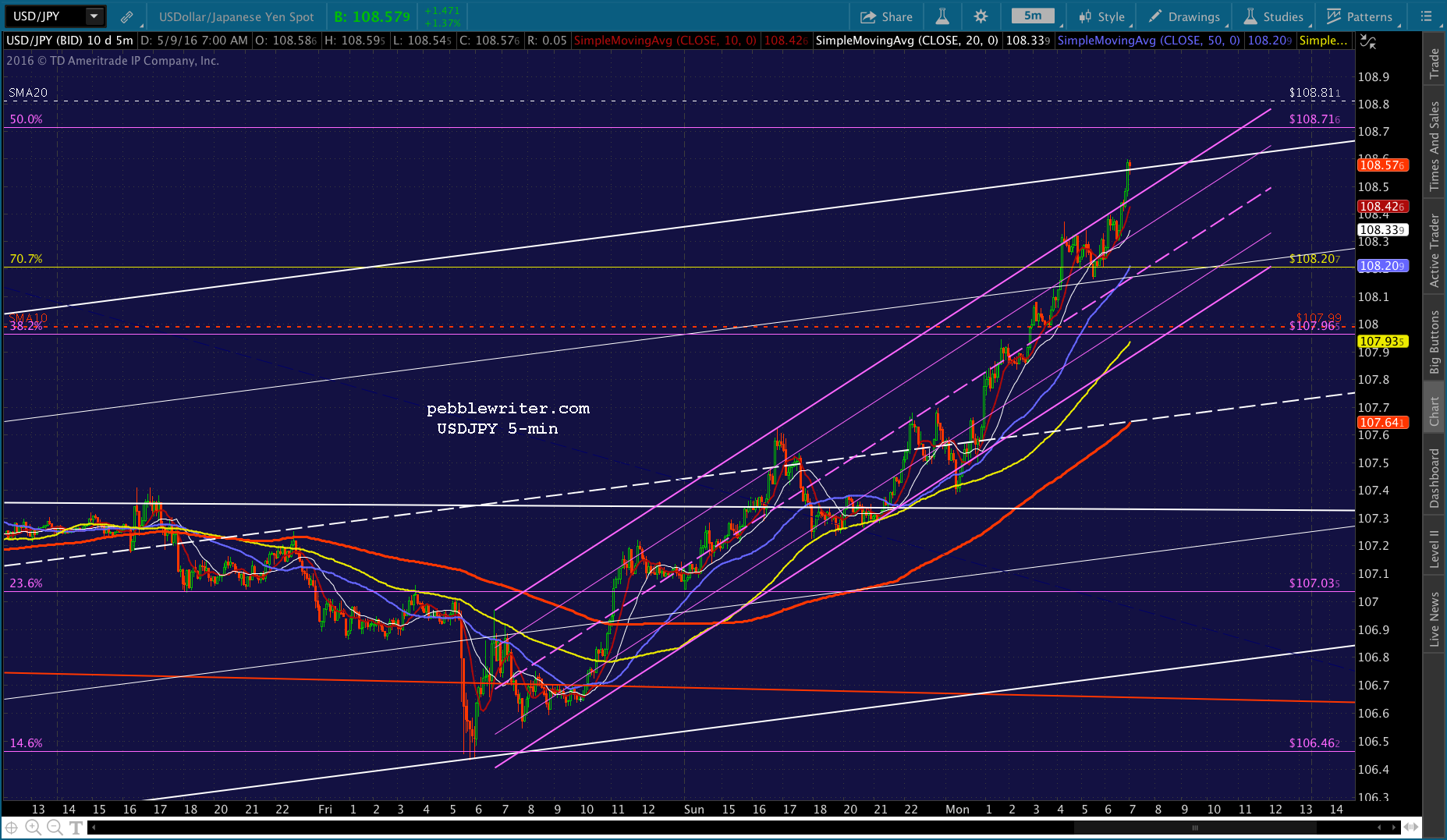 At the moment, it appears SPX wants to put in a backtest on the yellow neckline before taking off. But, USDJPY has gone parabolic. So, it’s not all that clear which way the winds are blowing. Shortly, SPX’s SMA5 10 will catch up with it and potentially provide support. Will it be enough to counteract USDJPY if it reverses at the white channel top? Unclear.