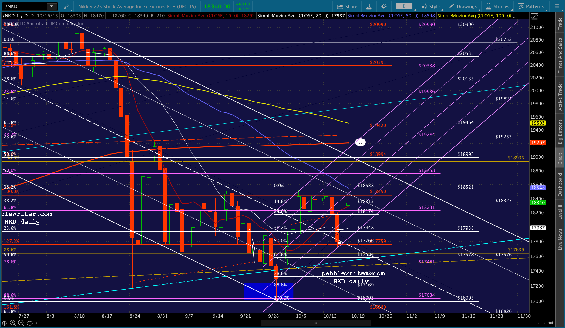 And, NKD has retraced .886 of its drop to the white .500 Fib and channel midline on Wednesday. It is retreating from the white channel .786 line and faces overhead resistance from an approaching SMA50 (purple.)