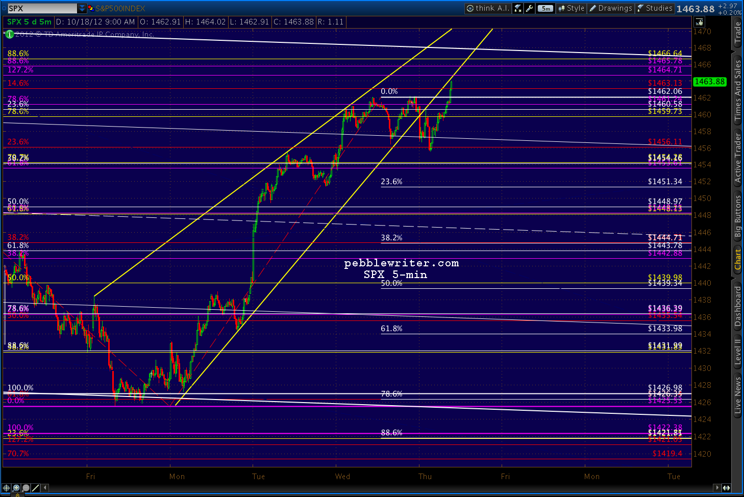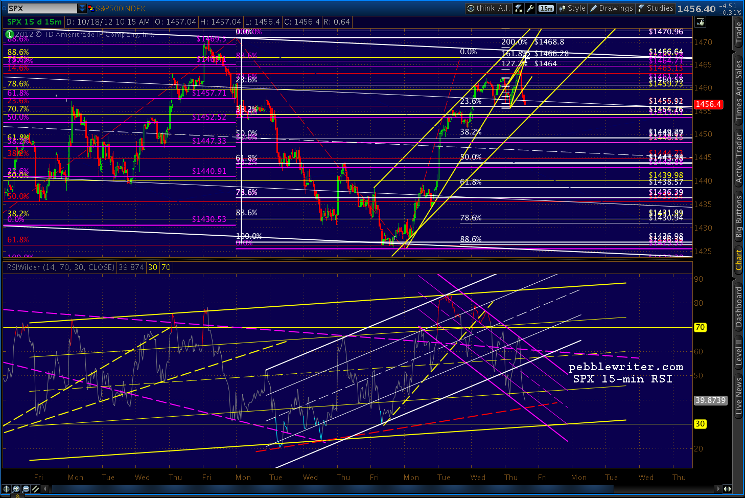 Getting a decent sell-off, but I won’t be convinced we’re not going back to tag those .886’s until: (1) we break below this morning’s low of 1455.60, and (2) we clear the parallel wedge line that might be construed as a rising channel. It’s one of market makers’ favorite tricks — especially around OPEX.