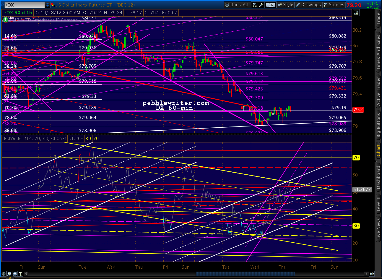 The 5-min DX white channel just failed, and SPX is nearing 1464 as DX is nearing the bottom of the purple channel. It looks like 1464-1465 would just about complete a simple back-test of the SPX rising wedge.