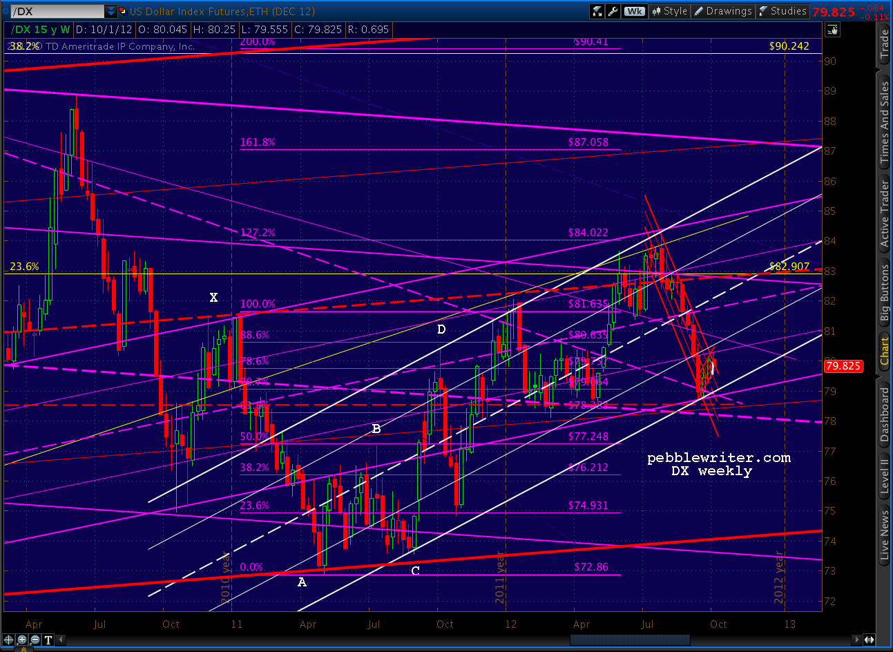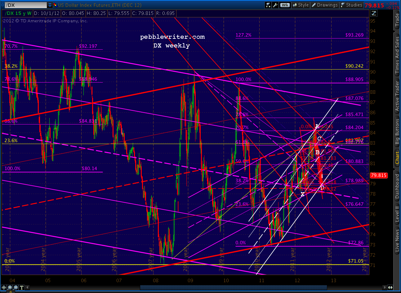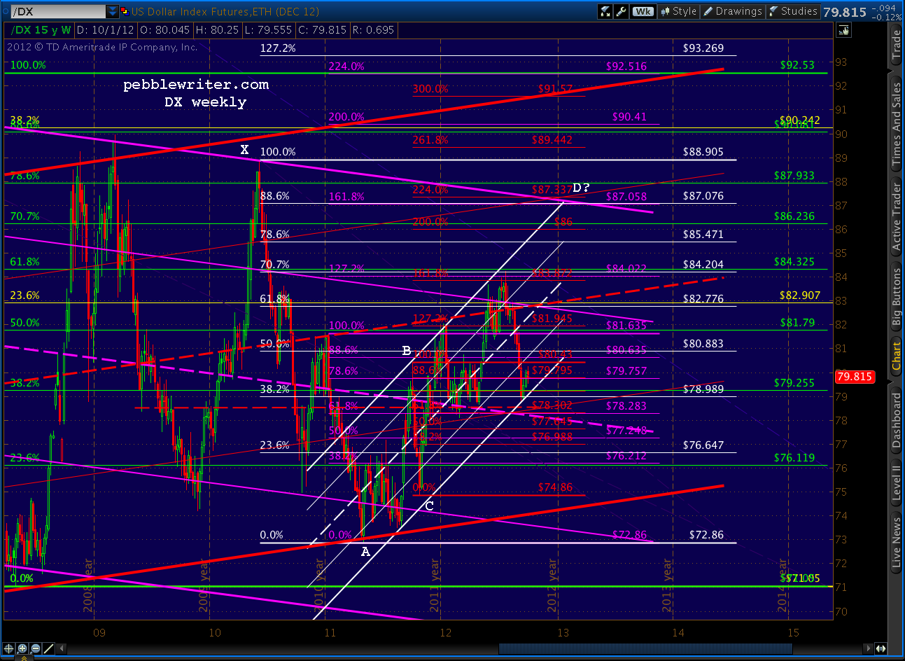 Furthermore, 87.058 is within 2 pennies of the .886 retracement of the June 2010 to May 2011 drop, shown below in white. In other words, by reaching 87, DX would complete: