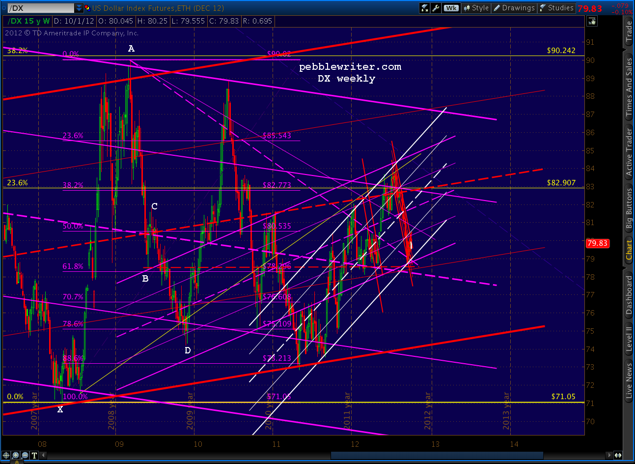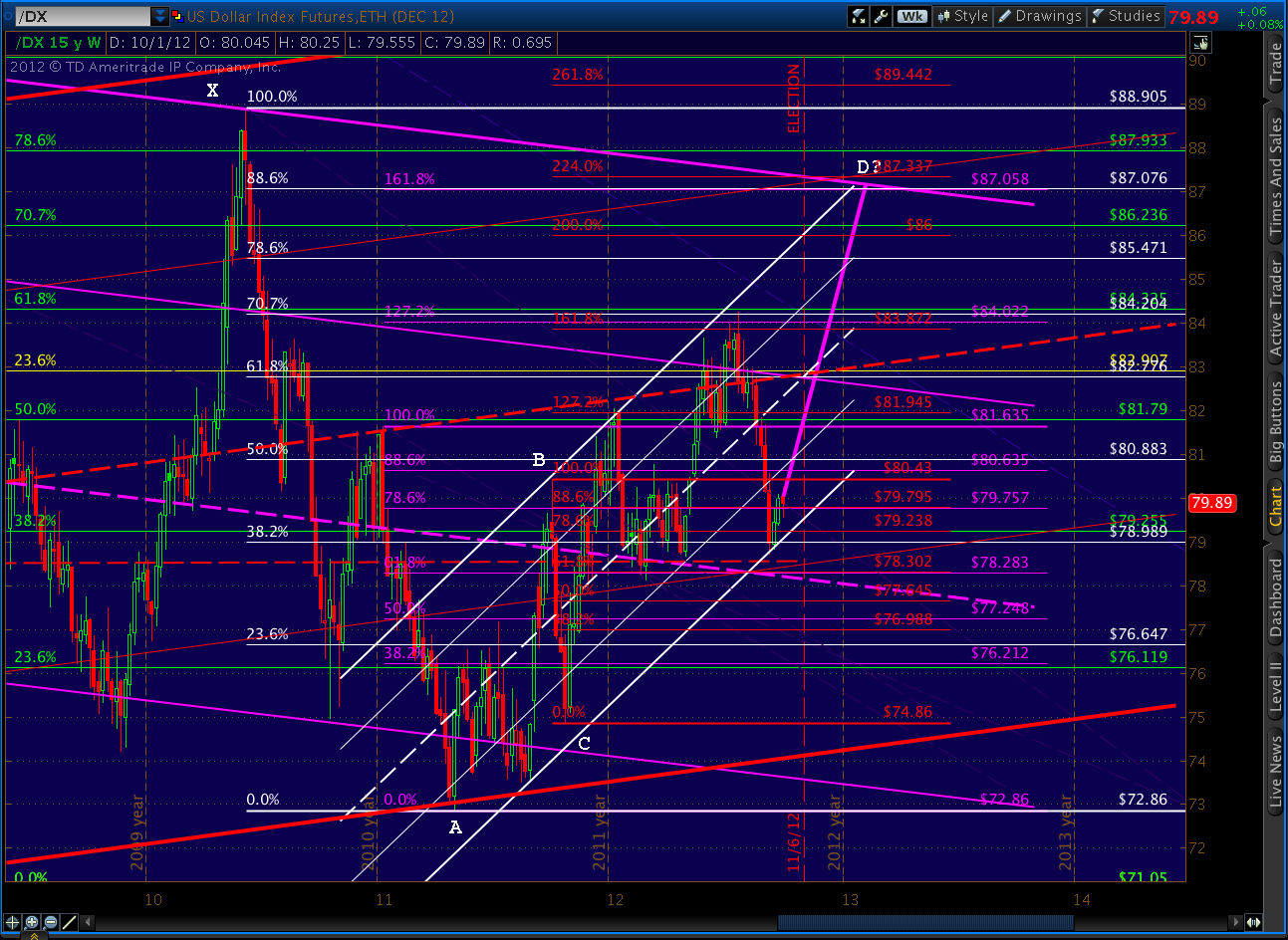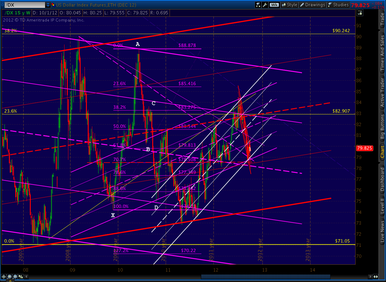 Following the April 2008 low, at the intersection of the bottom of the two, DX rebounded sharply — retracing to the .382 Fib. It then completed a big fat Gartley pattern, retracing that move to the .786.