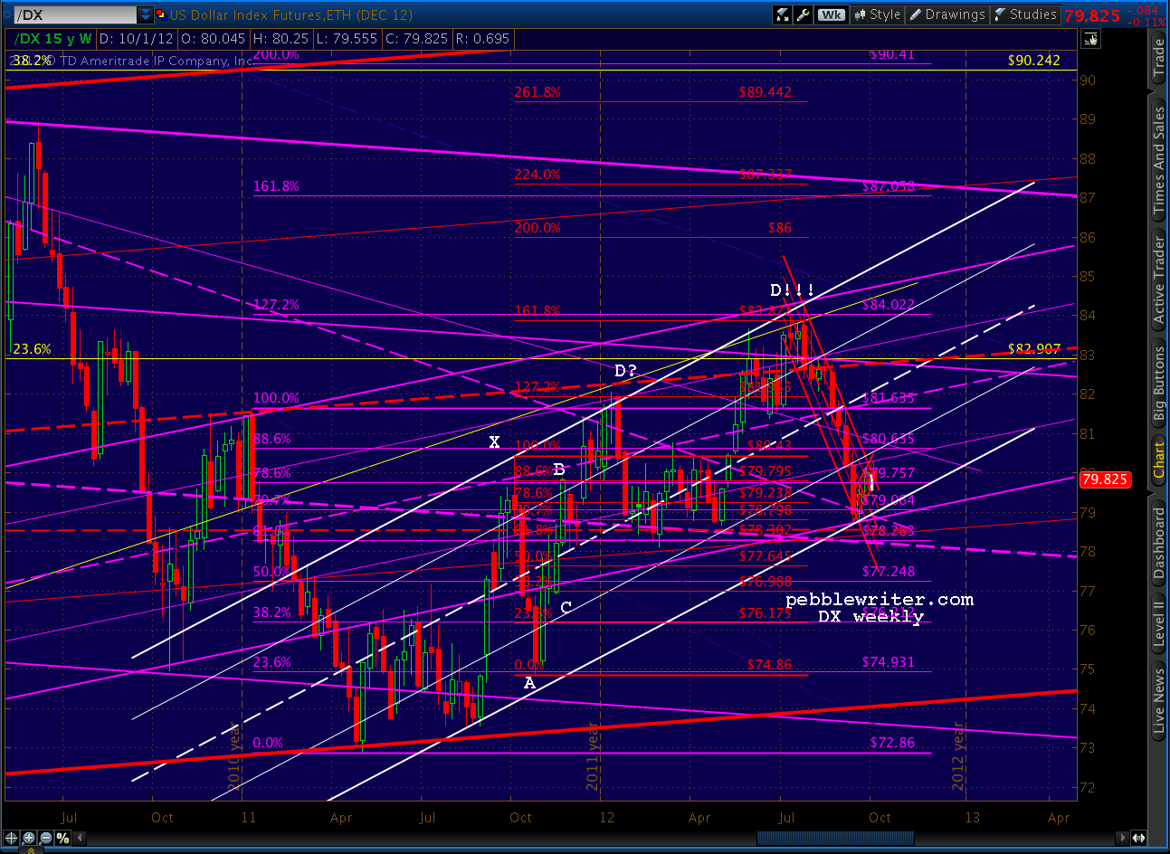If so, there’s a good possibility (but, not necessary) that DX would move higher in search of a Point C first. The red channel midline — where it intersects with the larger falling red channel — is an area that intrigues me. It would occur around 3am EDT right at 80.