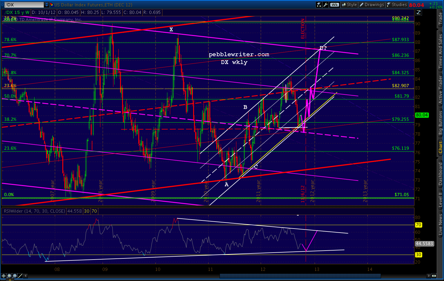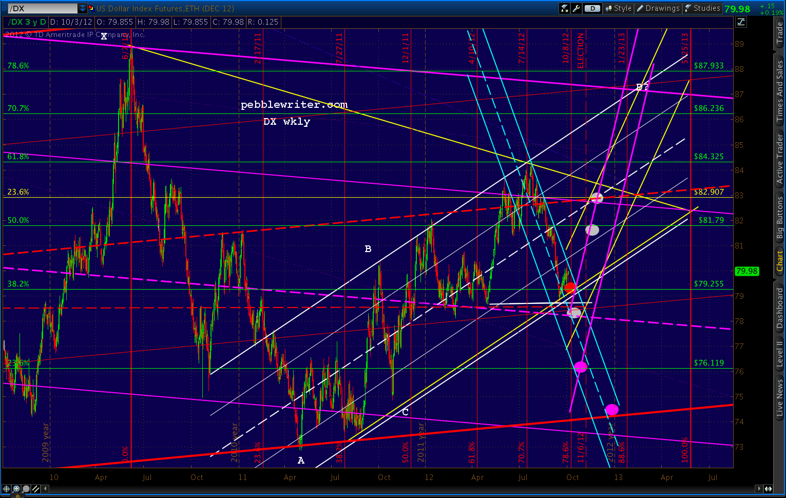 It’s at the .500 of the move up from the very bottom, and .618 of the move up from Oct 11. There are also two .618 Fib lines there from the trip up. It would also have the benefit of faking out those who play the continuation Head & Shoulders pattern that would be formed. The purple midline is around 78.2 on election day, and a nearby red channel line is at 78.5. So, let’s put a pin in 78.30 around the first of November.