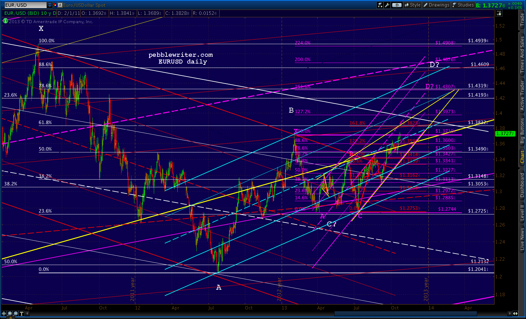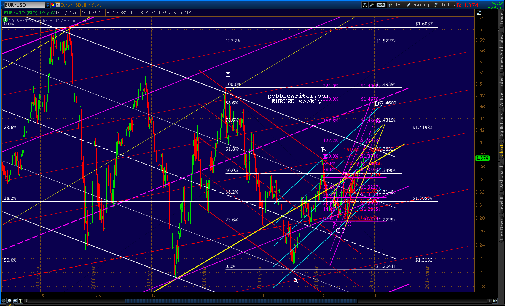 If so, the .786 or .886 are easily reachable (1.4319 or 1.4609) and the rising purple channel midline should be tested again. If not, the party’s probably over at the .618 at 1.3832 and the yellow channel bottom will once again break down.