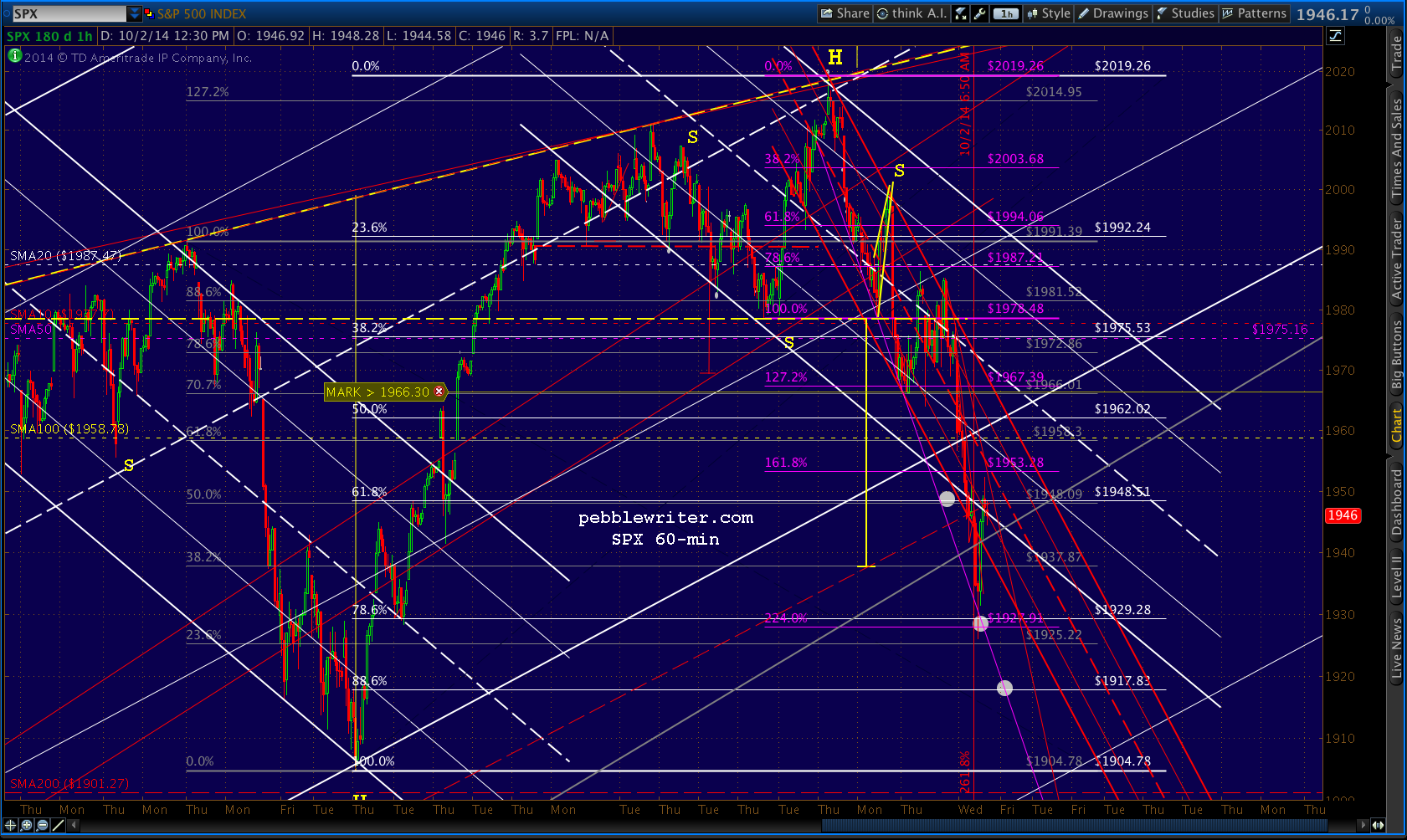 SPX reversed strongly at the .786 a la Feb 5 and closed in the green. Thanks to the overnight ramp job, SPX should open at around the SMA100 (1958.78.)