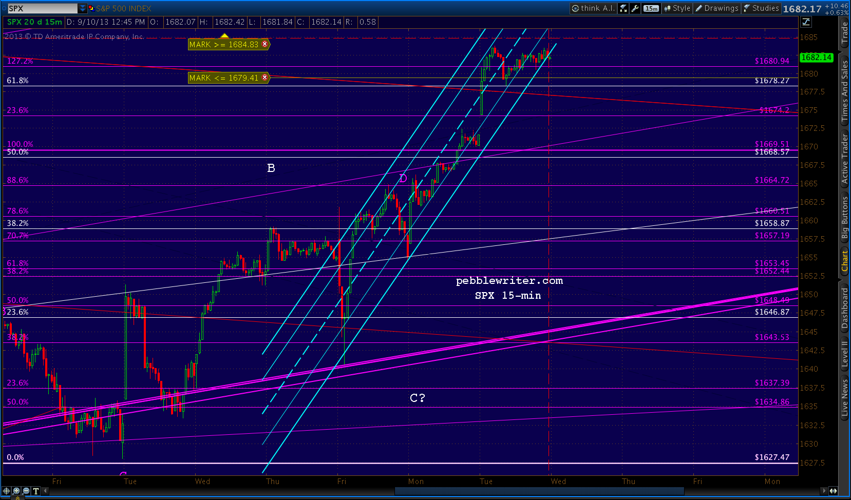 This market’s like watching stew cook. A very slow, very sedate simmer. Will hold long in the aftermarket for the afore-mentioned targets, stops at the red channel midline — currently about ES 1679.00. I would expect a backtest of the .618 (1674.34) at some point, perhaps overnight.