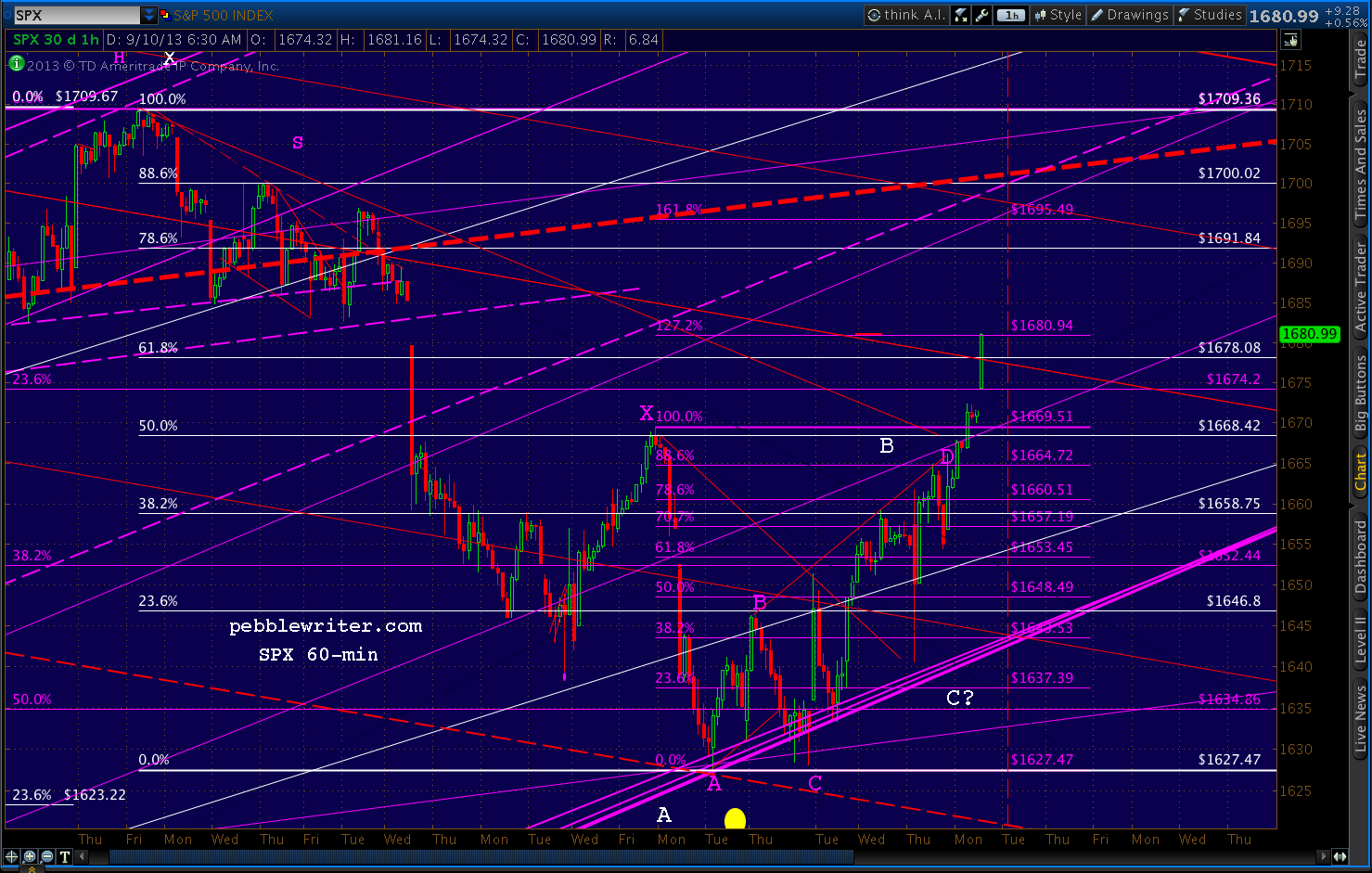 A strong reversal there (the white .618 at 1674.34) would set up a Gartley to the .786, but at this point the better candidate is a Bat Pattern up at the .886 (ES 1695.85, SPX 1700.)