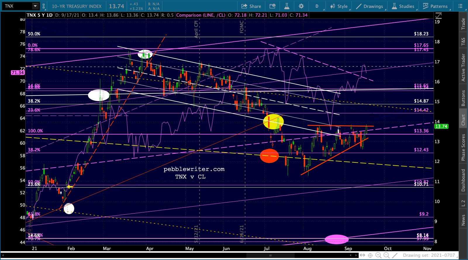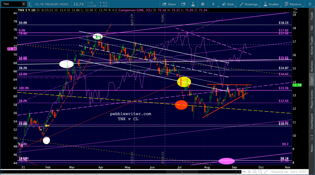 Last, TNX continues to go nowhere, burrowing into the vertex of a narrowing triangle.