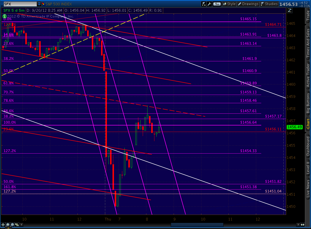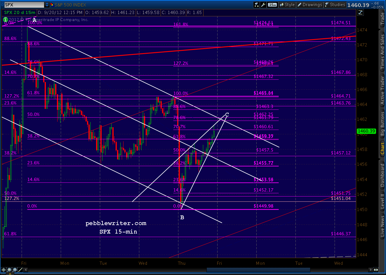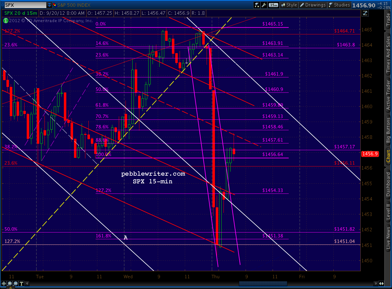 We got a bounce at the bottom of the red channel — which should reach the 1454-1455 area — the recently broken red channel line and the midline of the white channel. But, I don’t think this move is finished (keeping in mind tomorrow is OPEX.) More in a few minutes.
