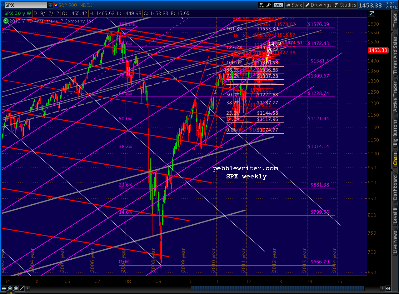 Absent the election and QE3, I might expect a sizable correction — perhaps on the order of 1370 or so. But, we can expect a highly manipulated market between now and November 6th. So, I’m looking for logical stopping places that would allow some of the overbought conditions to abate, while leaving the upside intact. Hence, the 4 levels I posted earlier.