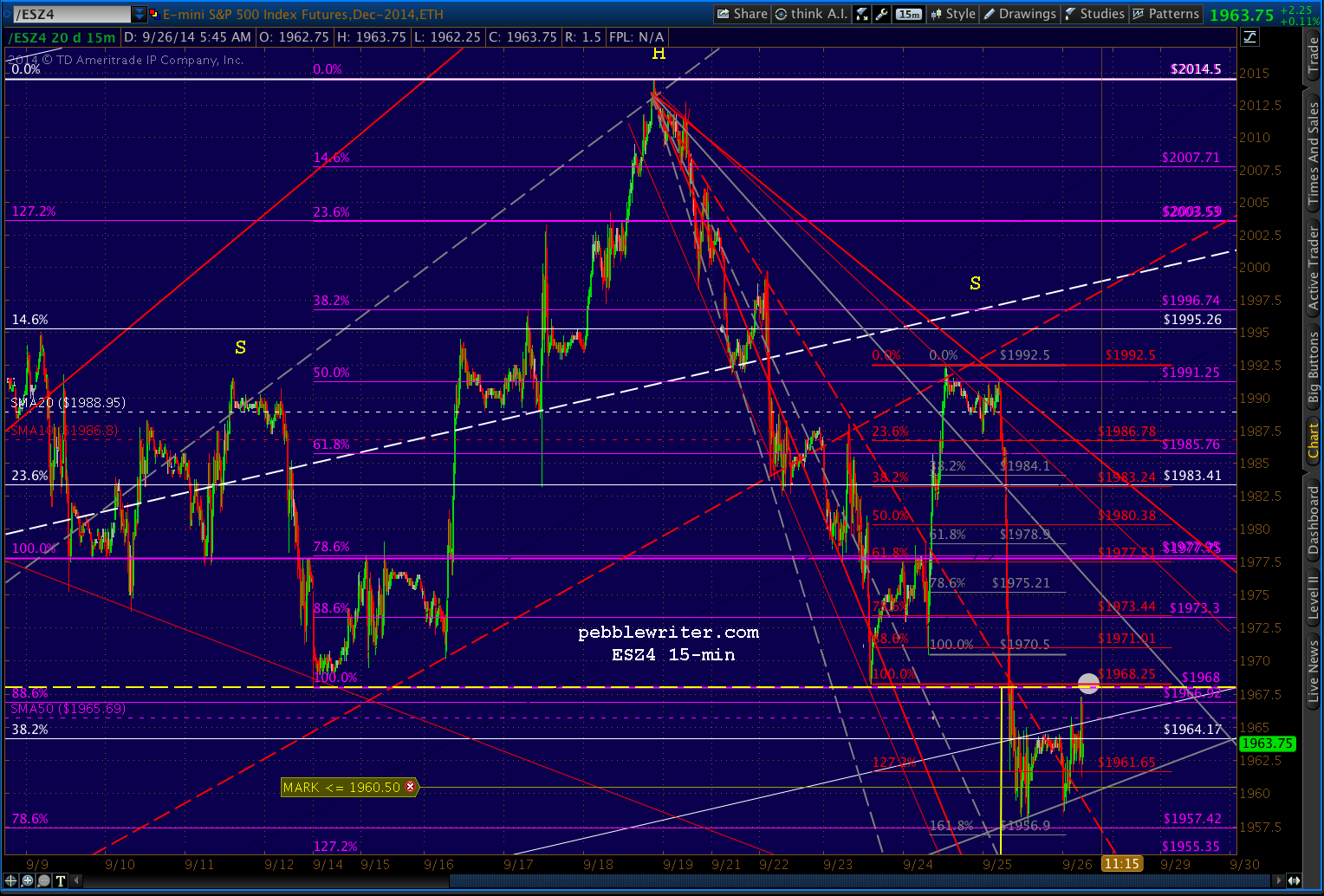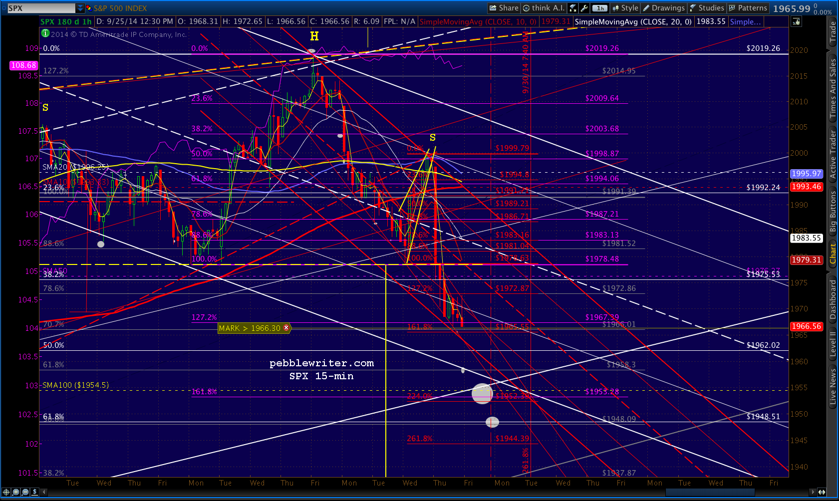 If we get follow-through today, I expect it will be about reaching the SMA100 — 1954.50 for SPX. It would tag the bottom of the rising white channel that connects the Jun and Oct 2013 lows with the Feb and Aug 2014 lows — a pretty good line of support.