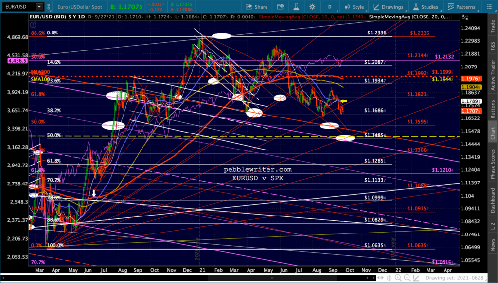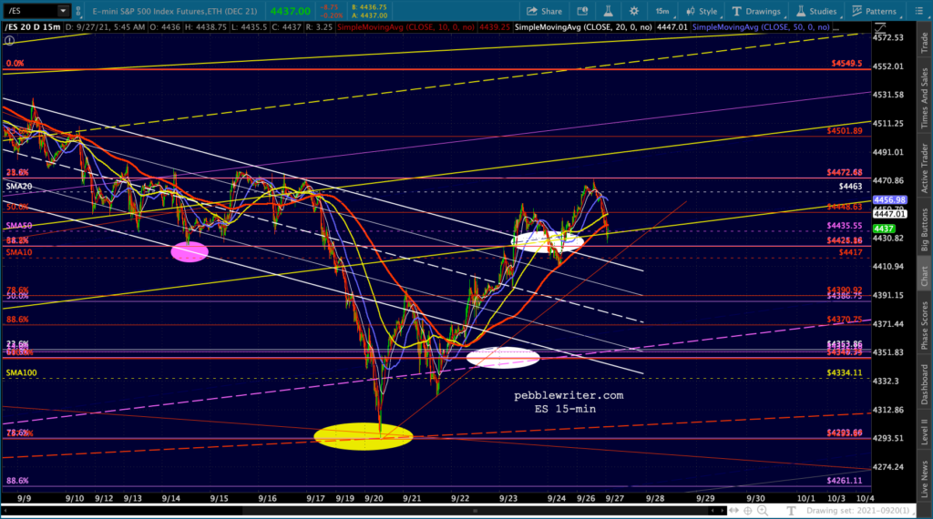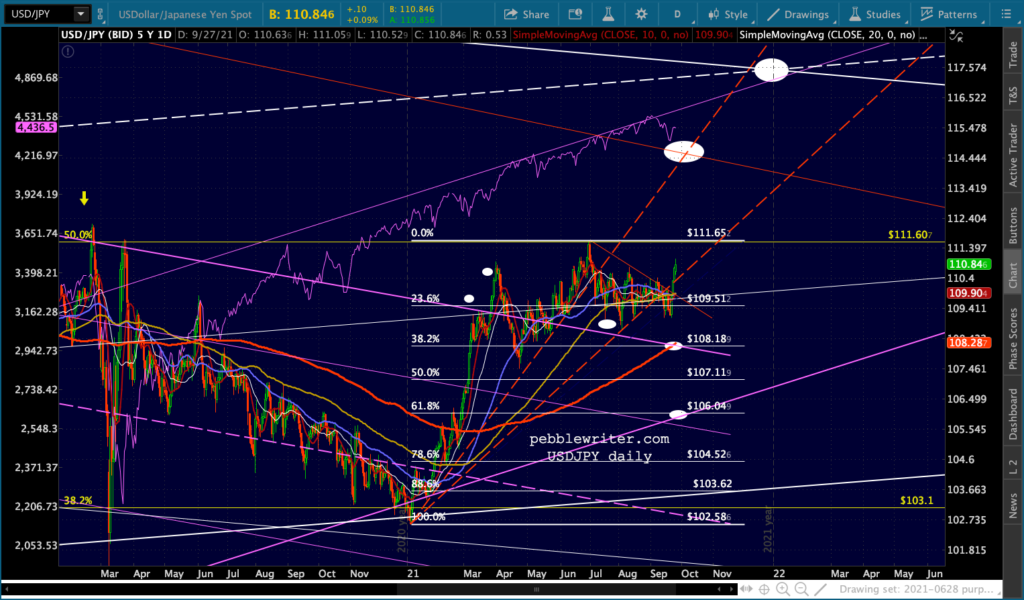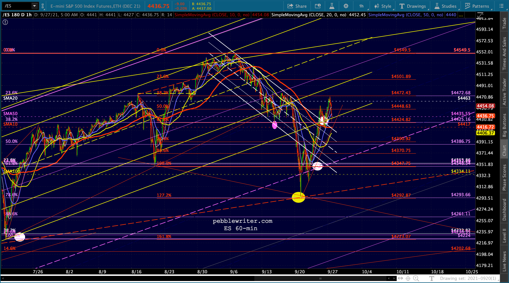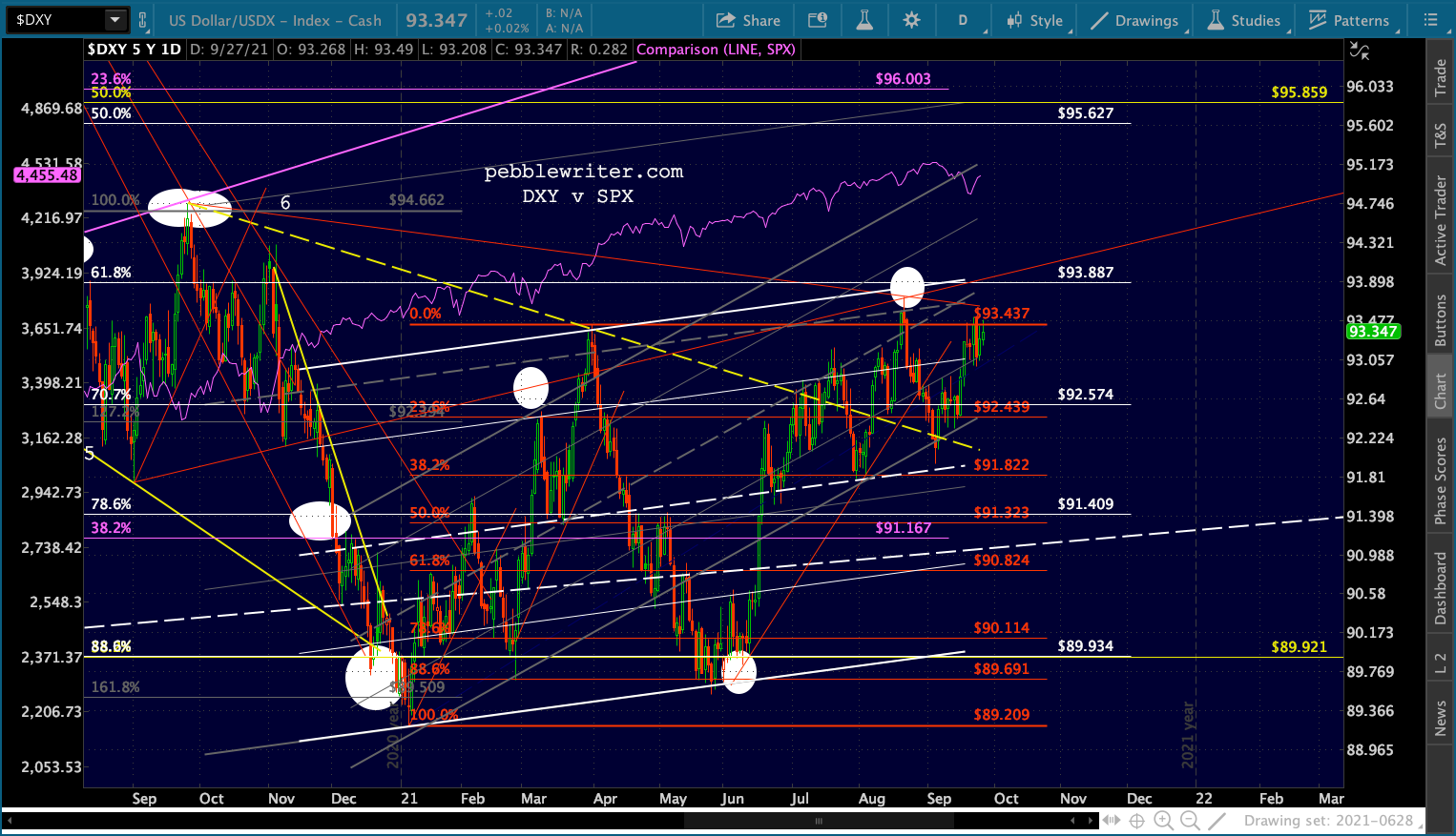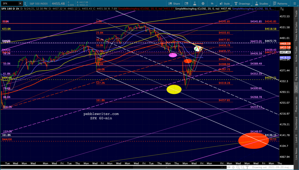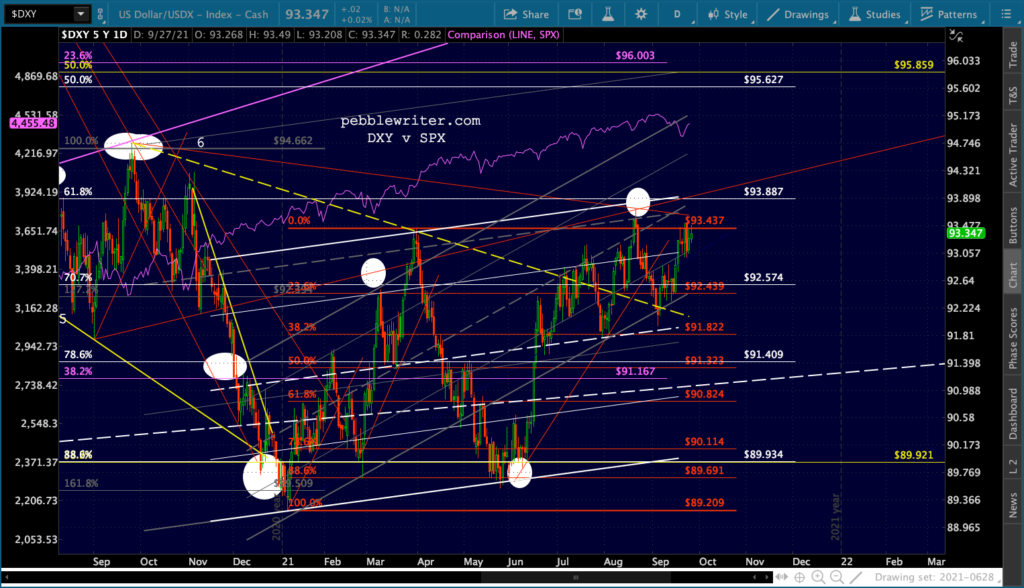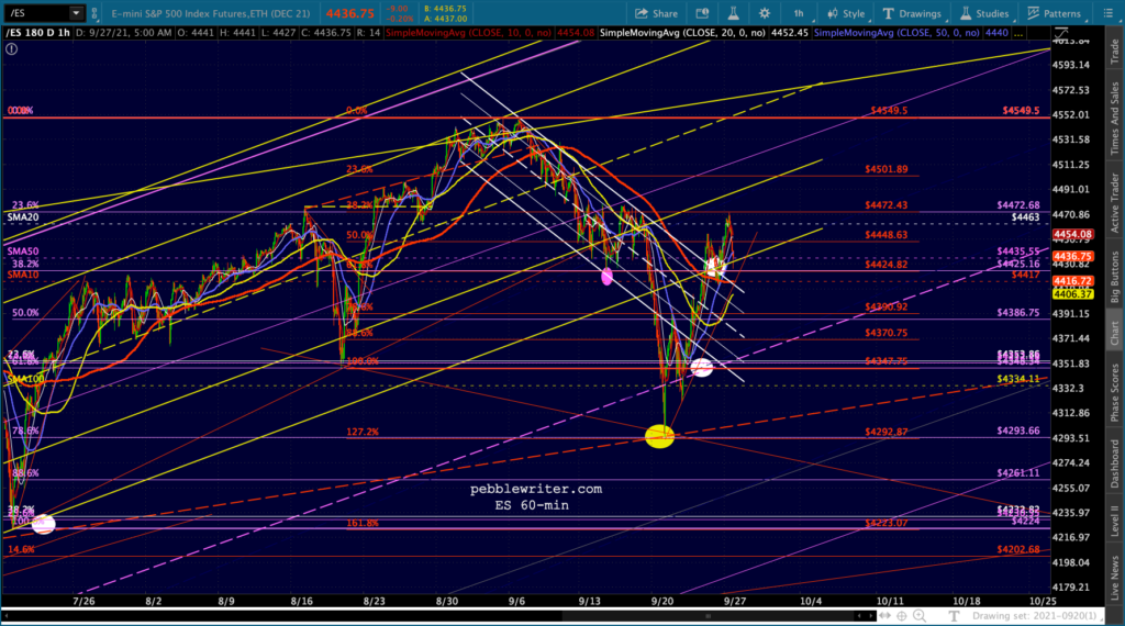 The equity situation hasn’t changed other than the recent overshoot on bounces in SPX and ES. The implication is that the rising yellow channel has been rejoined and its bottom backtested. By the end of the day, the rising red TL from the Sep 20 lows and SMA10 (4417) are likely to be tested.