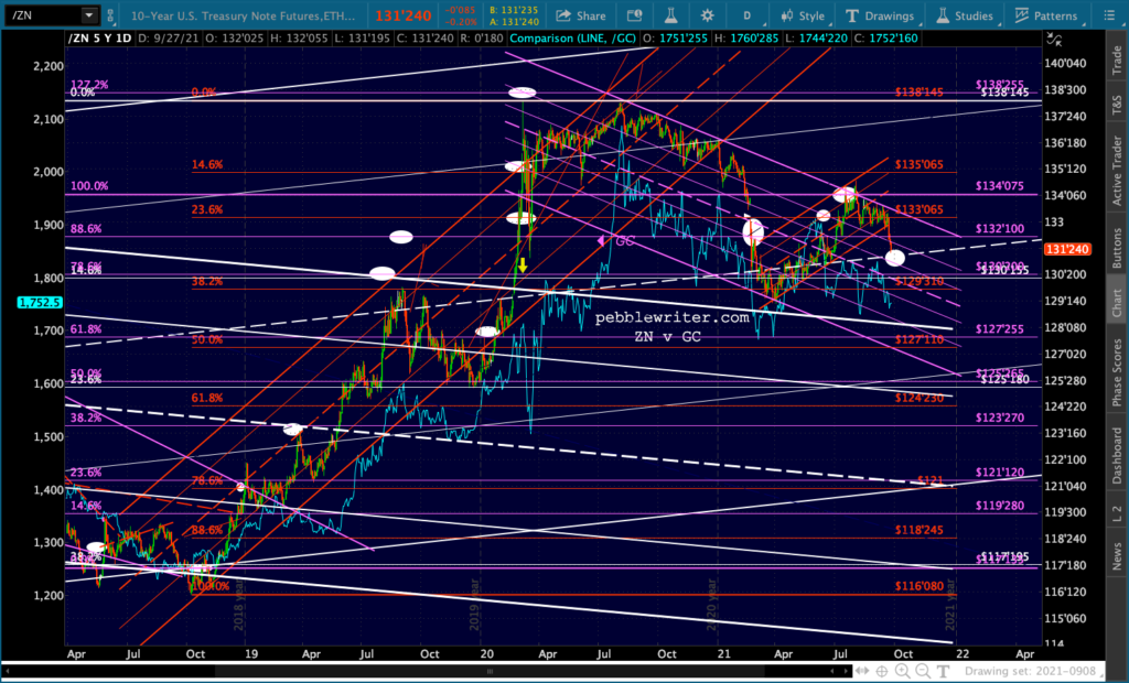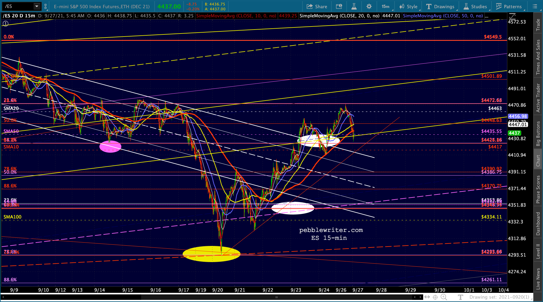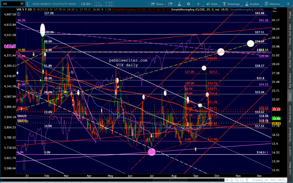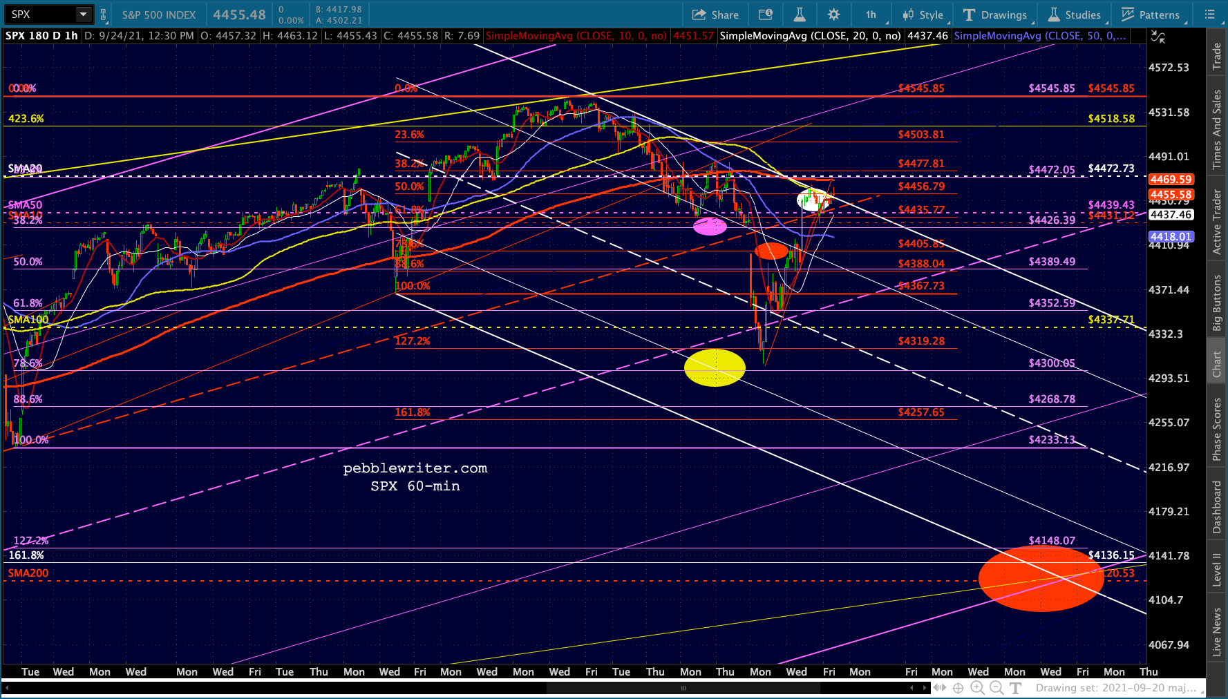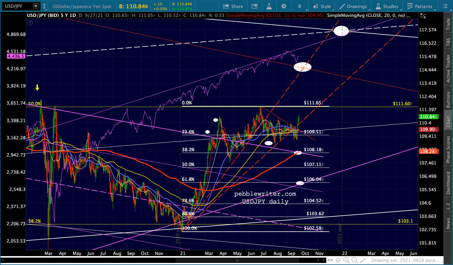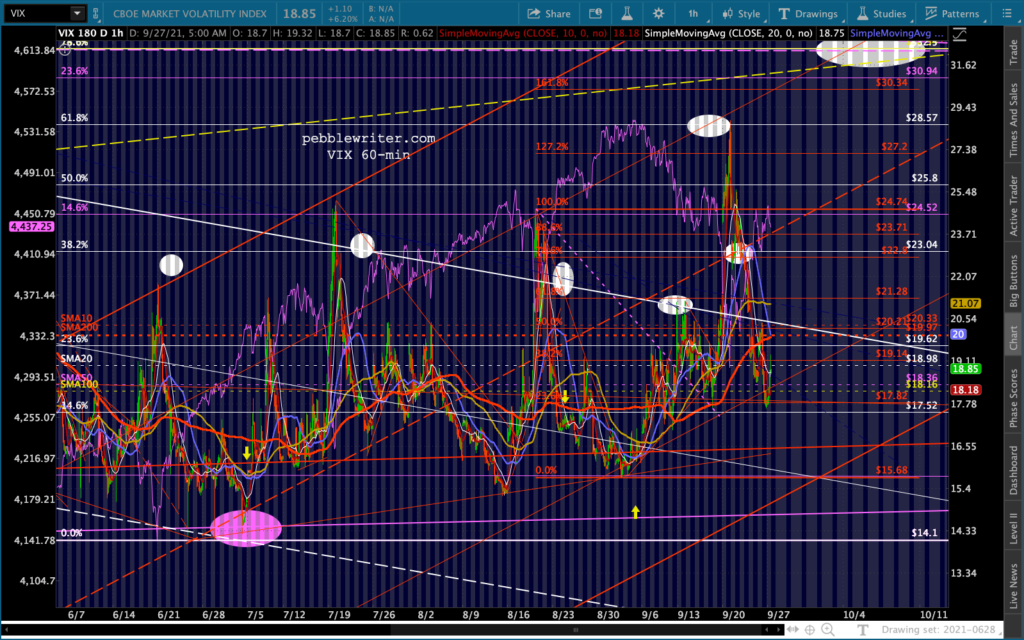 The equity situation hasn’t changed other than the recent overshoot on bounces in SPX and ES. The implication is that the rising yellow channel has been rejoined and its bottom backtested. By the end of the day, the rising red TL from the Sep 20 lows and SMA10 (4417) are likely to be tested.