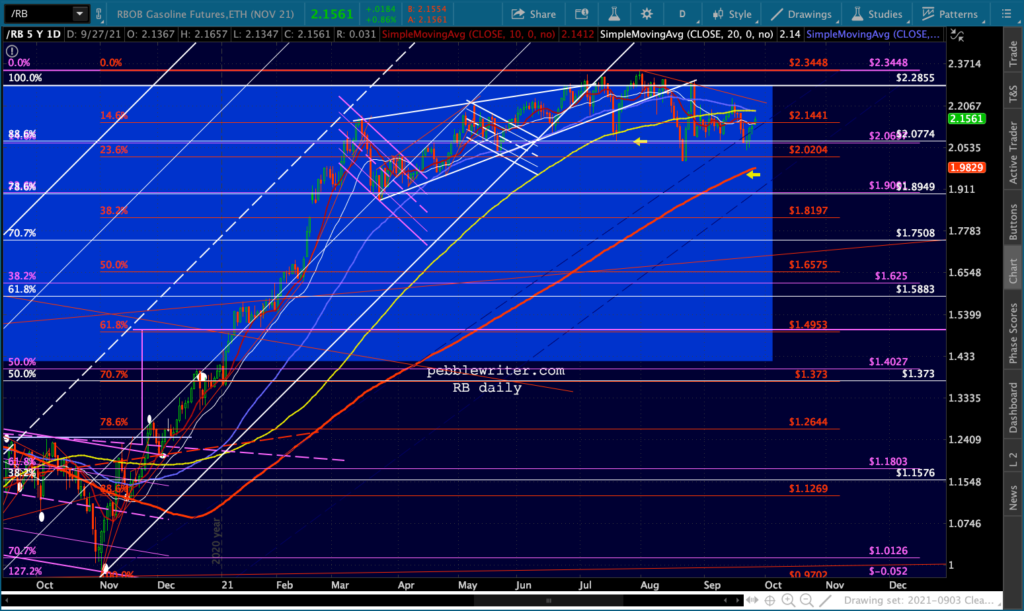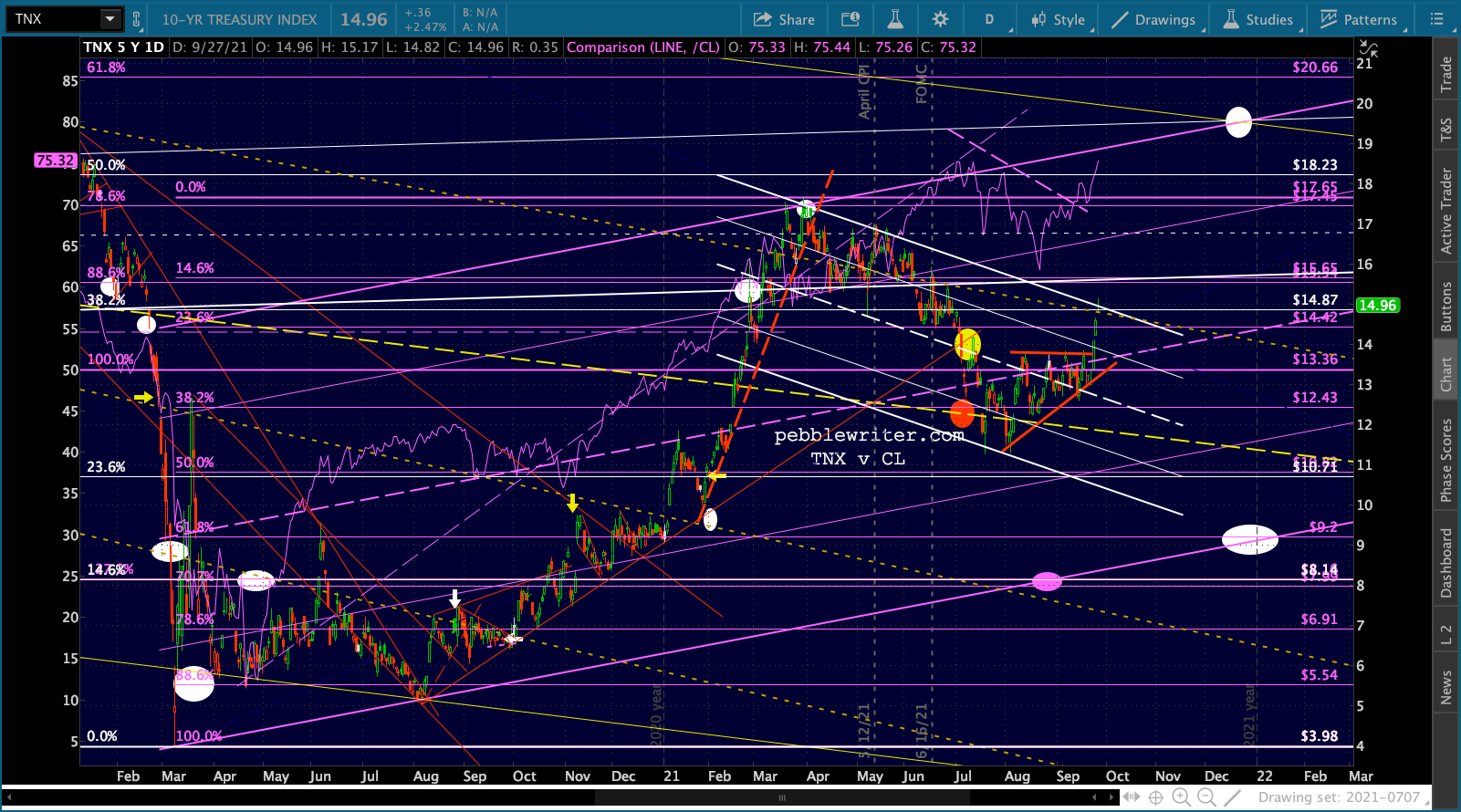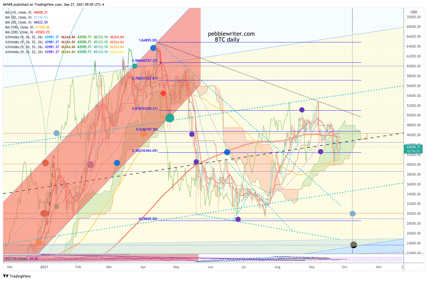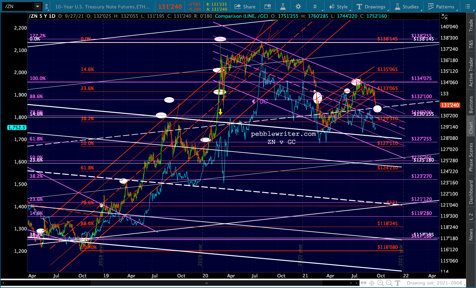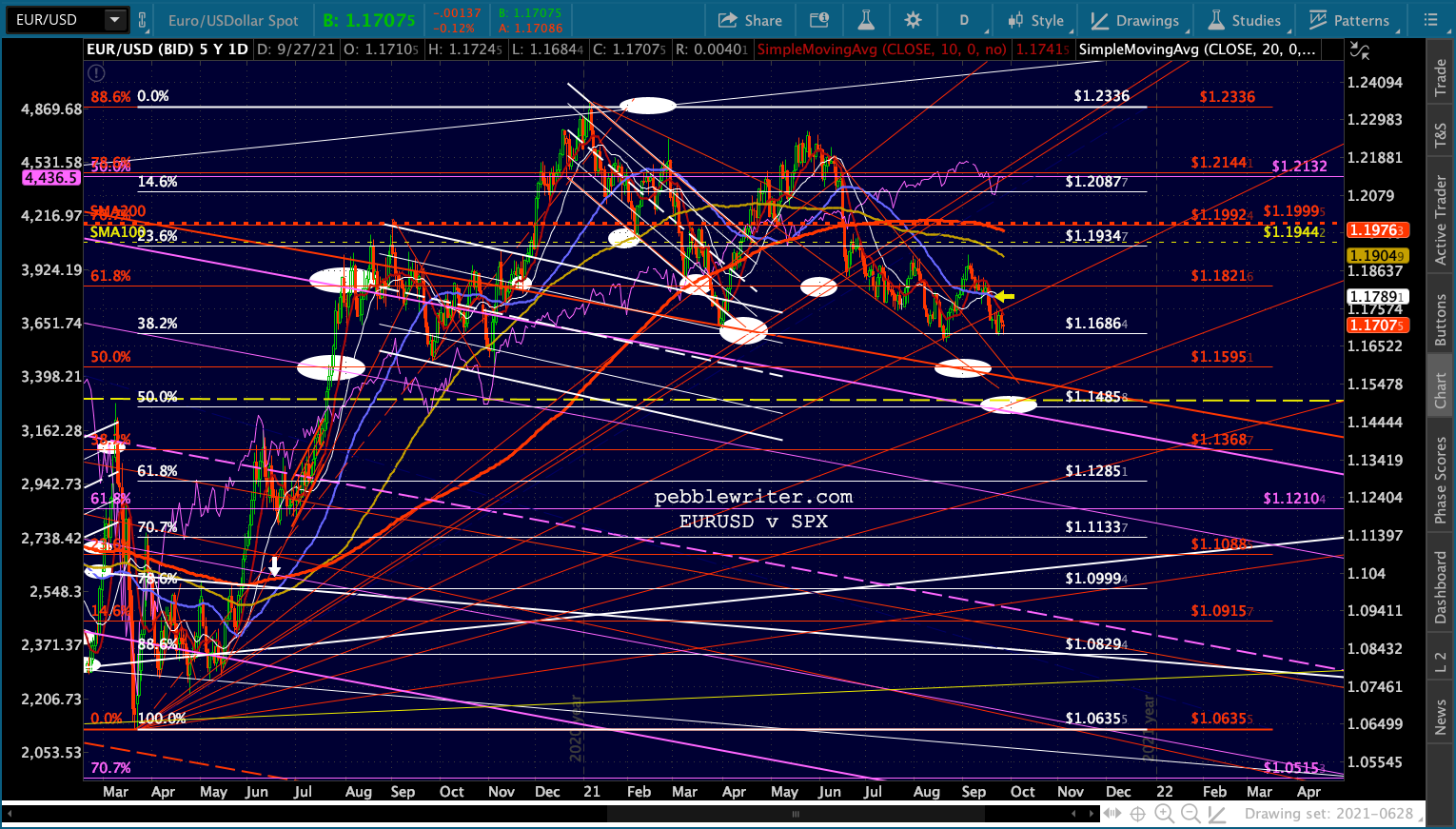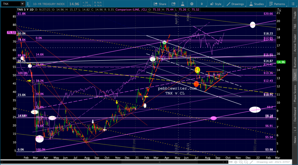 The equity situation hasn’t changed other than the recent overshoot on bounces in SPX and ES. The implication is that the rising yellow channel has been rejoined and its bottom backtested. By the end of the day, the rising red TL from the Sep 20 lows and SMA10 (4417) are likely to be tested.