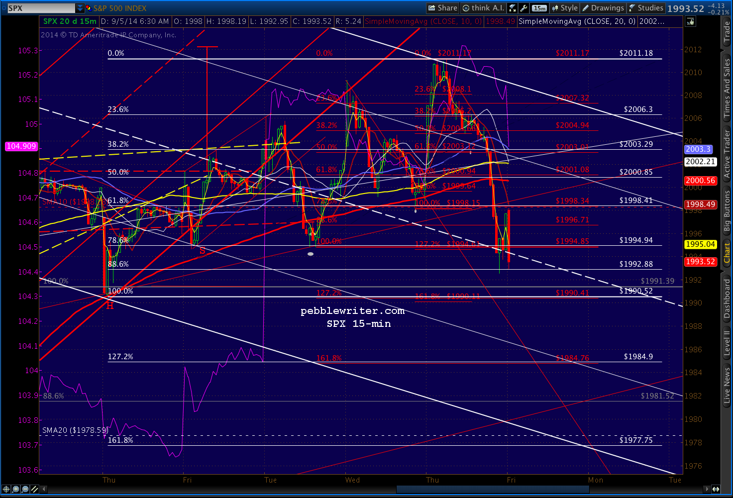 Futures spiked 10 points on the crappy jobs data, then promptly gave most of it back. Key chart factors: yesterday’s late day plunge further distanced stocks from the rising white channel. The backtest we surmised would lead to a decline seems to be underway, but not without a fight from the algos — characterized by three backtests (so far) of the purple channel. Yesterday’s downside target remains in play until stocks climb back into that channel and stay there.
