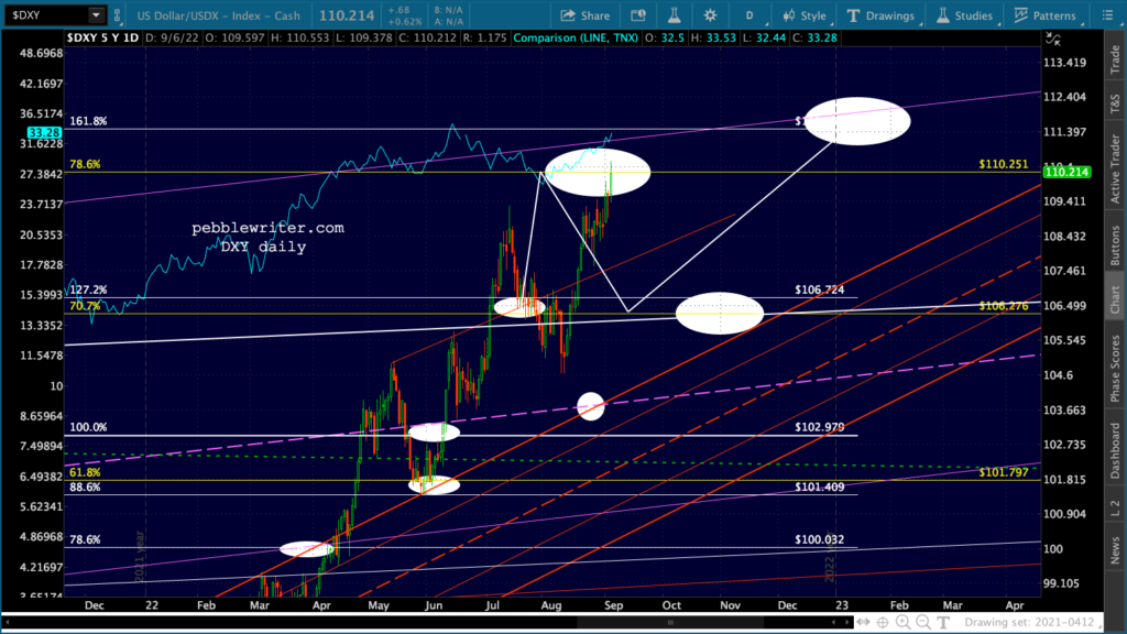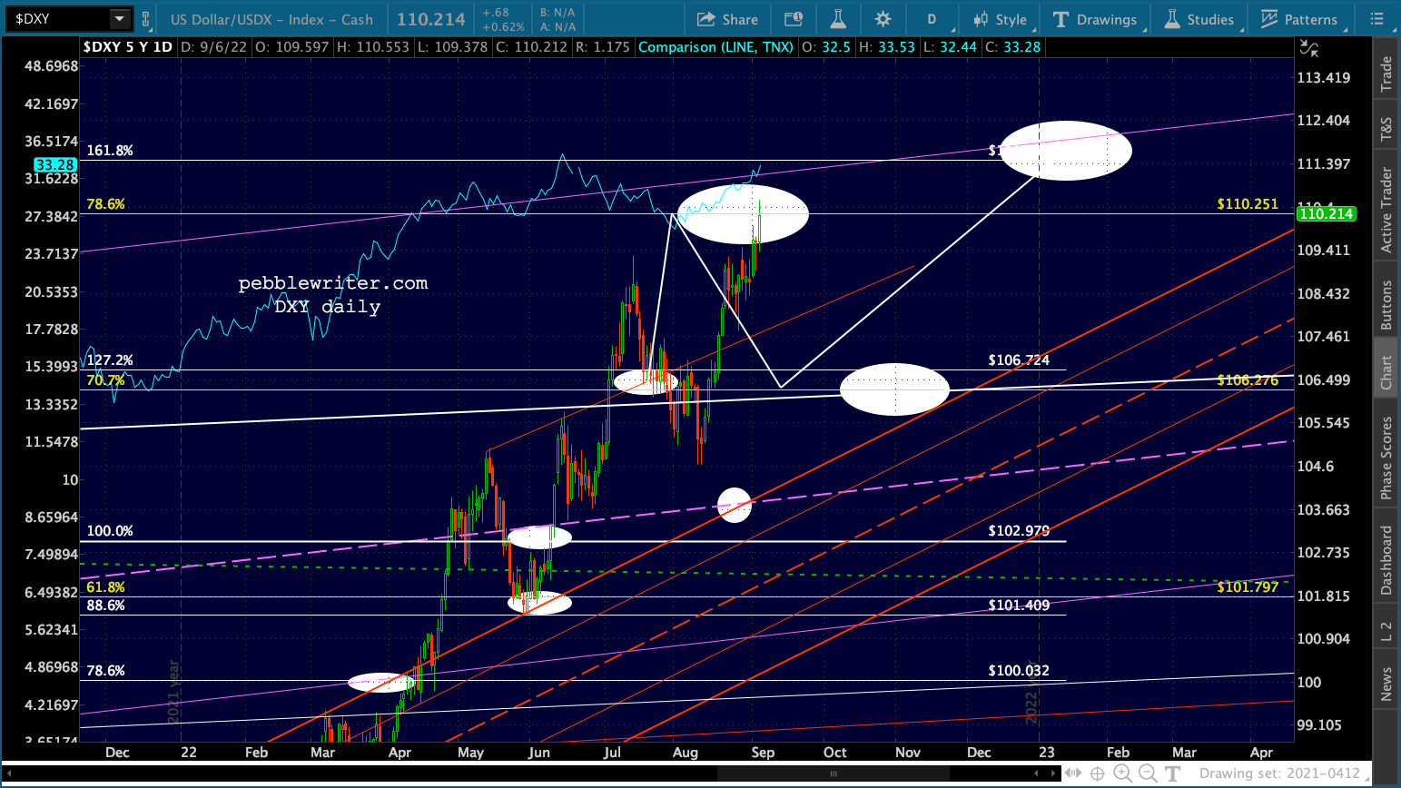 Currencies are split, with USDJPY currently trading through the 161.8 and EURUSD struggling to hold support. DXY has officially reached our 110.251 target.