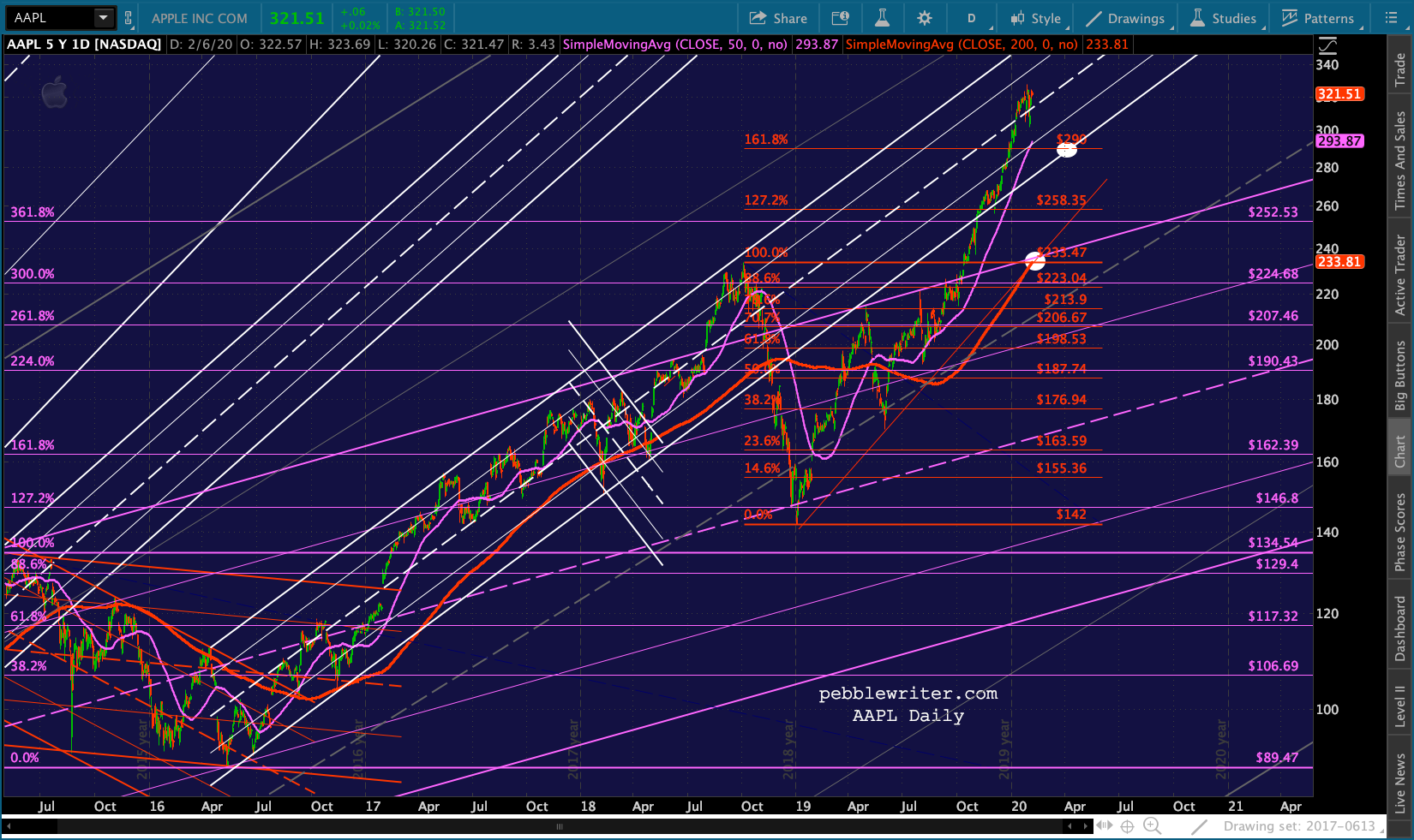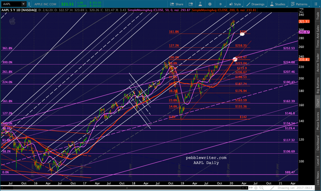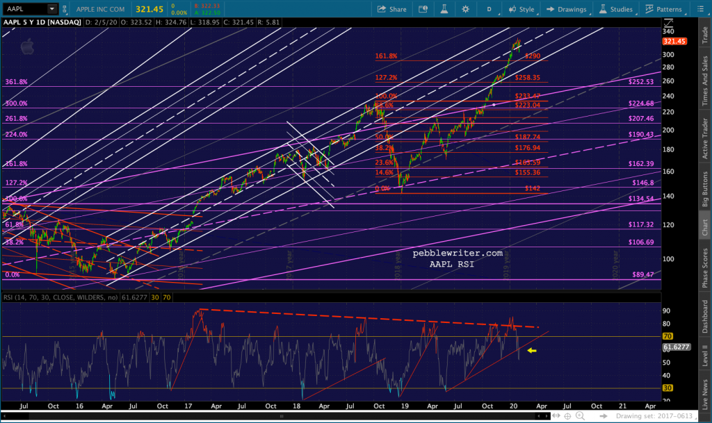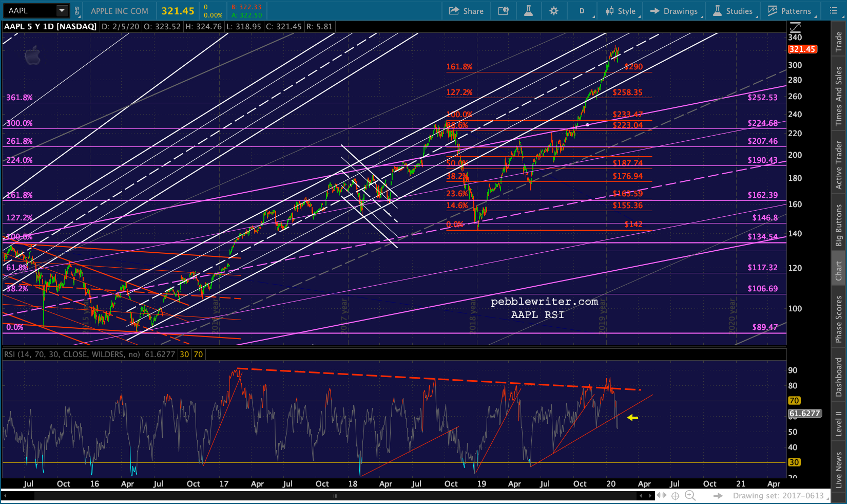 Now, for a very interesting chart. AAPL has obviously been on a tear lately – with some pretty crazy Fib and channel action. Looking at the RSI, though, we can see not only negative divergence but an breakdown of the rising TL from Jun 2019.