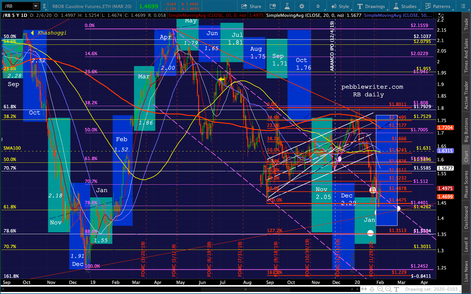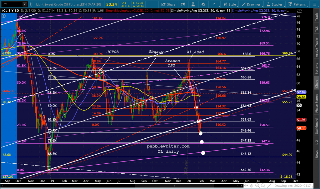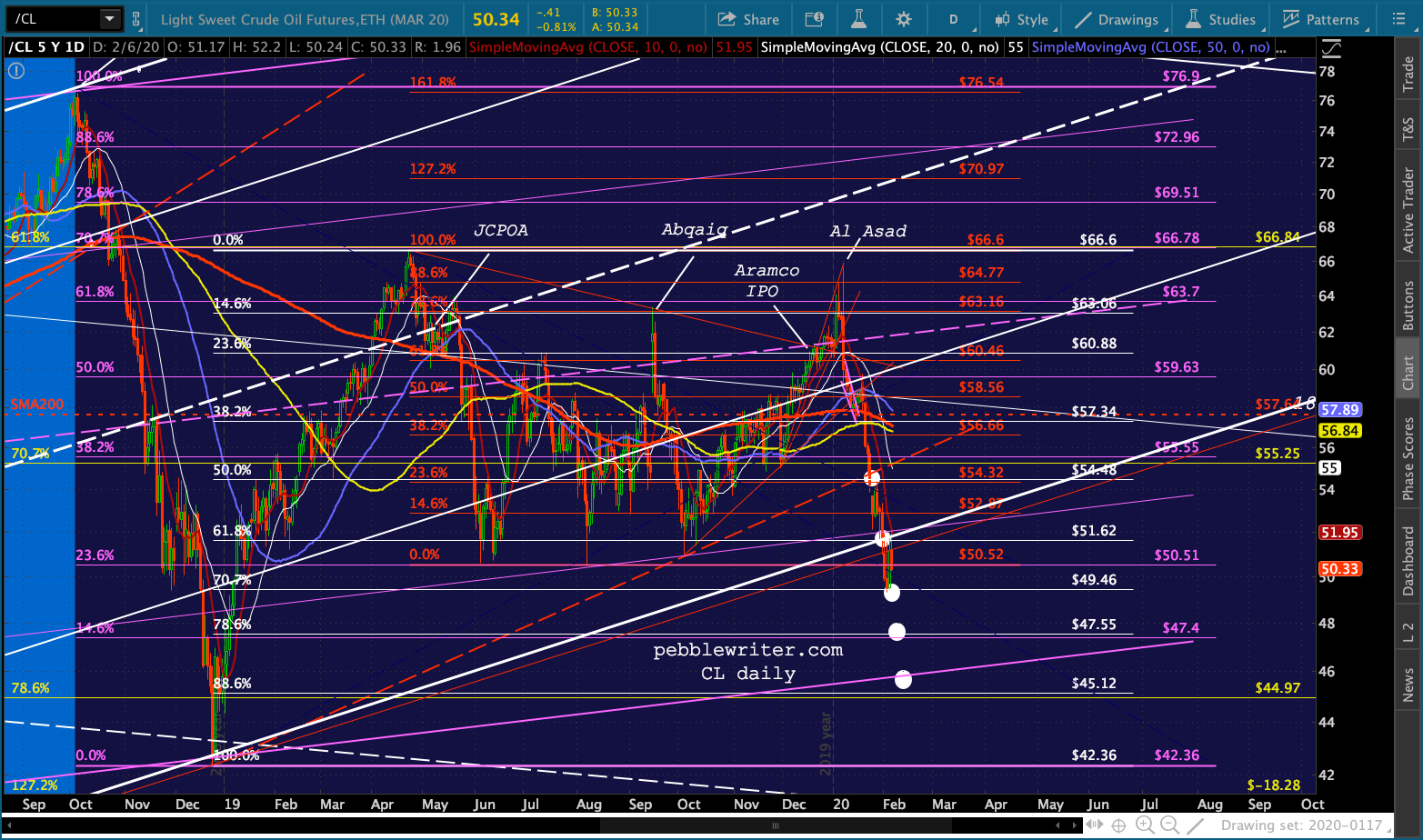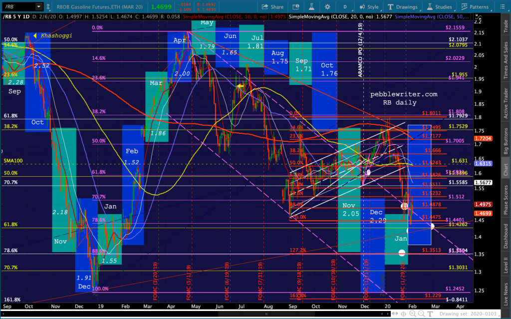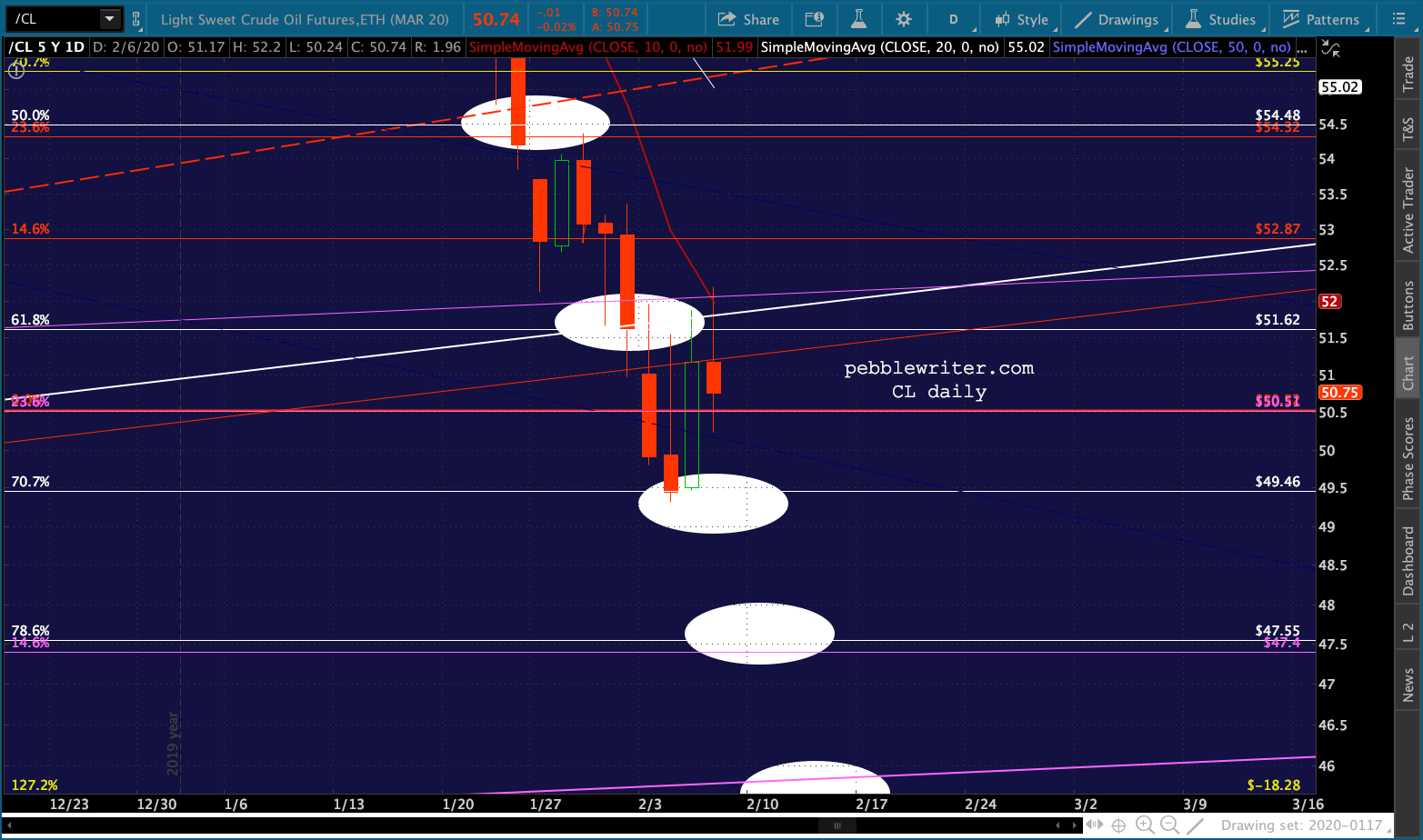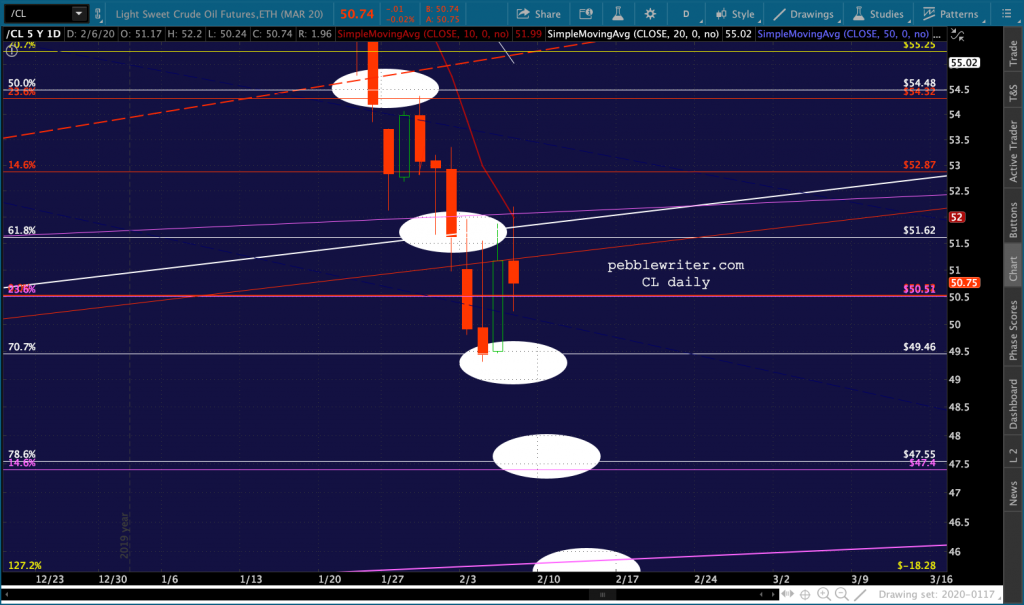 In the oil markets, CL got a nice bounce off our 49.46 target on 2/4, but ran into the SMA10 and a backtest of the white channel and is leaking lower.