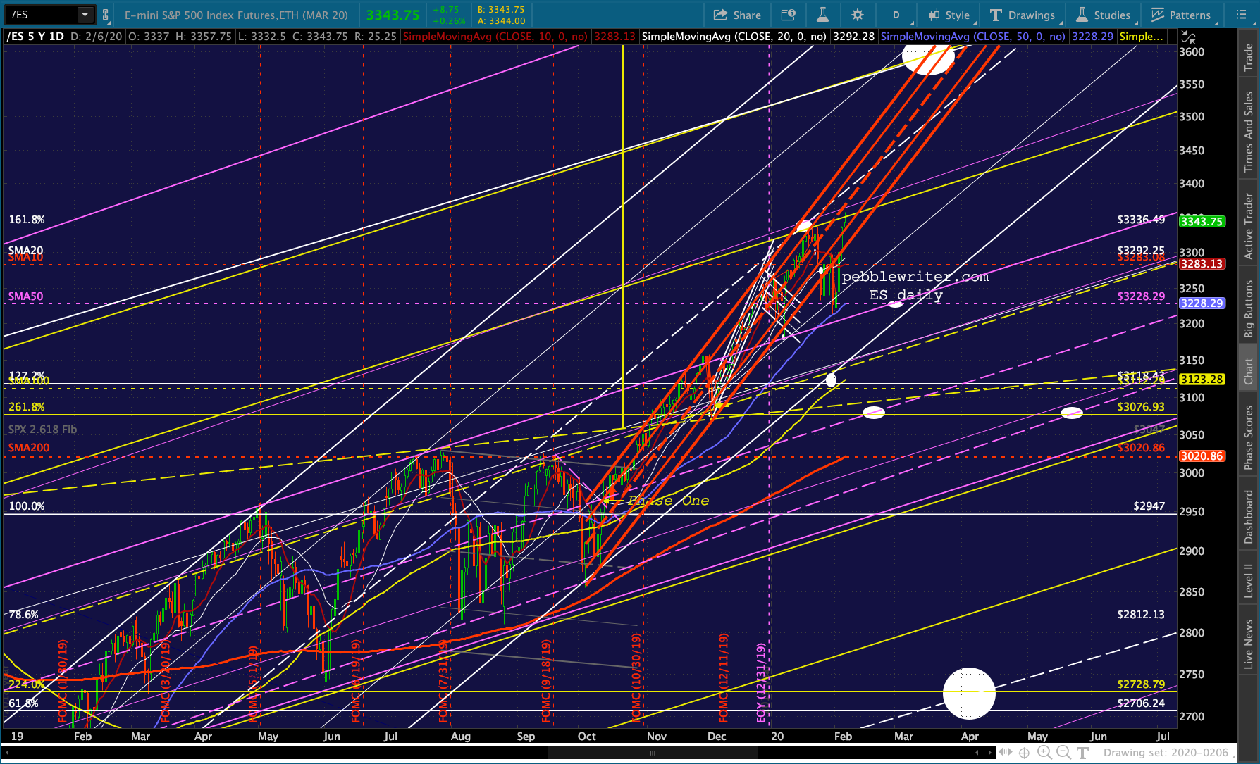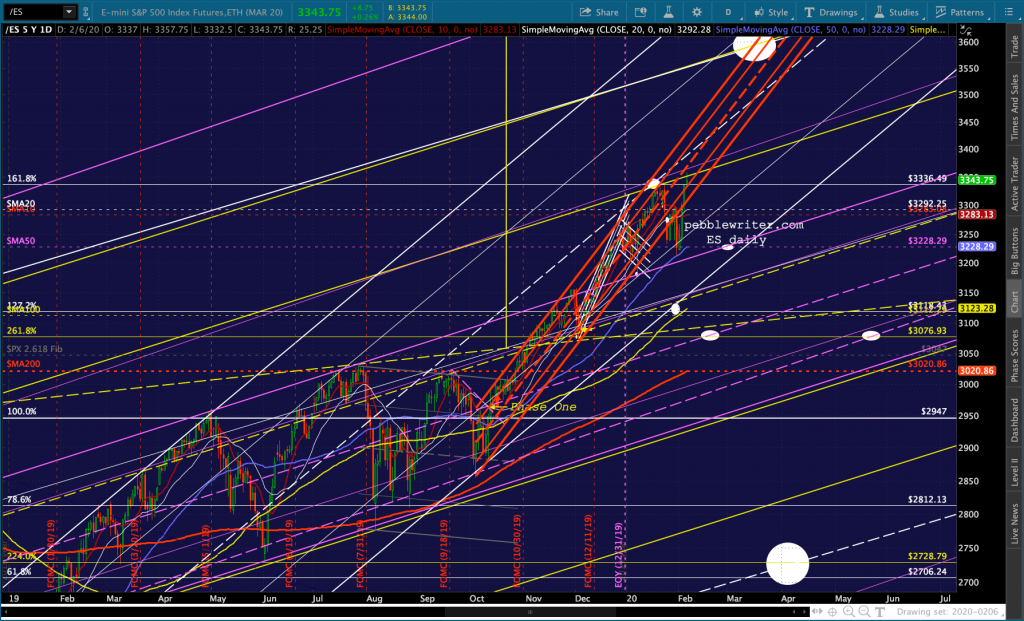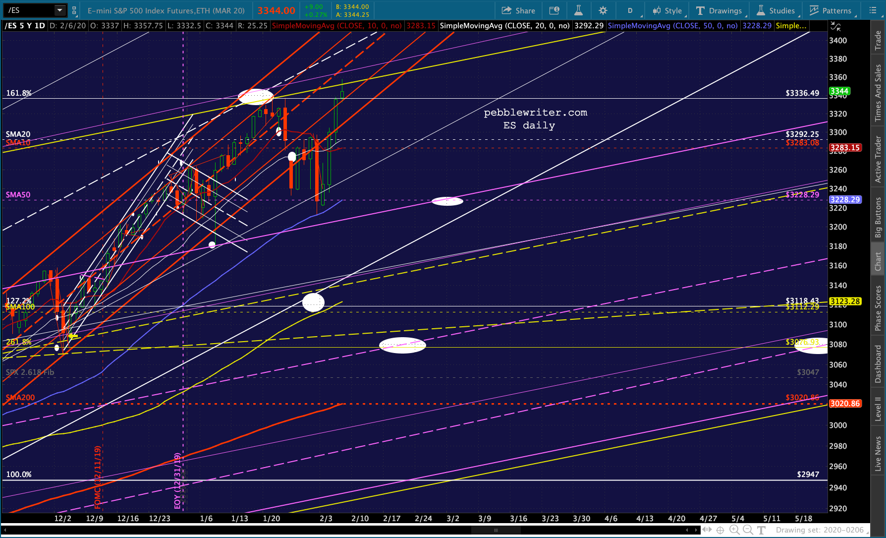 The yellow channel .786 line is around 3341. If ES is unable to breakout, then this opens up the yellow midline currently near the SMA100 at 3123.19.
