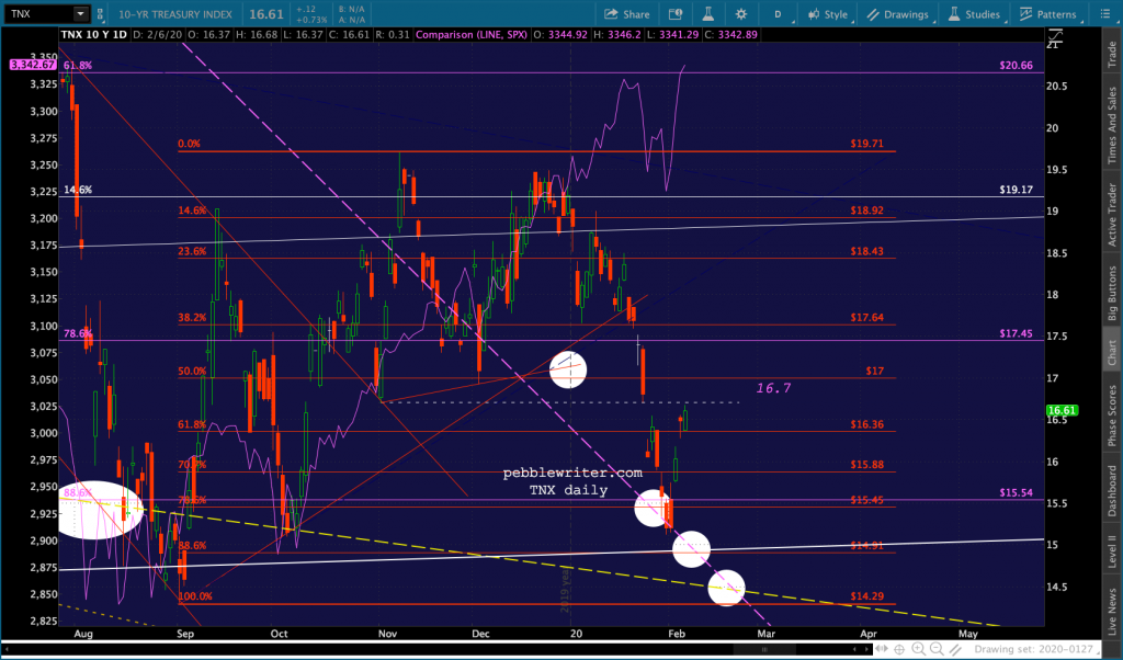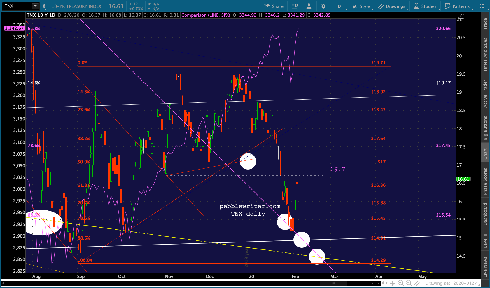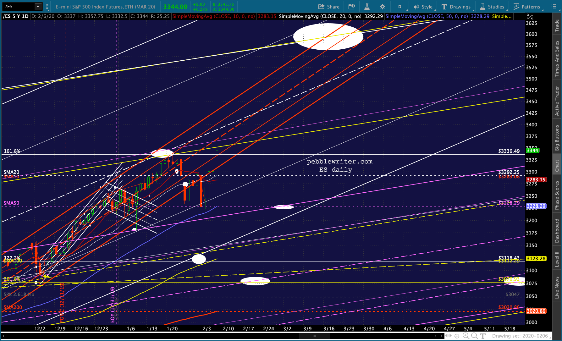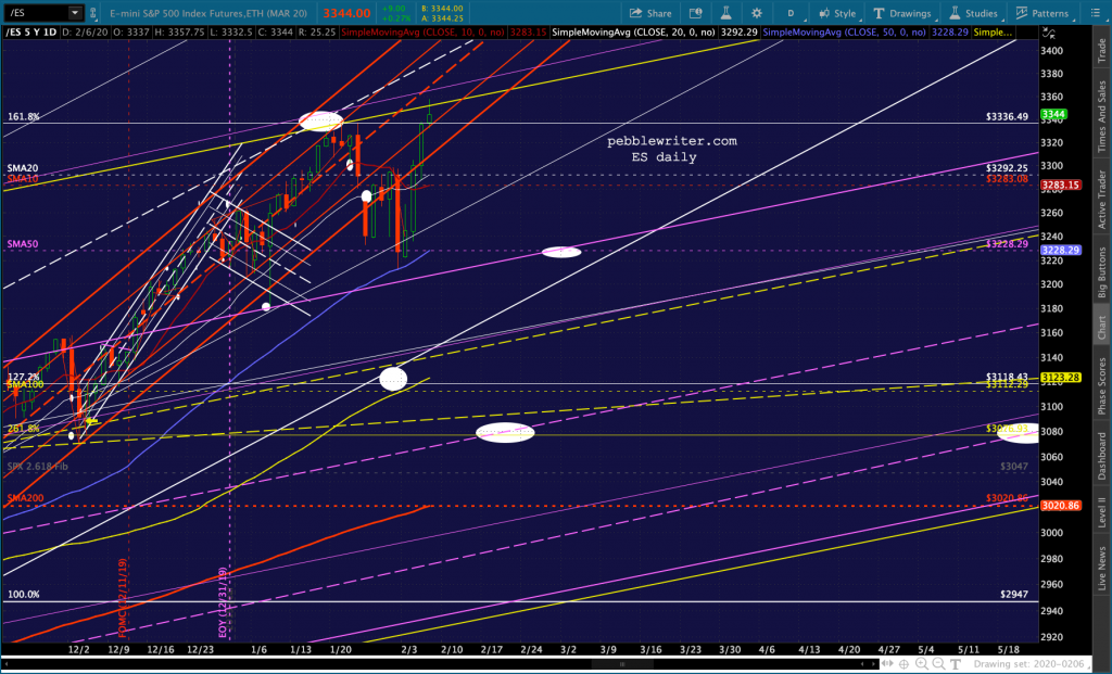At the very least, ES should backtest the 1.618 it just broke through. If 3336.49 doesn’t hold, we’re looking at the red channel bottom – the channel ES broke back into after breaking down – at around 3310. If it breaks down again, then the purple channel backtest – where it intersects with the SMA50. And, so forth.