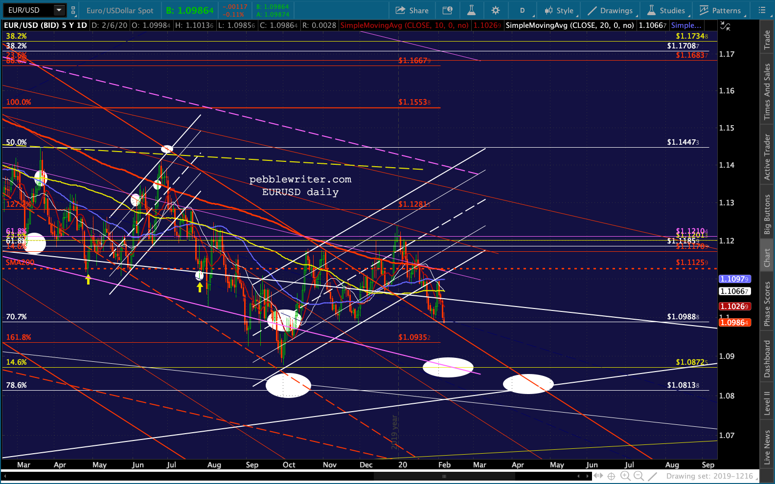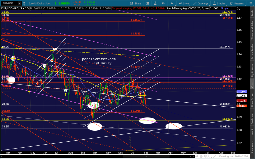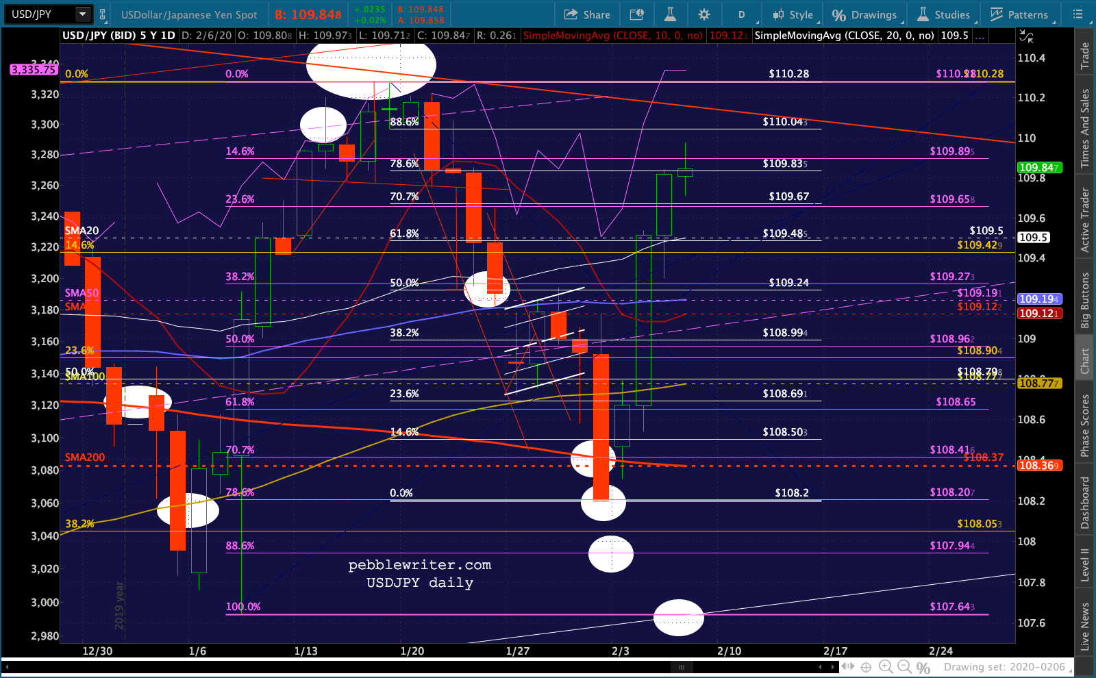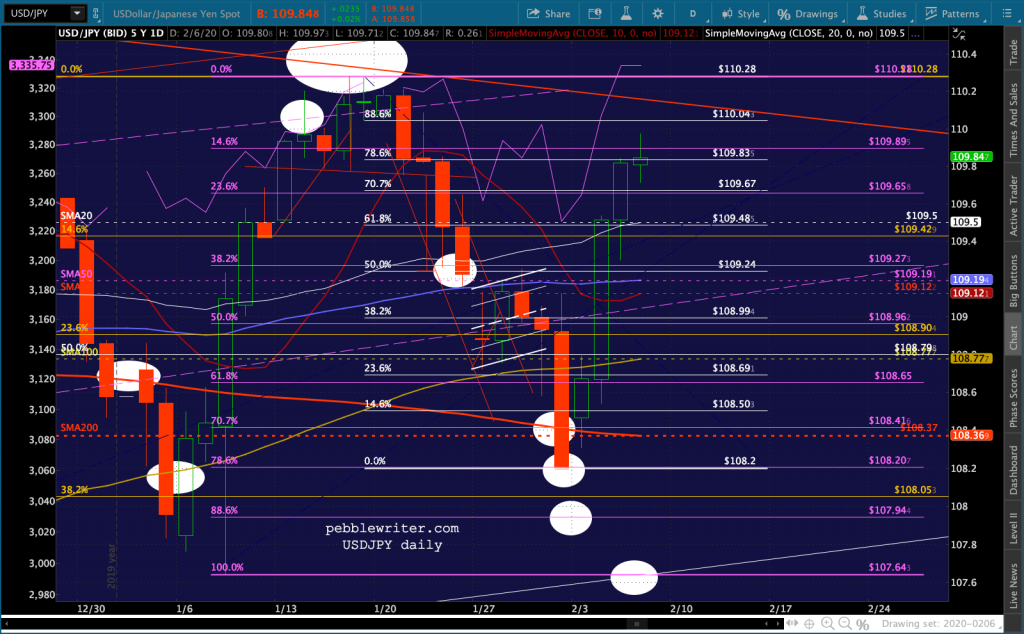 The factors still favor the downside case here. On the currency front, USDJPY is running into the .886 Fib and the red channel top again. The next major move should be lower. But, a breakout above 110.28 would be quite bullish for stocks.