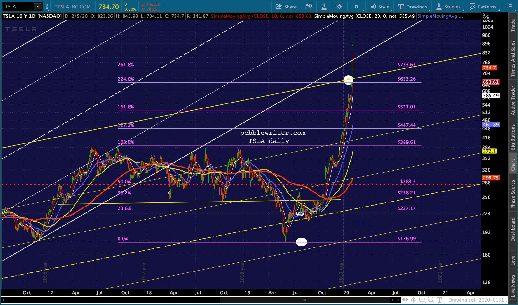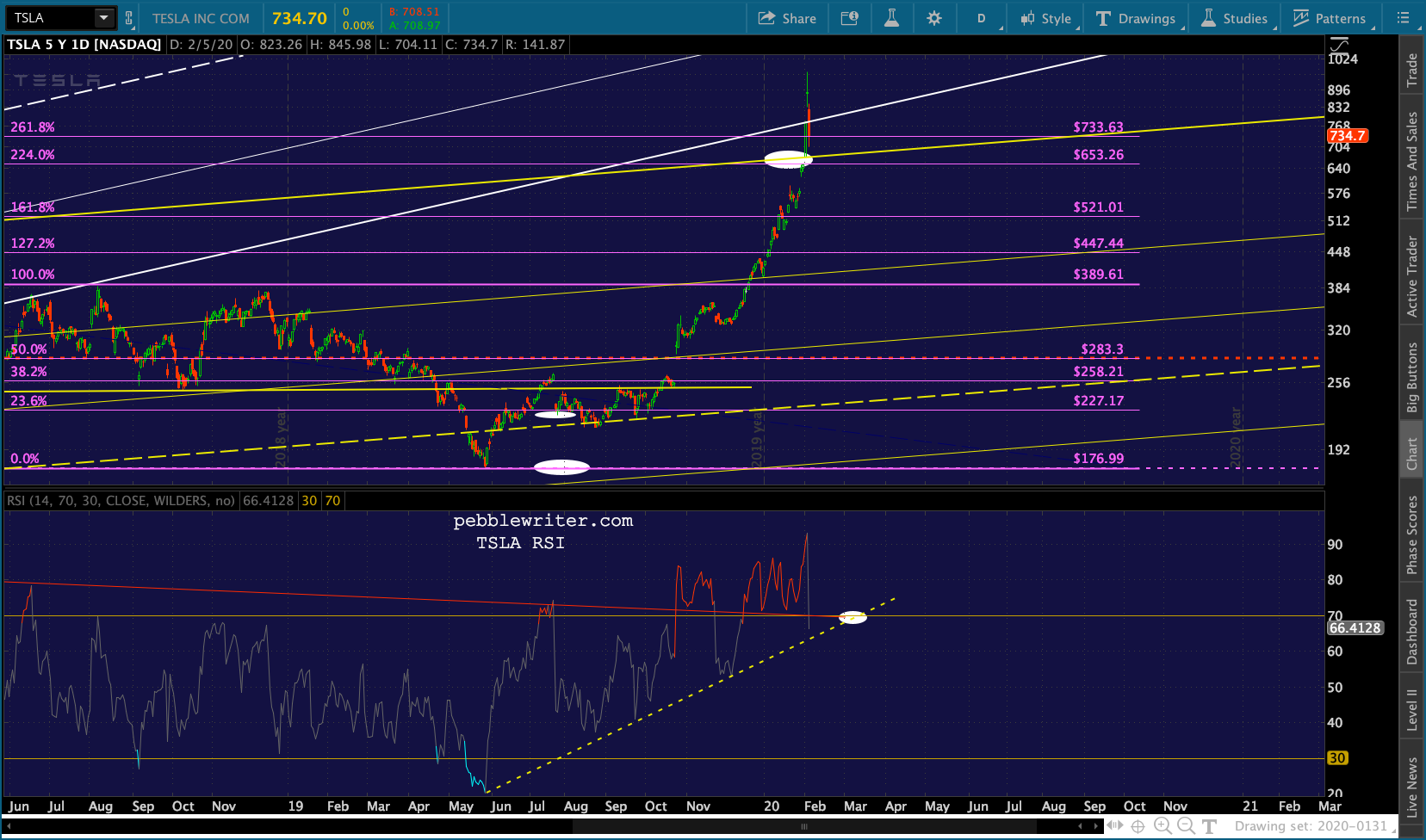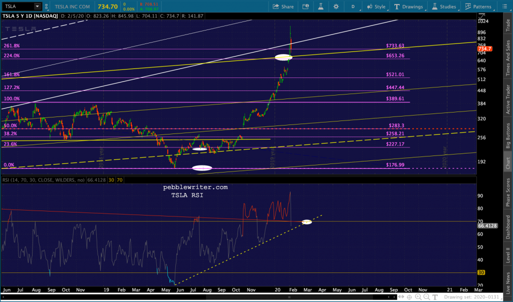 …and its RSI is barely hanging on to TL support. Its SMA10 is now up to 705 – right at the channel top. If TSLA should break below it, watch out. It could be quite a tumble.
