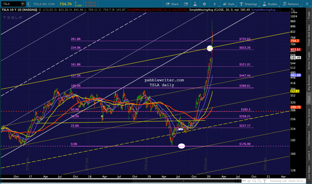 Last, TSLA saw a ridiculous short-covering rip over the last few days. The spurt was due to a breakout of the yellow channel top at the 2.24 Fib extension. It is now backtesting those levels of previous resistance (now support)…
