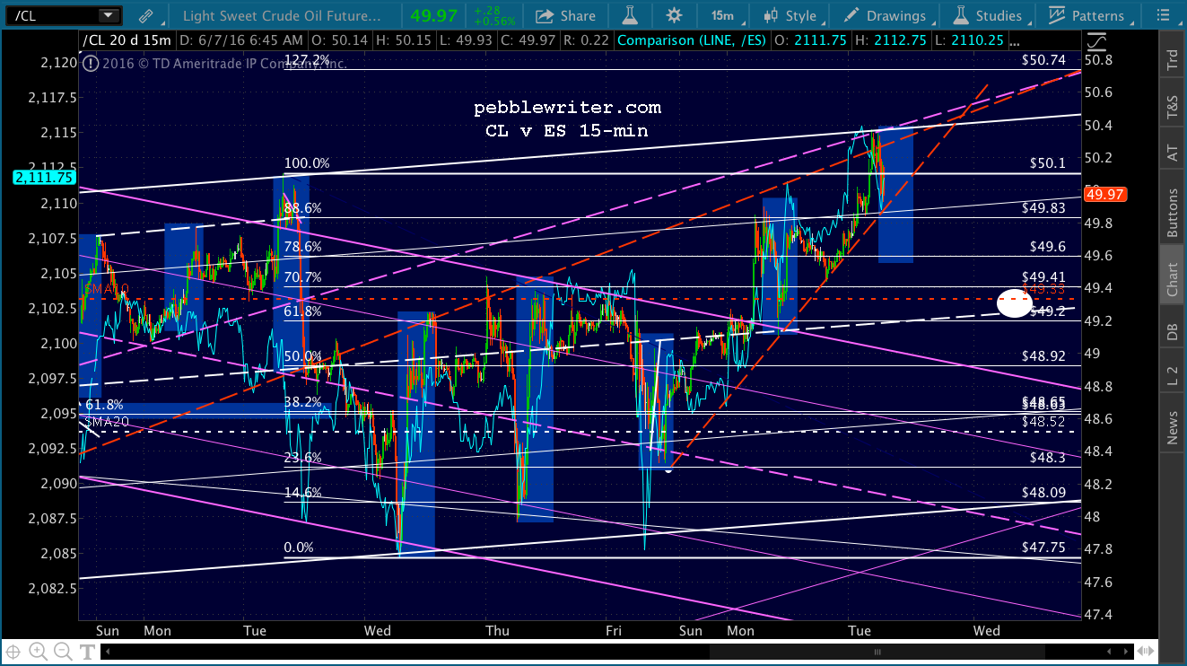 A close up of CL v ES shows just how tightly the two have been intertwined over the past few weeks. While the white channel’s rise has been gentle compared to the steep purple channel, CL’s daily rallies have been timed well enough (purple shading) to keep stocks on the rise during market hours.