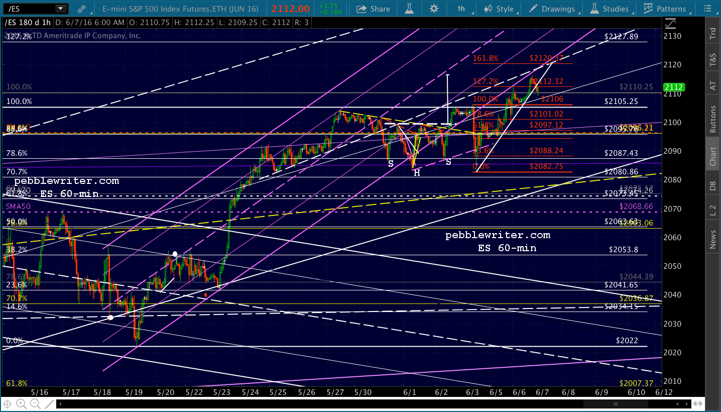 I would put today’s SPX target at the 1.618 at 2116.78, also the top of the little megaphone pattern. If it breaks out, the next upside target is 2128.86, which is also the top of the (ever so slightly) falling purple channel from the 2134 highs in May 2015.